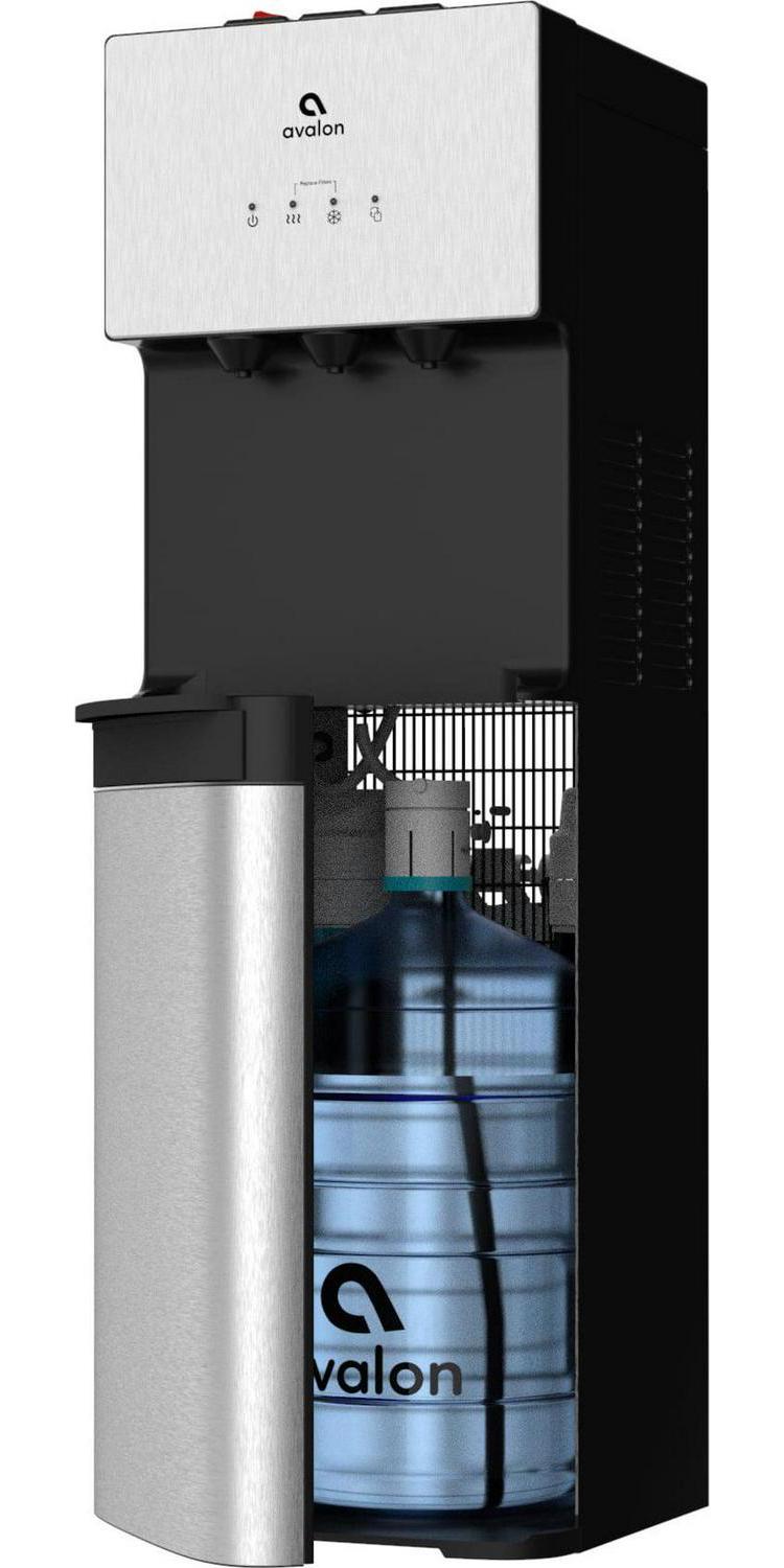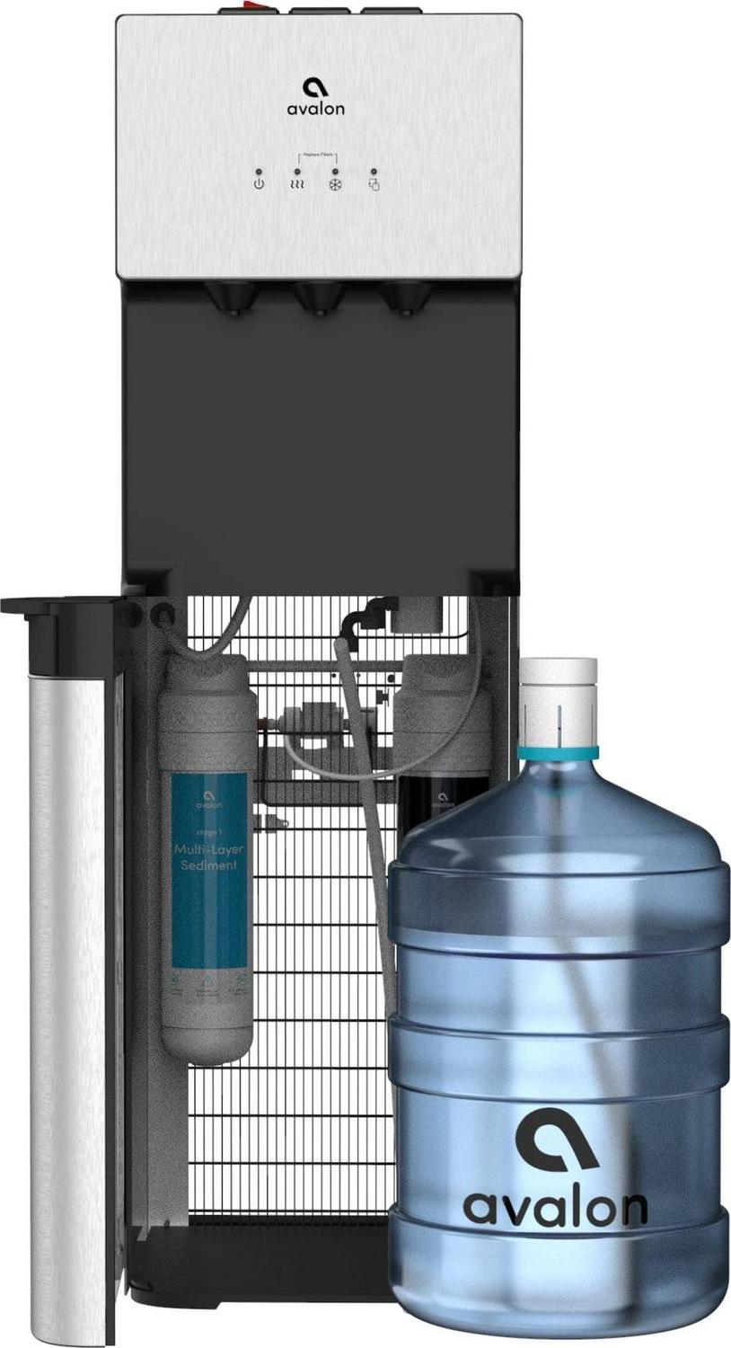 – This water cooler is bottom loading with a 5-gallon refillable bottle as well as Patented Dual filters are included with the water cooler. This consists of a Sediment filter (listed as model Avalon A5FILTER) and a Carbon Block filter (listed as model Avalon A4FILTER) which will last 6 months or 1500 gallons.