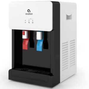 The Avalon Countertop Hot/Cold Water Cooler is made with innovation and style. The easy-to-use paddle spouts make it so much more convenient to use. The machine’s highly efficient compressor makes the cold water crisp at approximately 47° F. The hot faucet is hot enough to cook one’s tea or coffee or any other steaming hot beverage at approximately 185° F. Due to the boiling water, we’ve added a child safety lock on the hot water faucet. This water cooler is bottle-less with an NSF-certified activated carbon filter and a sediment filter with a water line that can be attached to your water source. The dispensing area is 10×2. 5×9. 5 inches with 7. 5 inches of space below the spouts. The water cooler is UL-listed and complies with all standards of Energy Star. Setup is easy and the unit can be connected directly to your existing sink water line. All parts necessary for installation are included. The unit dimensions are 12x12x19 inches.
