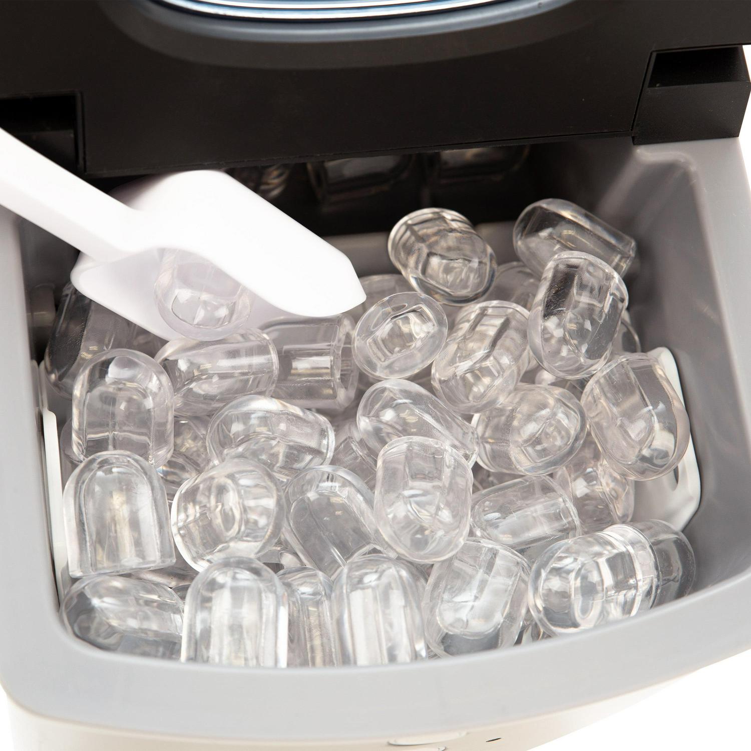 The Avanti Portable Countertop Ice Maker produces up to 33 pounds of ice daily, so you always have a supply of ice on hand. This compact ice maker is ideal for kitchen countertops as well as outdoor patios, offices, break rooms, dorms or anywhere you need extra ice. It’s easily portable and quickly produces a batch of ice in just 9 minutes, making it perfect for events and entertaining. The countertop ice cube maker produces both small and large ice cubes to suit your needs. The unit features easy-to-use digital touch controls. It has indicator lights for both ice and water levels, so you can easily monitor your ice and know when to refill the water reservoir. The self-cleaning function ensures clean and fresh-tasting ice every time, and the included ice scoop makes it simple and sanitary to scoop ice cubes. The black ice maker complements any decor. Covered by the Avanti One-Year Limited Warranty.