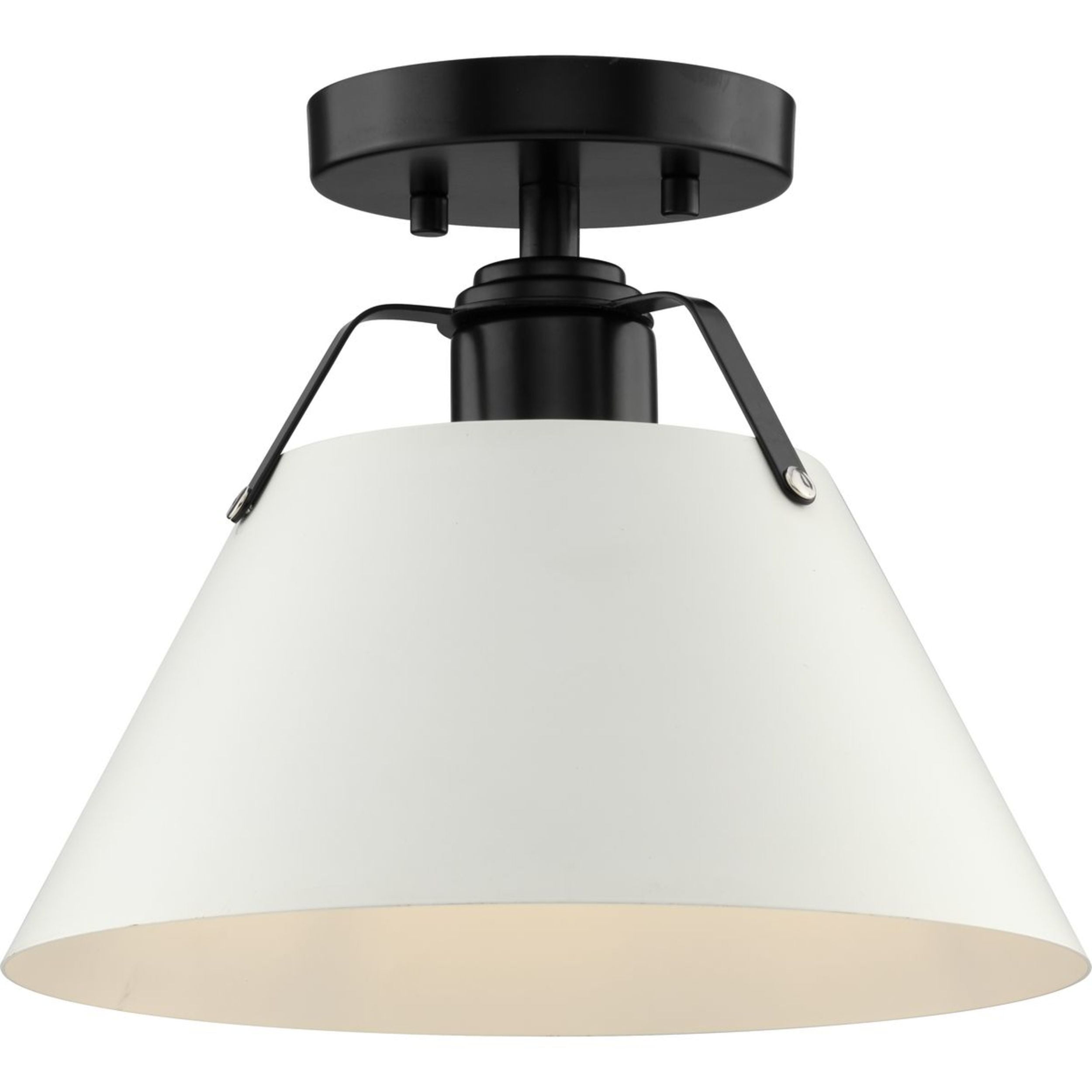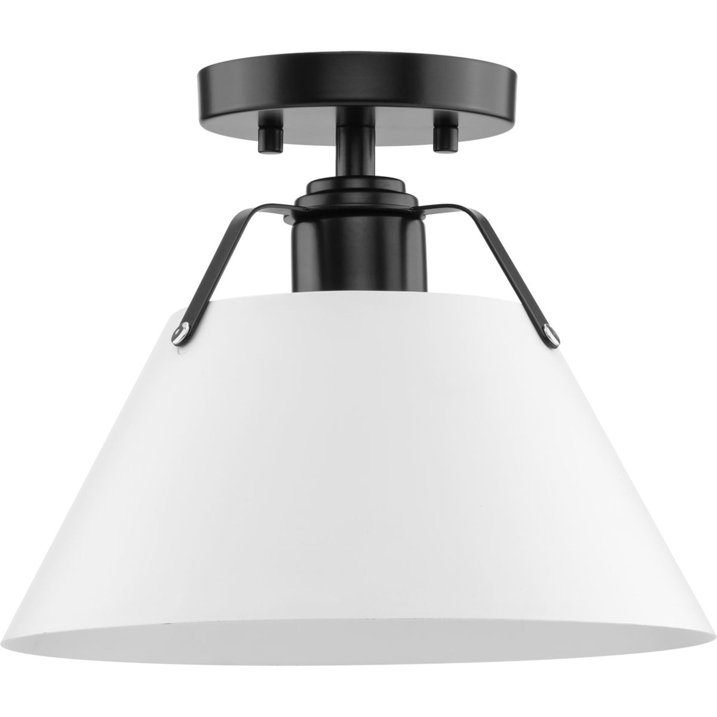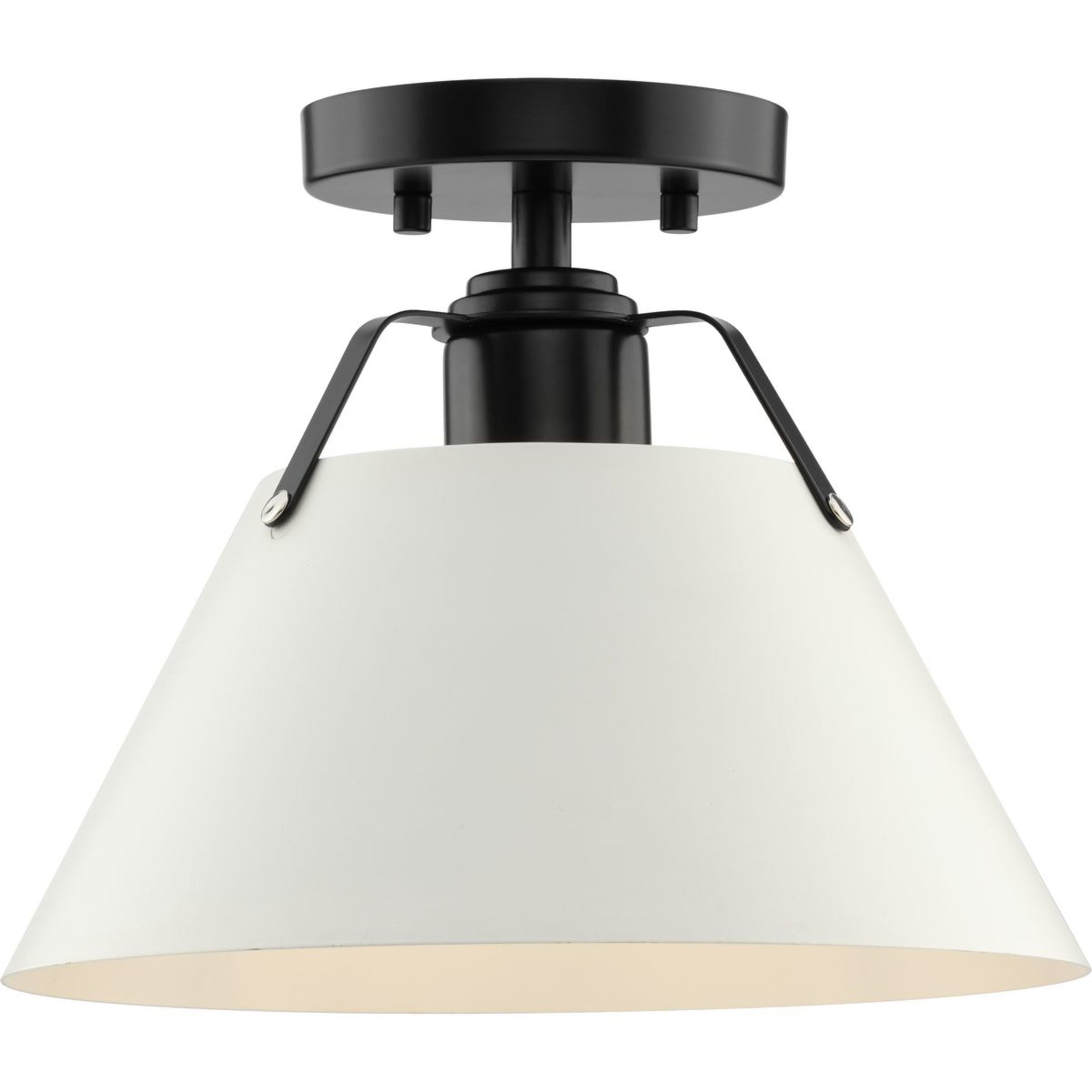 Casual modern farmhouse flush mount ceiling fixture in matte black with white metal shade. Ideal for bedrooms, hallways, and inviting foyers. Measures: 11.125 in dia., 7.625 in height Requires one medium base bulb, 60W (not included) This fixture offers dimmable functionality with the use of a compatible dimmer switch (not included) and dimmable bulbs (not included). cULus Damp Location listed, allowing the fixture’s safe use in spaces like bathrooms, powder rooms, or covered outdoor areas where moisture may be present. Our 1-Year Limited Warranty ensures your absolute satisfaction with your purchase and comes with dedicated professional after-sales customer service support.
