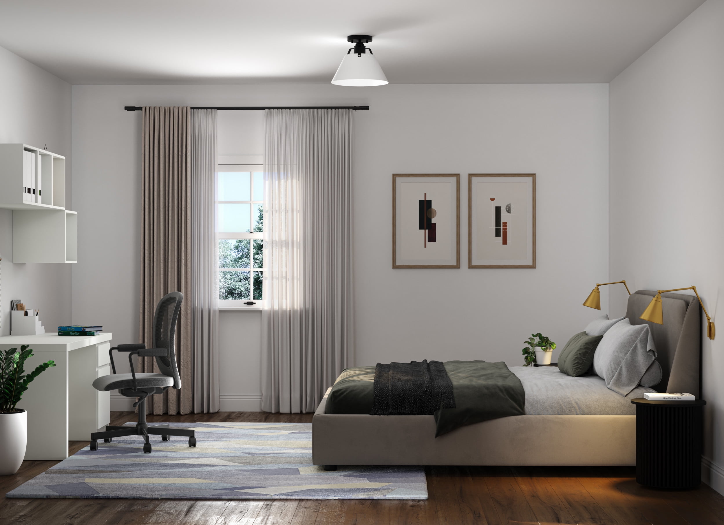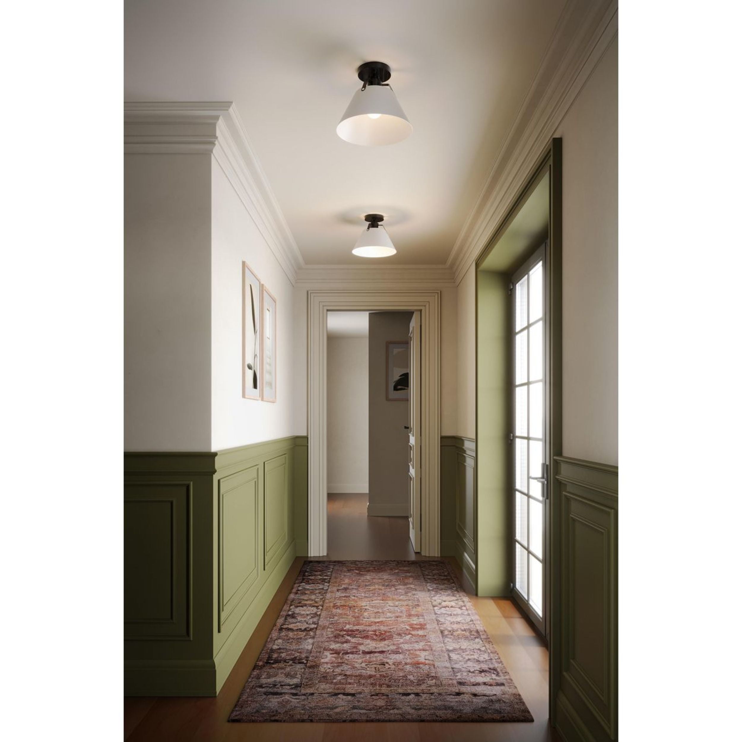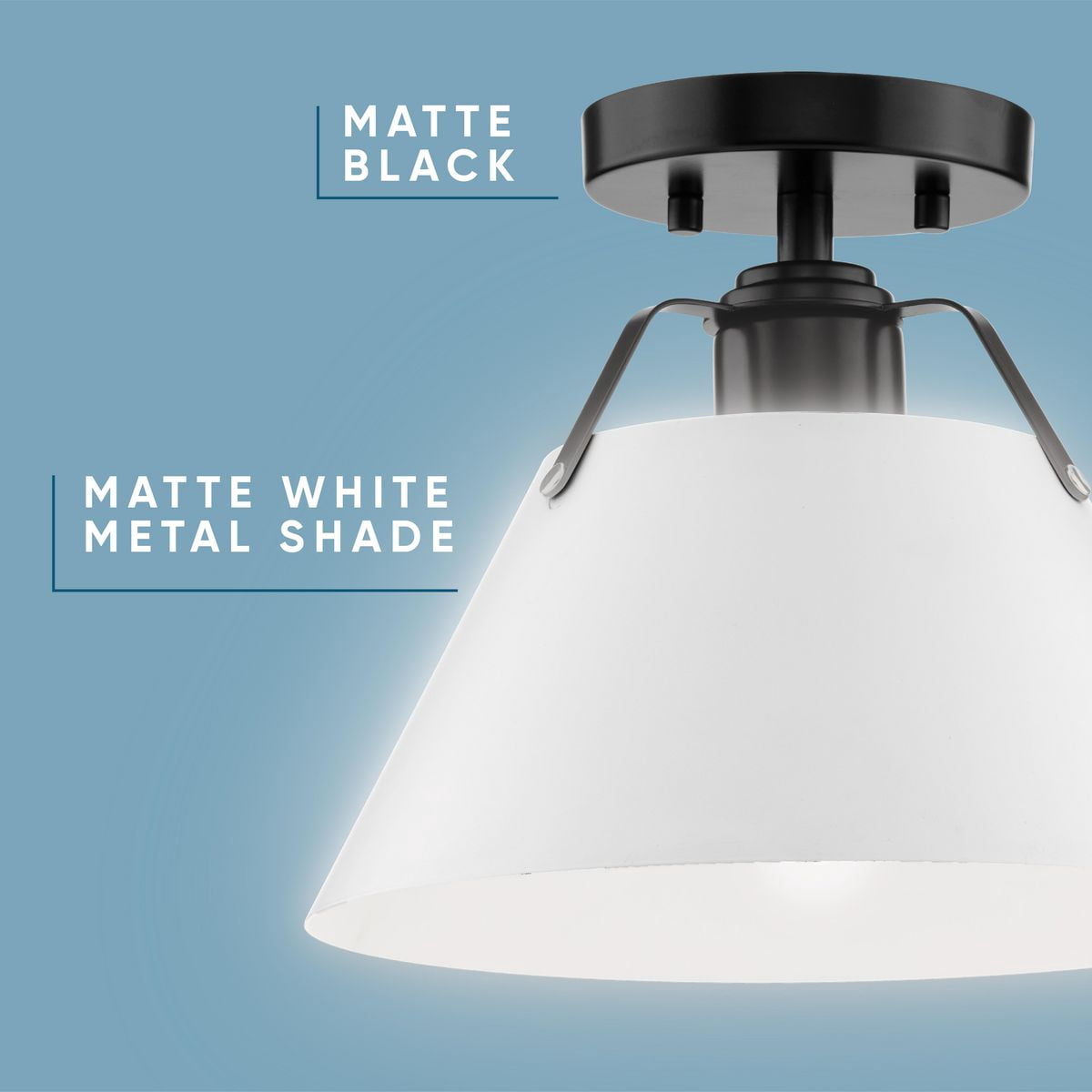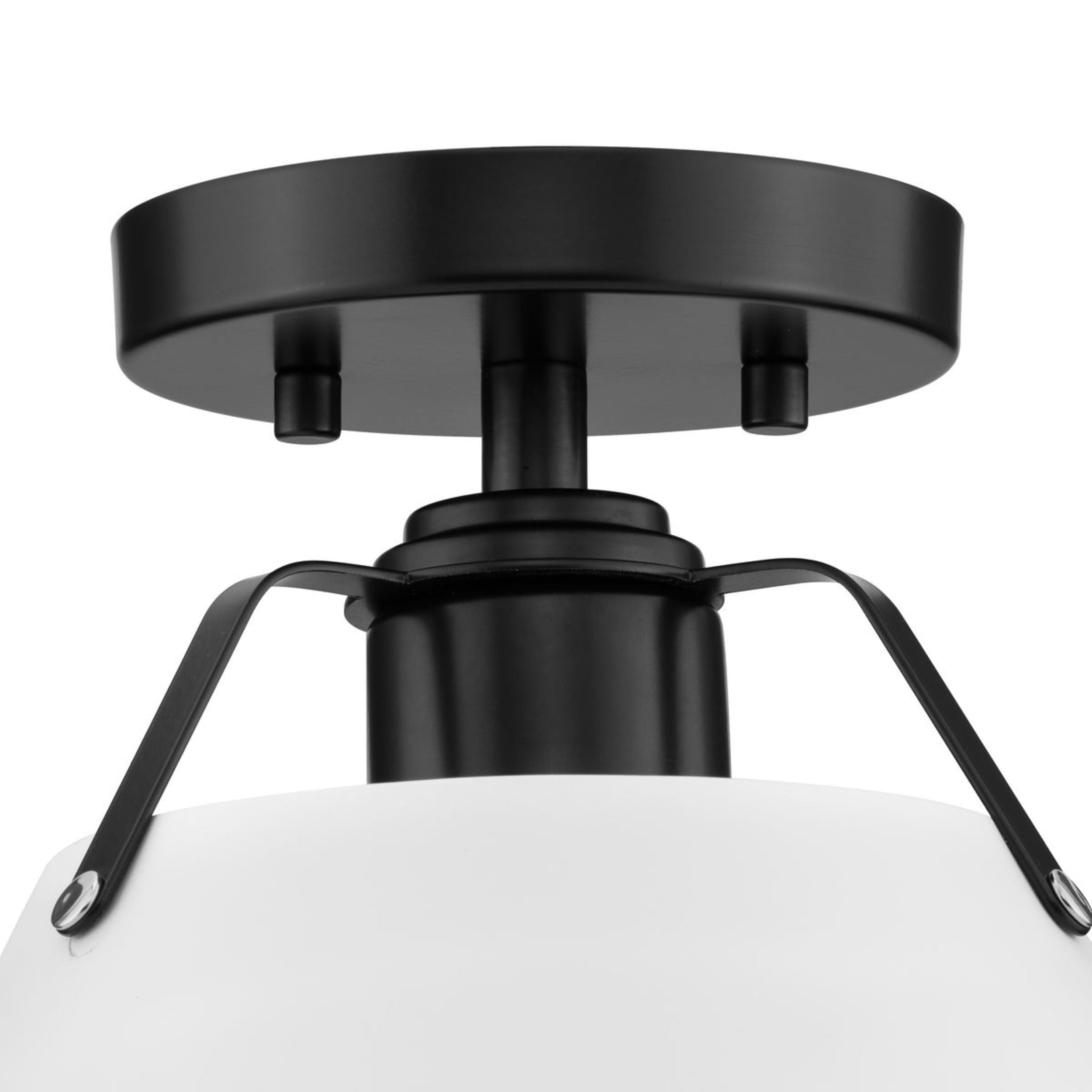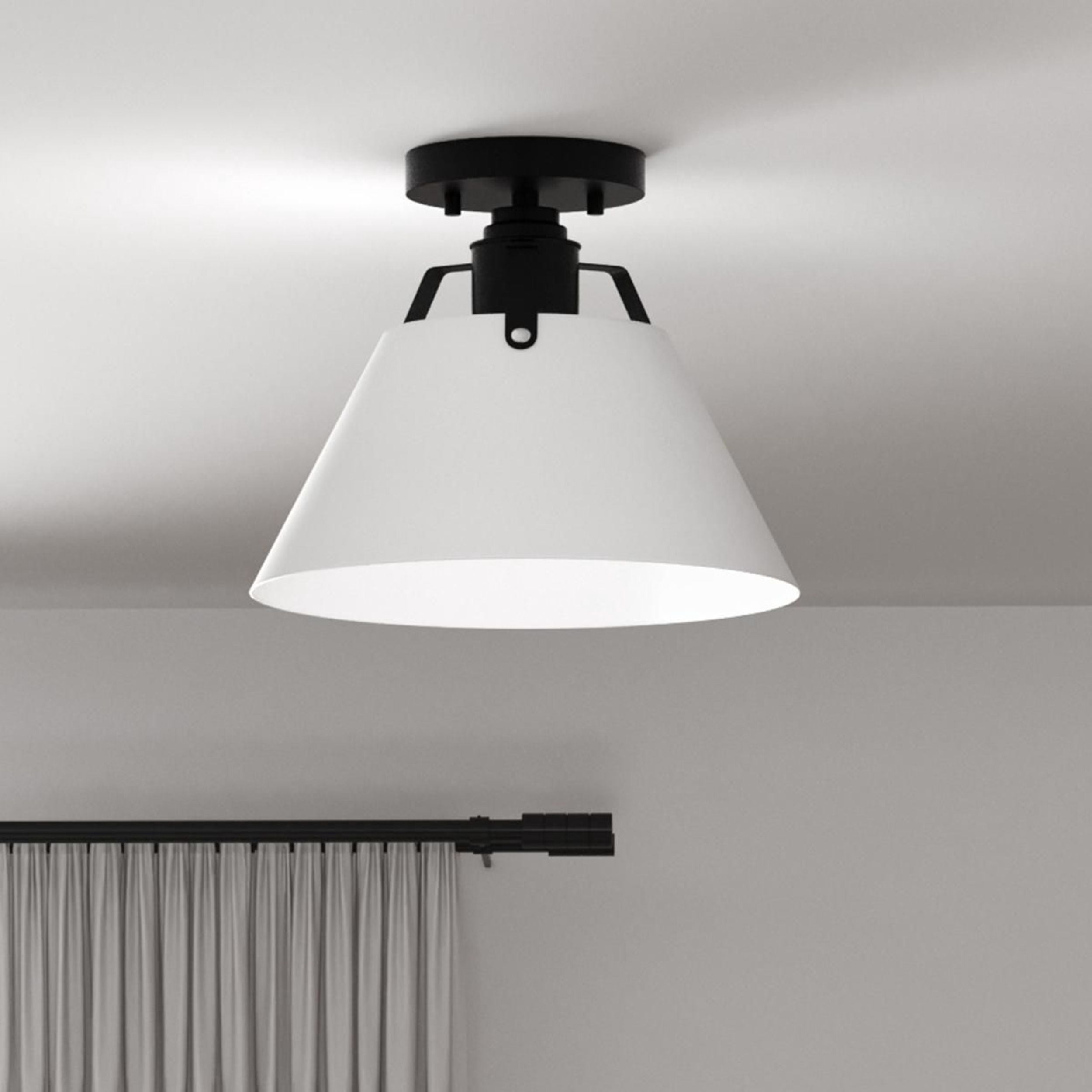 A focus on shape and clean lines makes the design elements of the Avery 1-Light Semi Flush Mount Ceiling Light feel essential and purposeful. Ideal for Modern Craftsman and Farmhouse interiors, the light’s architecturally styled frame is finished in Matte Black and features bent metal arms descending from a round canopy. A crisp white Metal shade conceals the light source while delivering a generous glow to comfortably illuminate your space.