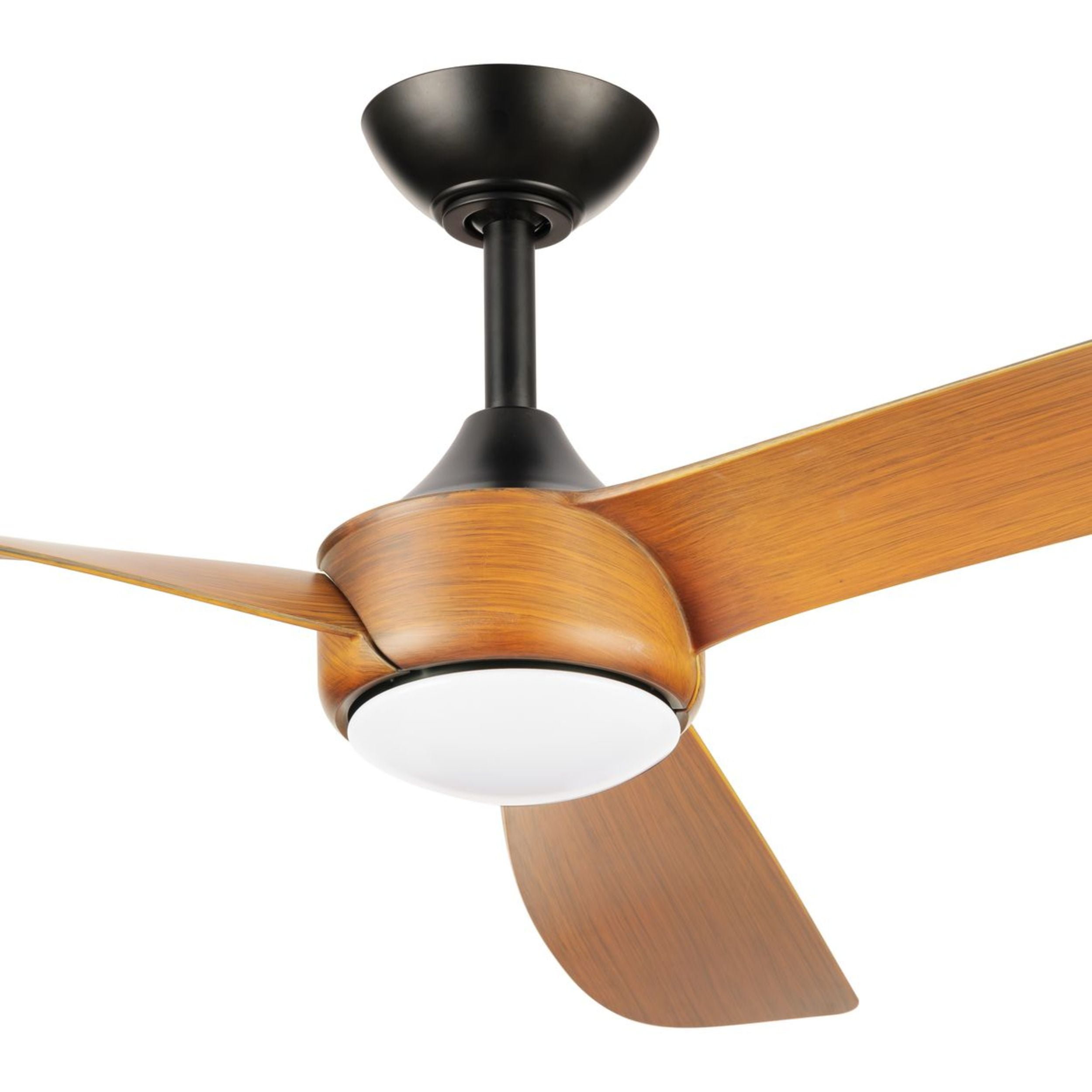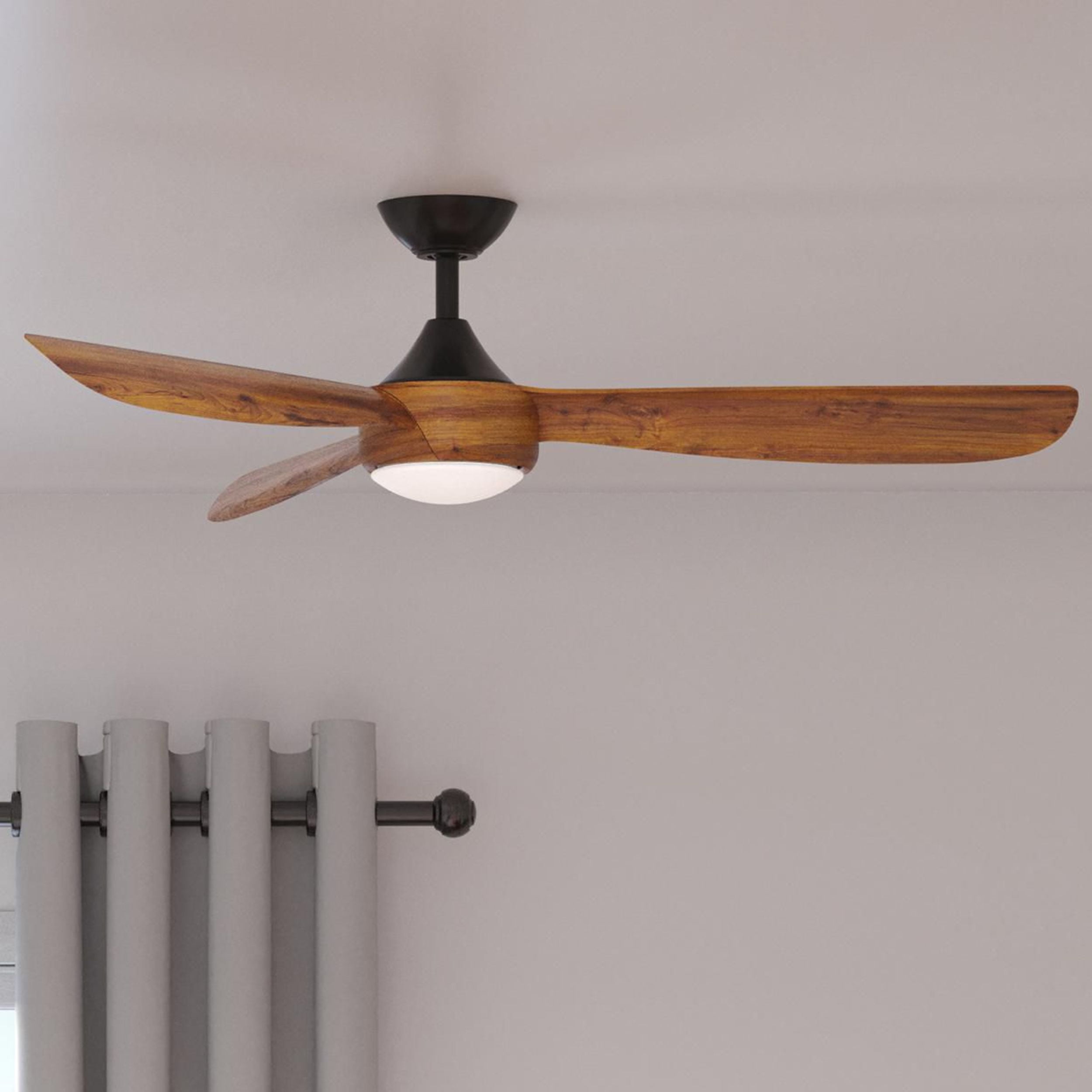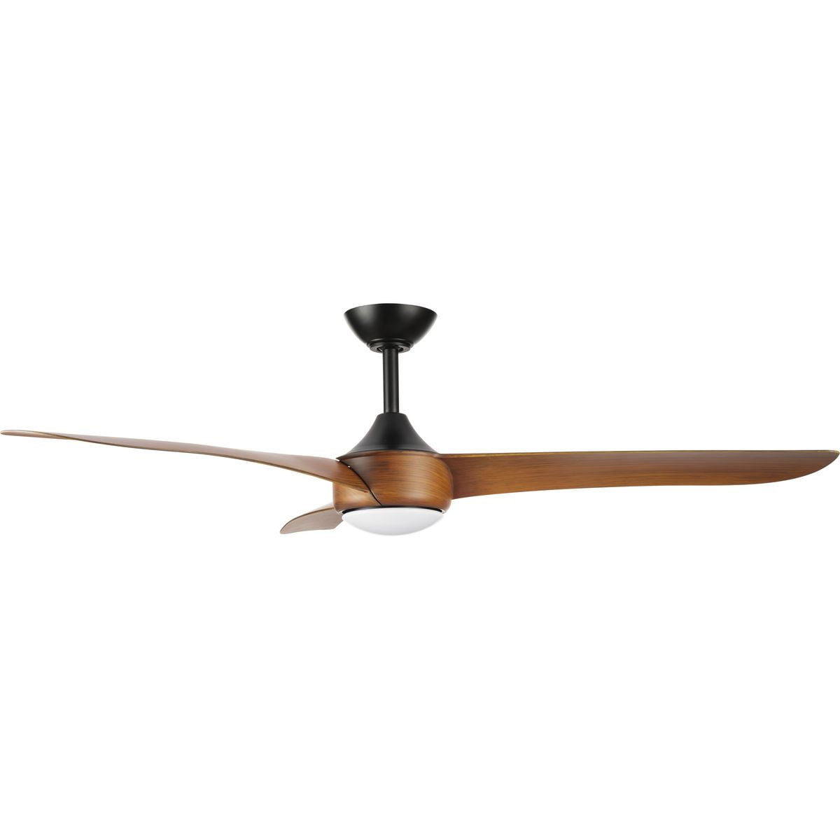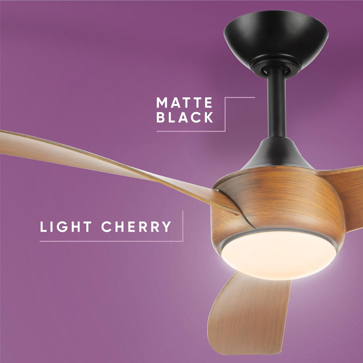 Sleek modern ceiling fan in matte black with wood-finish blades. Ideal for enhancing bedrooms, bonus rooms, great rooms or living rooms Measures: 56 in dia., 12.94 in height Integrated dimmable LED light source, 18W, 3000K cETLus Damp Location listed, enabling the fixture’s versatile use indoors or in covered outdoor areas. Our 1-Year Limited Warranty ensures your absolute satisfaction with your purchase and comes with dedicated professional after-sales customer service support.