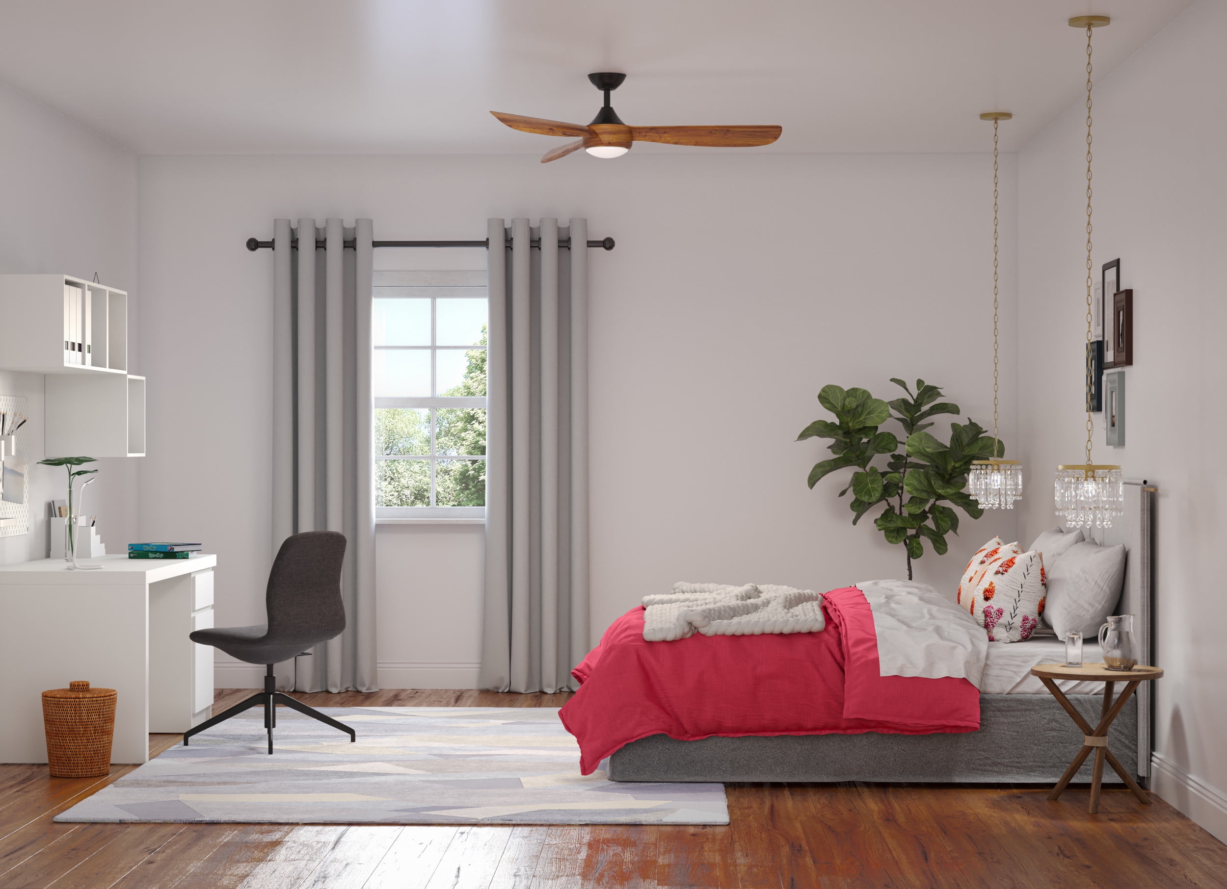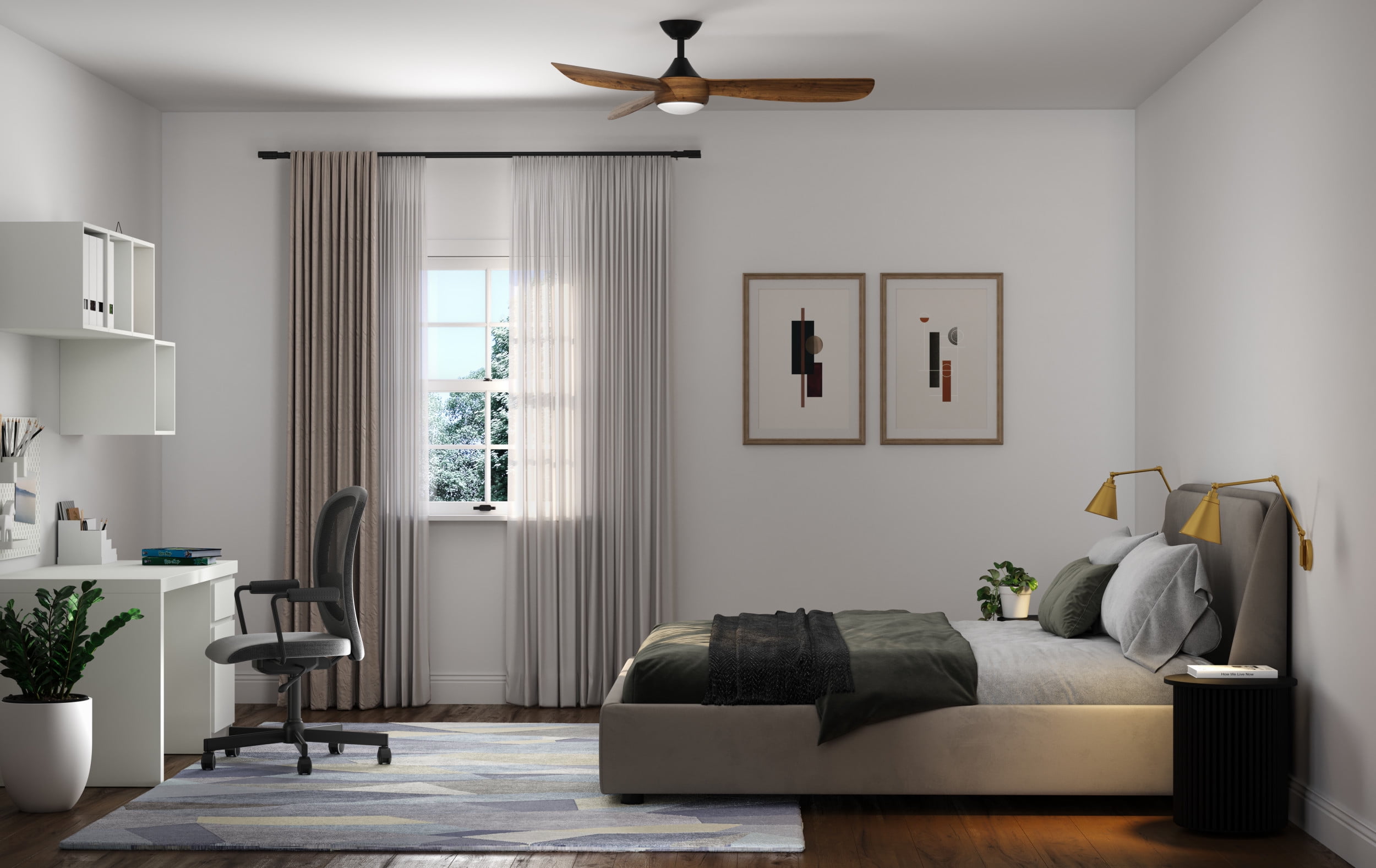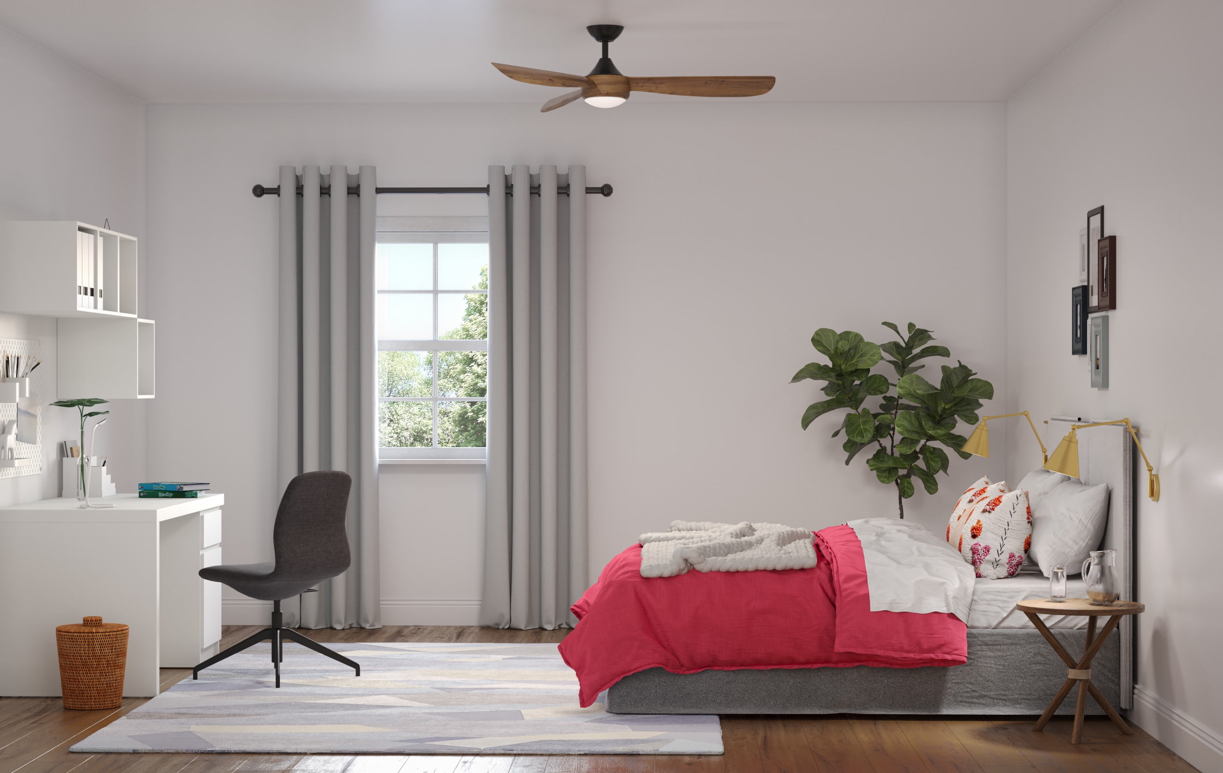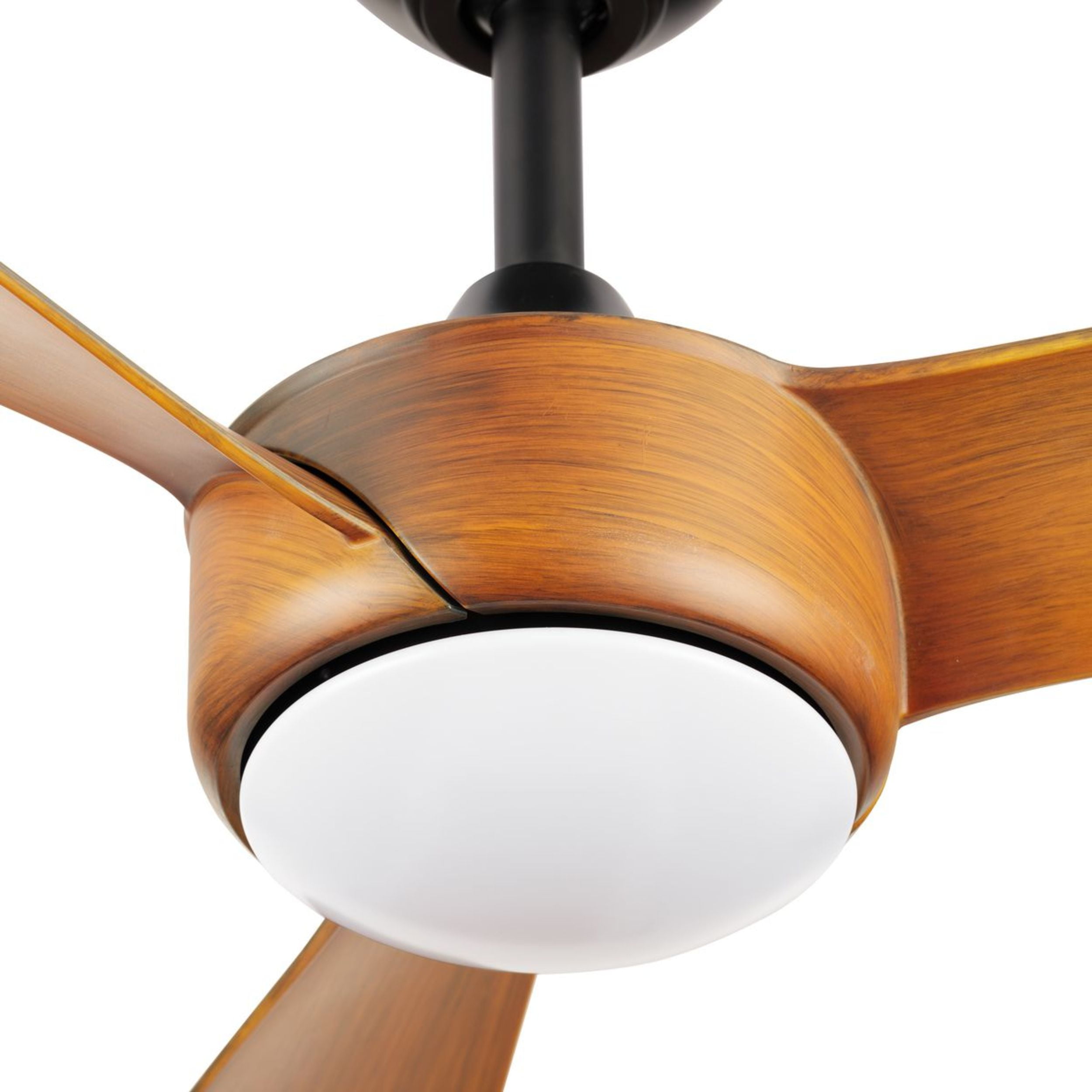 Sleek modern ceiling fan in matte black with wood-finish blades. Ideal for enhancing bedrooms, bonus rooms, great rooms or living rooms Measures: 56 in dia., 12.94 in height Integrated dimmable LED light source, 18W, 3000K cETLus Damp Location listed, enabling the fixture’s versatile use indoors or in covered outdoor areas. Our 1-Year Limited Warranty ensures your absolute satisfaction with your purchase and comes with dedicated professional after-sales customer service support.