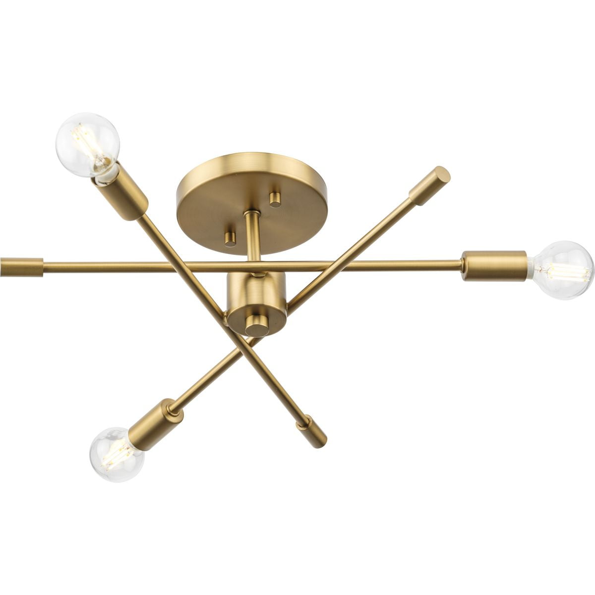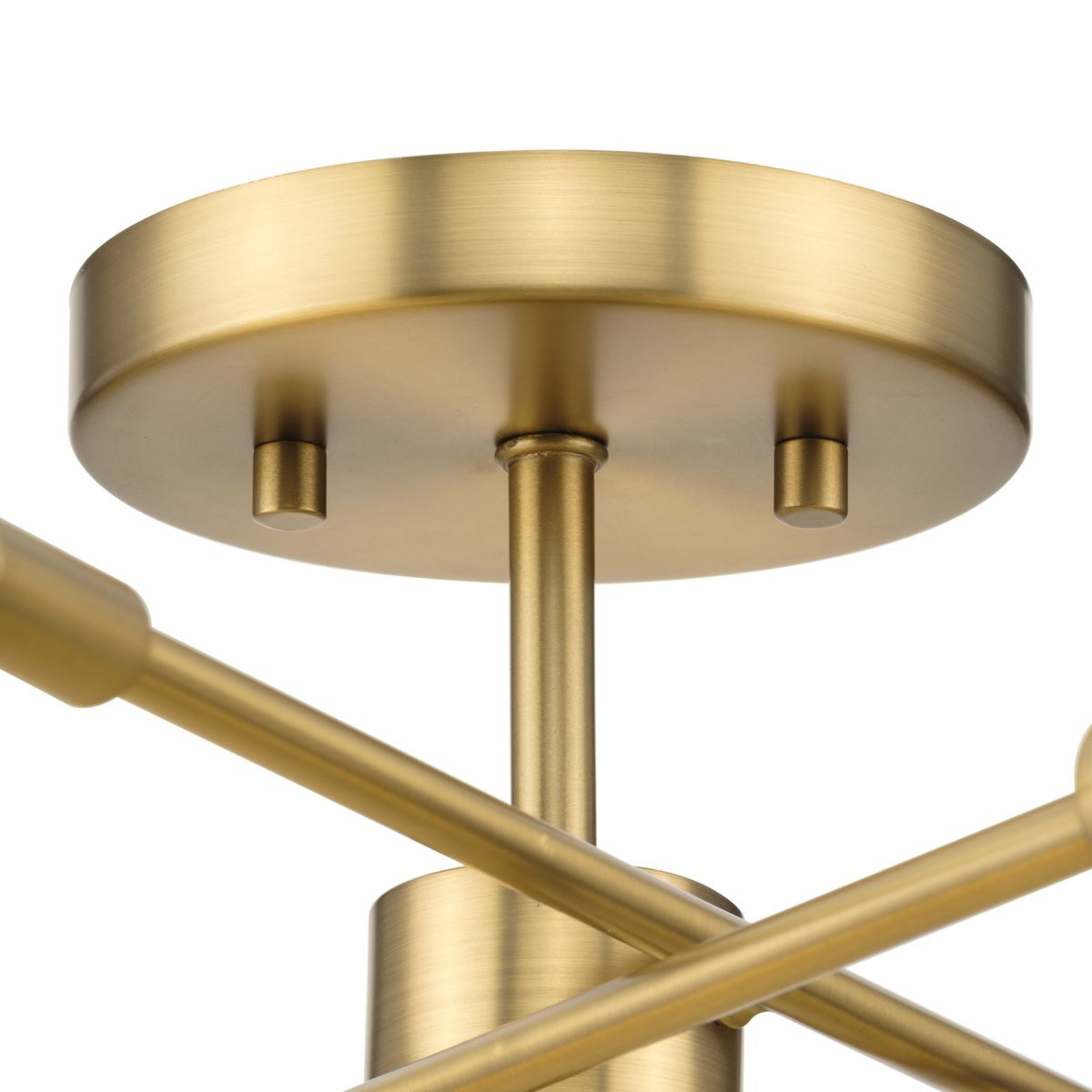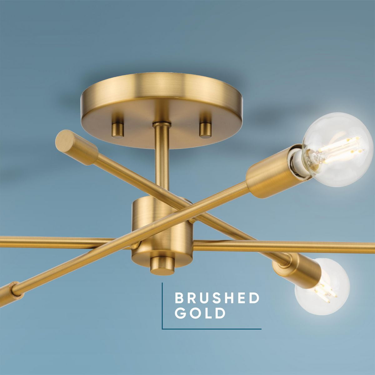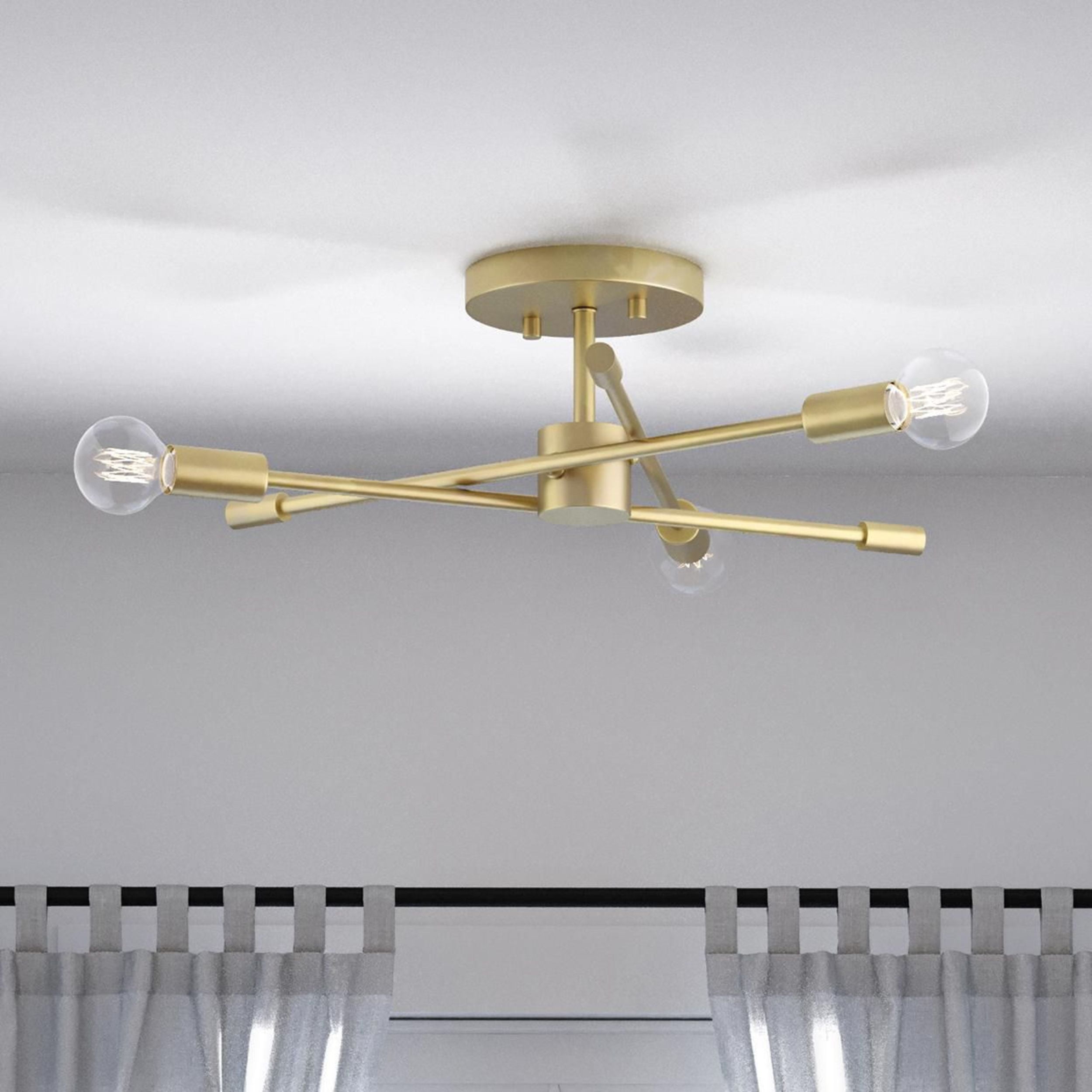 A beautiful mid-century modern brushed gold finish highlights the modern design of this luxe light Ideal for bedrooms, hallways, living rooms and inviting foyers. Measures: 18 in dia., 5.5 in height Requires three candelabra base bulbs, 60W (not included) This fixture offers dimmable functionality with the use of a compatible dimmer switch (not included) and dimmable bulbs (not included). Our 1-Year Limited Warranty ensures your absolute satisfaction with your purchase and comes with dedicated professional after-sales customer service support.