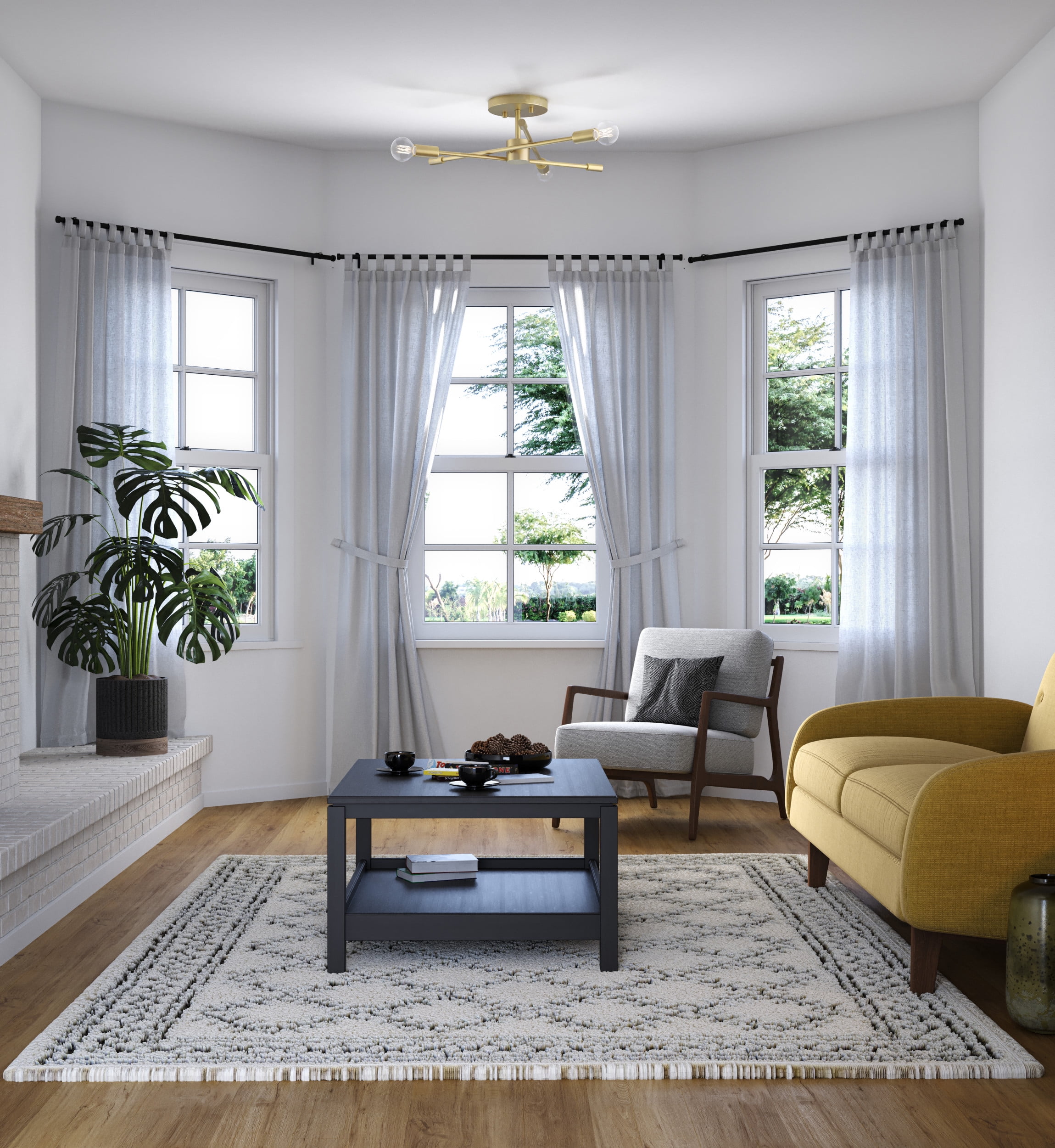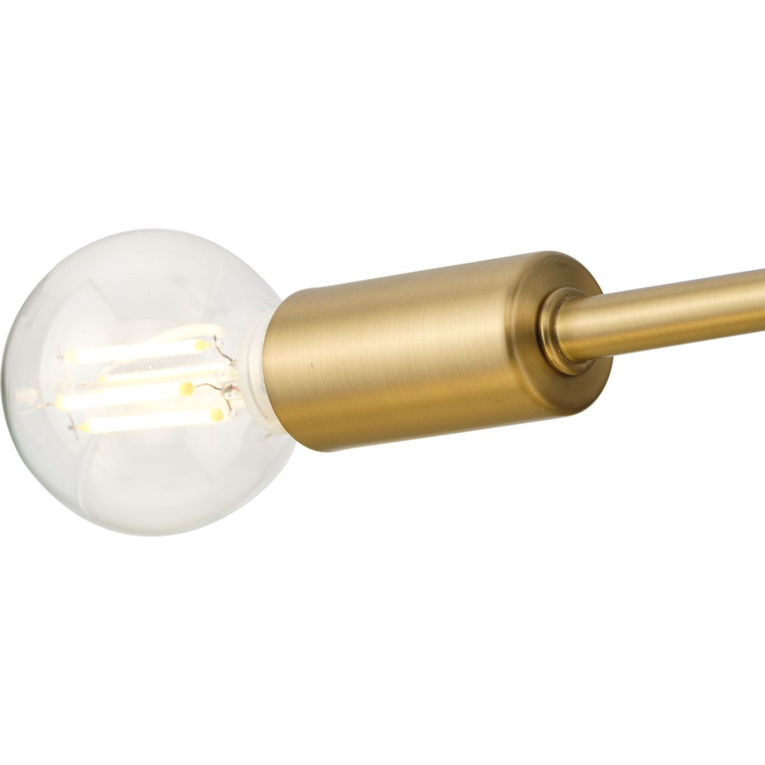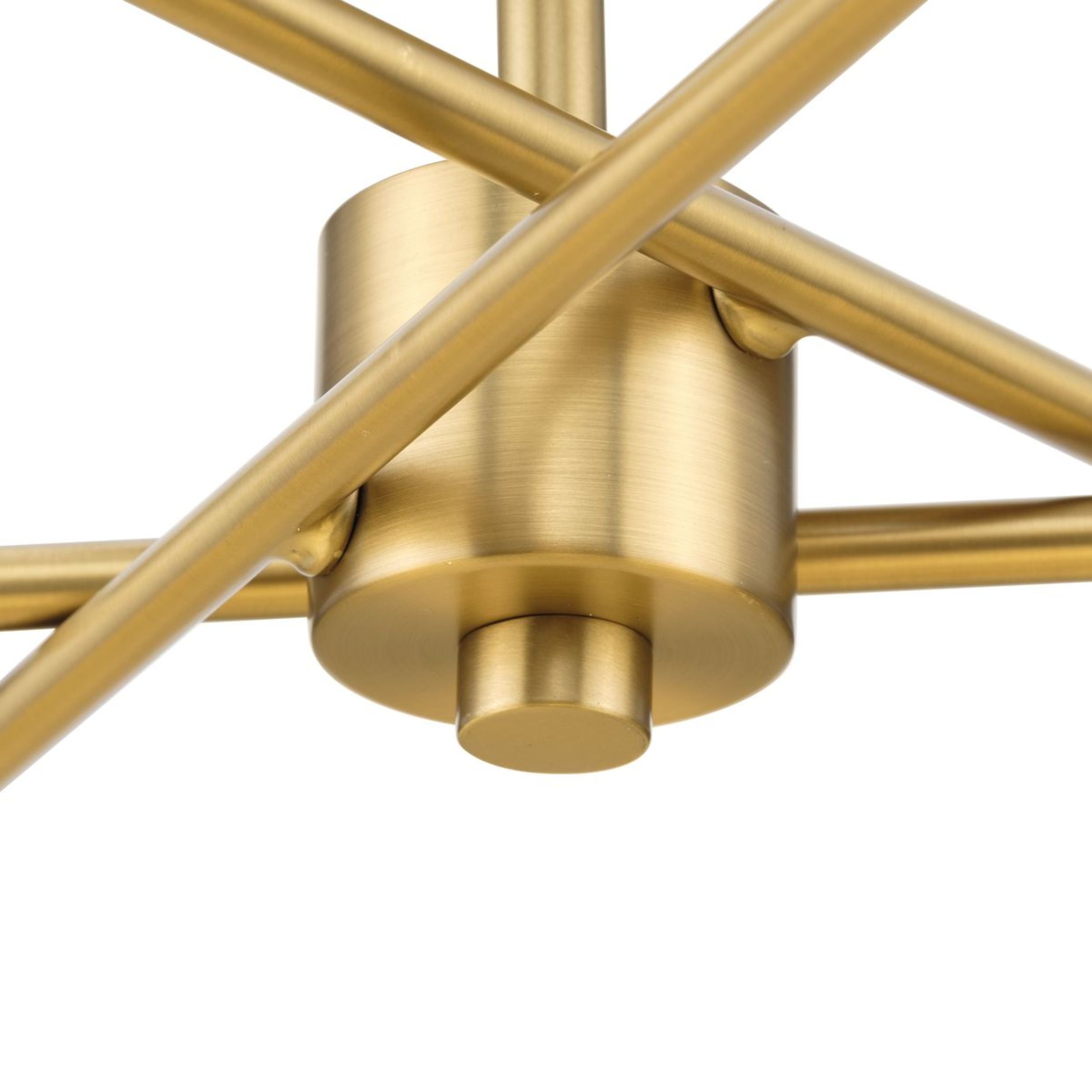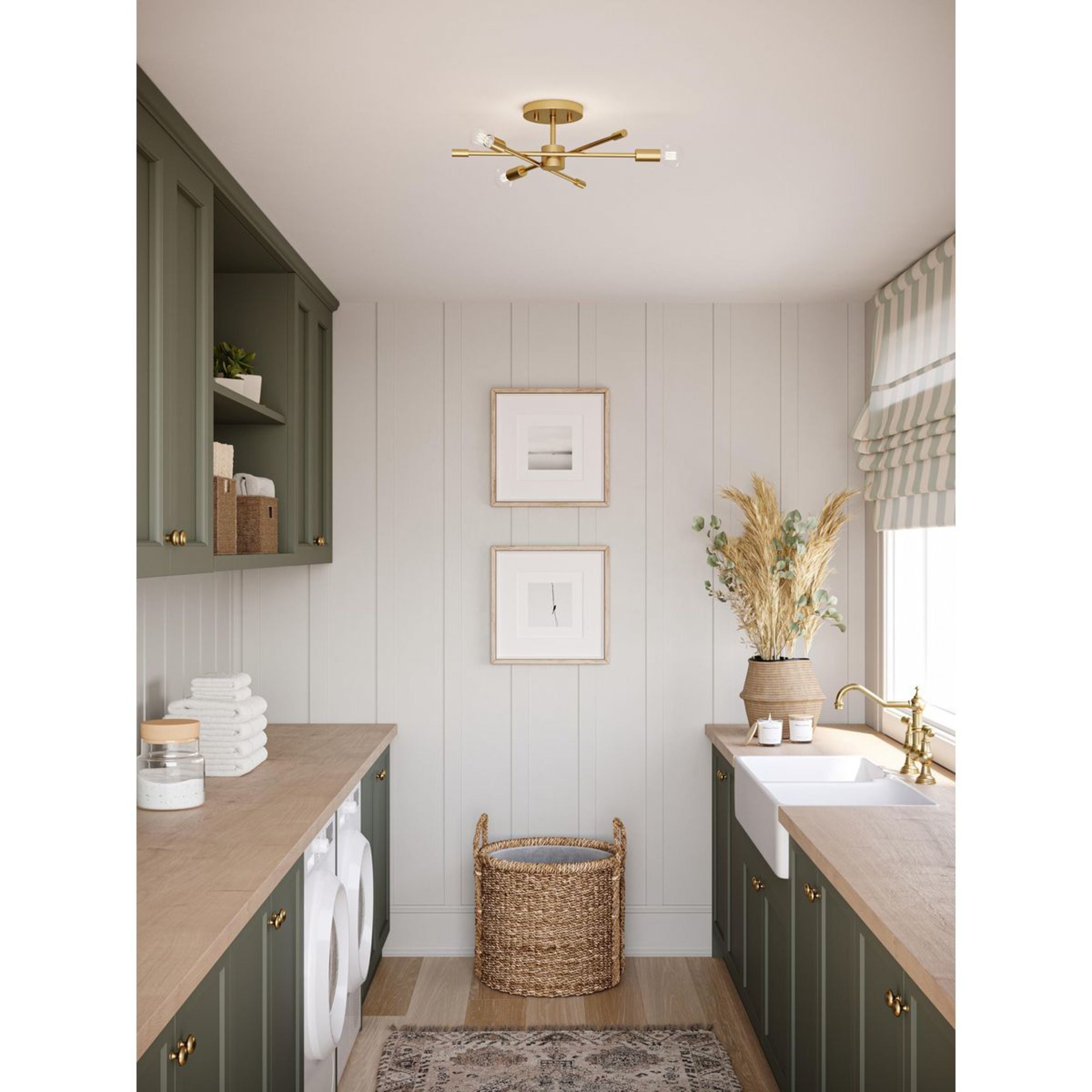 A beautiful mid-century modern brushed gold finish highlights the modern design of this luxe light Ideal for bedrooms, hallways, living rooms and inviting foyers. Measures: 18 in dia., 5.5 in height Requires three candelabra base bulbs, 60W (not included) This fixture offers dimmable functionality with the use of a compatible dimmer switch (not included) and dimmable bulbs (not included). Our 1-Year Limited Warranty ensures your absolute satisfaction with your purchase and comes with dedicated professional after-sales customer service support.