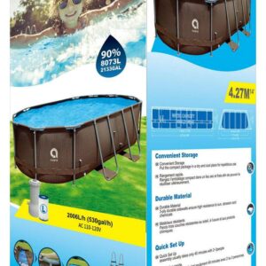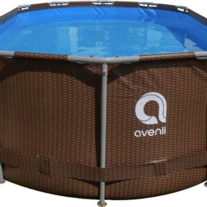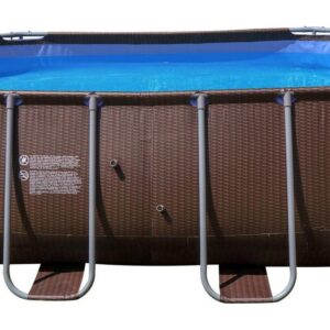 Cool off in your own backyard with this contemporary Avenli 14′ Rattan Series Above Ground Steel Frame Swimming Pool Set, it includes everything you need! The brown rattan pattern and oval shape complements any outdoor setting while the sturdy steel u-frame keeps the pool looking great all summer long. The stable locking system offers durability and is easy to set up with no tools required. This Avenli metal frame pool is stable and ready in a flash! Complete with a cartridge filter pump to ensure your water remains free from small particles and a drain valve to make draining your pool quick and easy when it s time to pack it away for winter. A 3-step steel pool ladder with slip resistant plastic steps is included for easy pool access. The 3-layer laminated PVC wall makes this pool durable and long lasting for countless summers of playing and swimming in the sun!