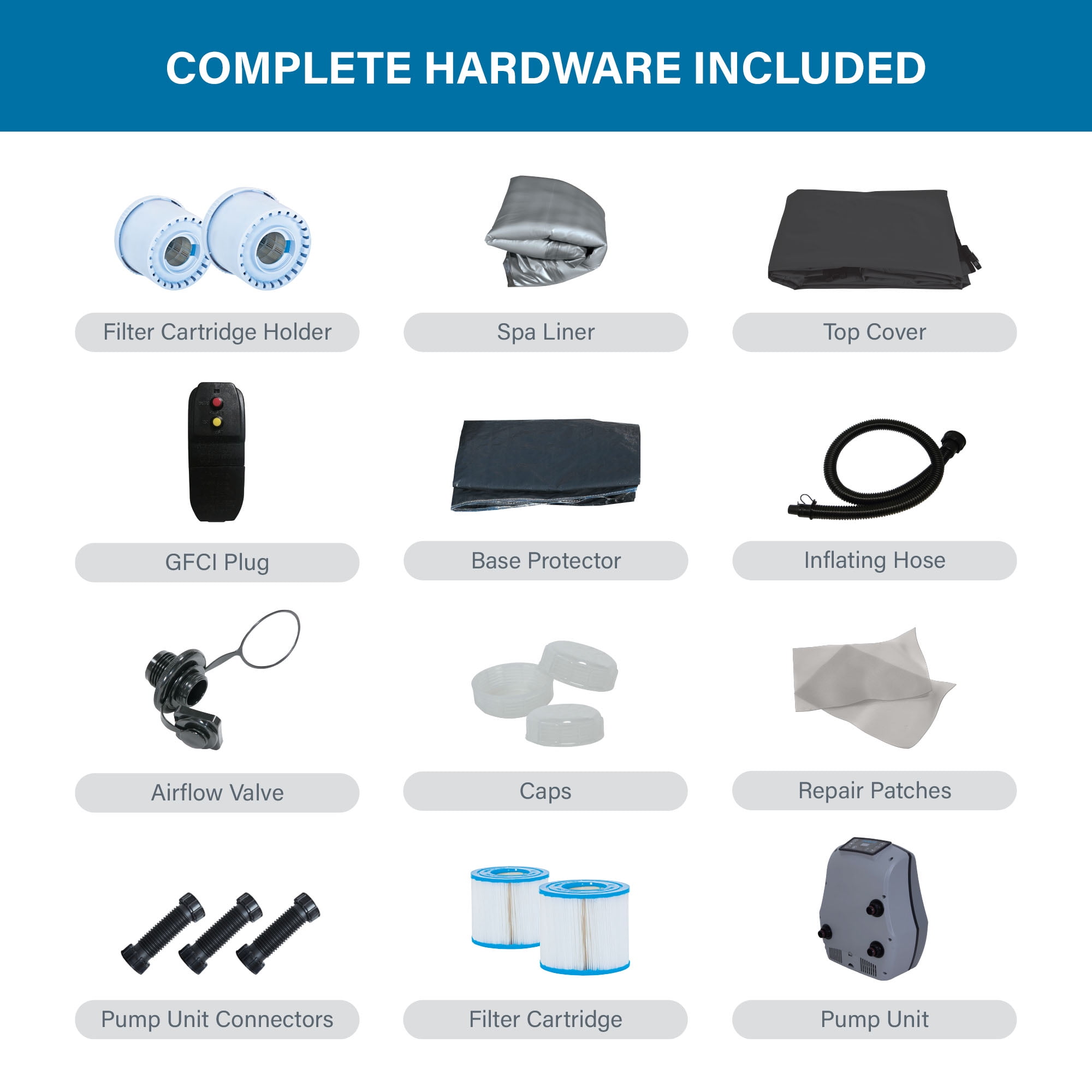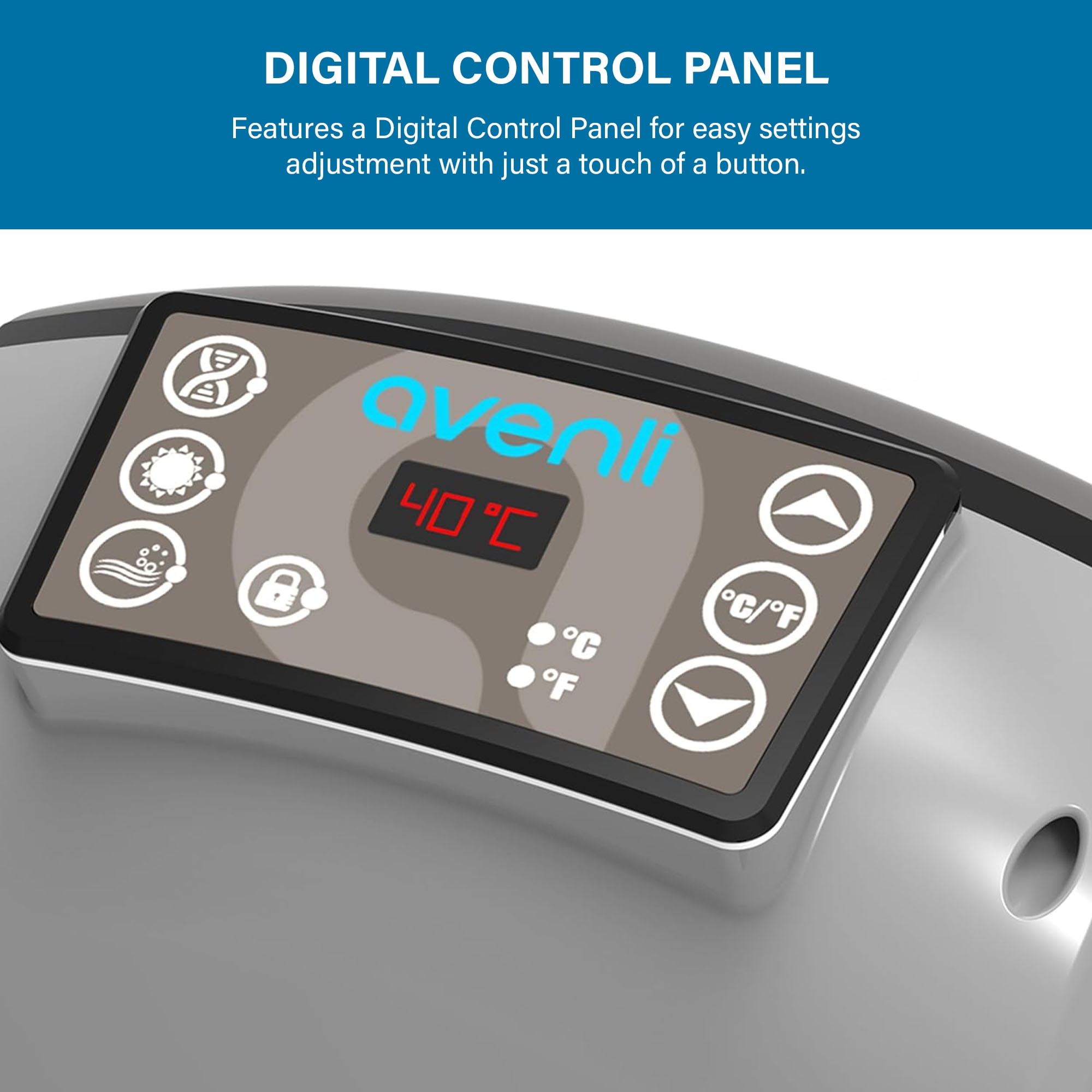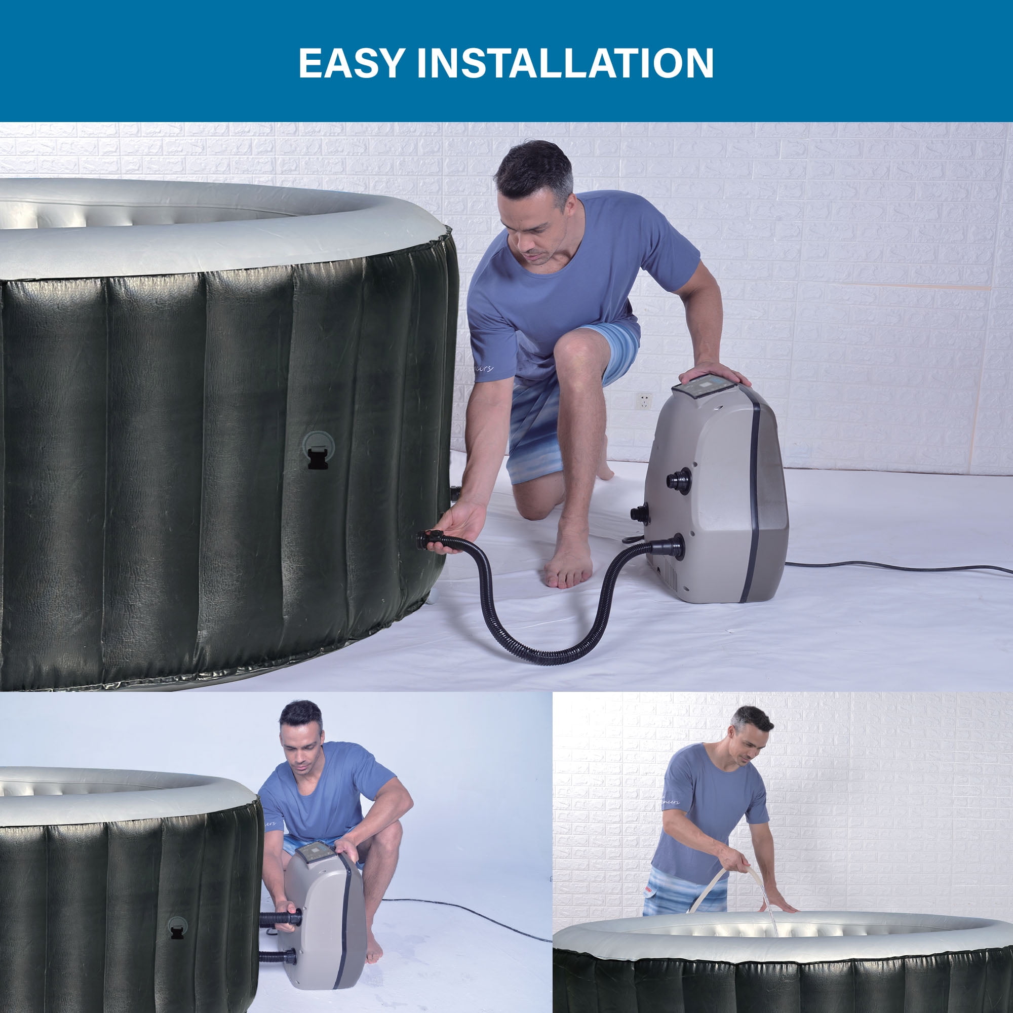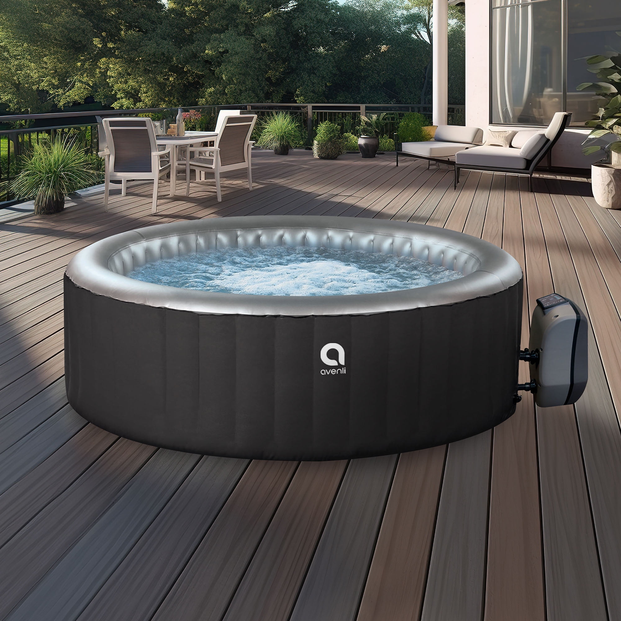 Avenli™ Inflatable 2-3 Person Hot Tub with 181 Gallon Capacity and 105 Relaxing Water Jets + Insulated Cover Enjoy total relaxation in your own backyard with the Avenli™ Inflatable Hot Tub Bubble Spa. This inflatable spa & hot tub features a patented O-Beam Structure for durability and enhanced comfort. The spa inflates in minutes and the rapid heating system quickly heats the water up to 104 degrees, perfect for soothing sore muscles or lounging after a long day. With the touch of a button, activate the 105 soothing water jets that surround the interior of the spa or adjust the temperature that best suits your comfort level. This round inflatable hot tub comes with everything you need to enjoy your spa, including an insulated cover, floor protector, spa liner, spa pump (220-240V), filtration cartridge, filter element box, and inflation tube. After a long day, wind down and relax in the comfort of your backyard with the Avenli™ Inflatable Hot Tub Bubble Spa.