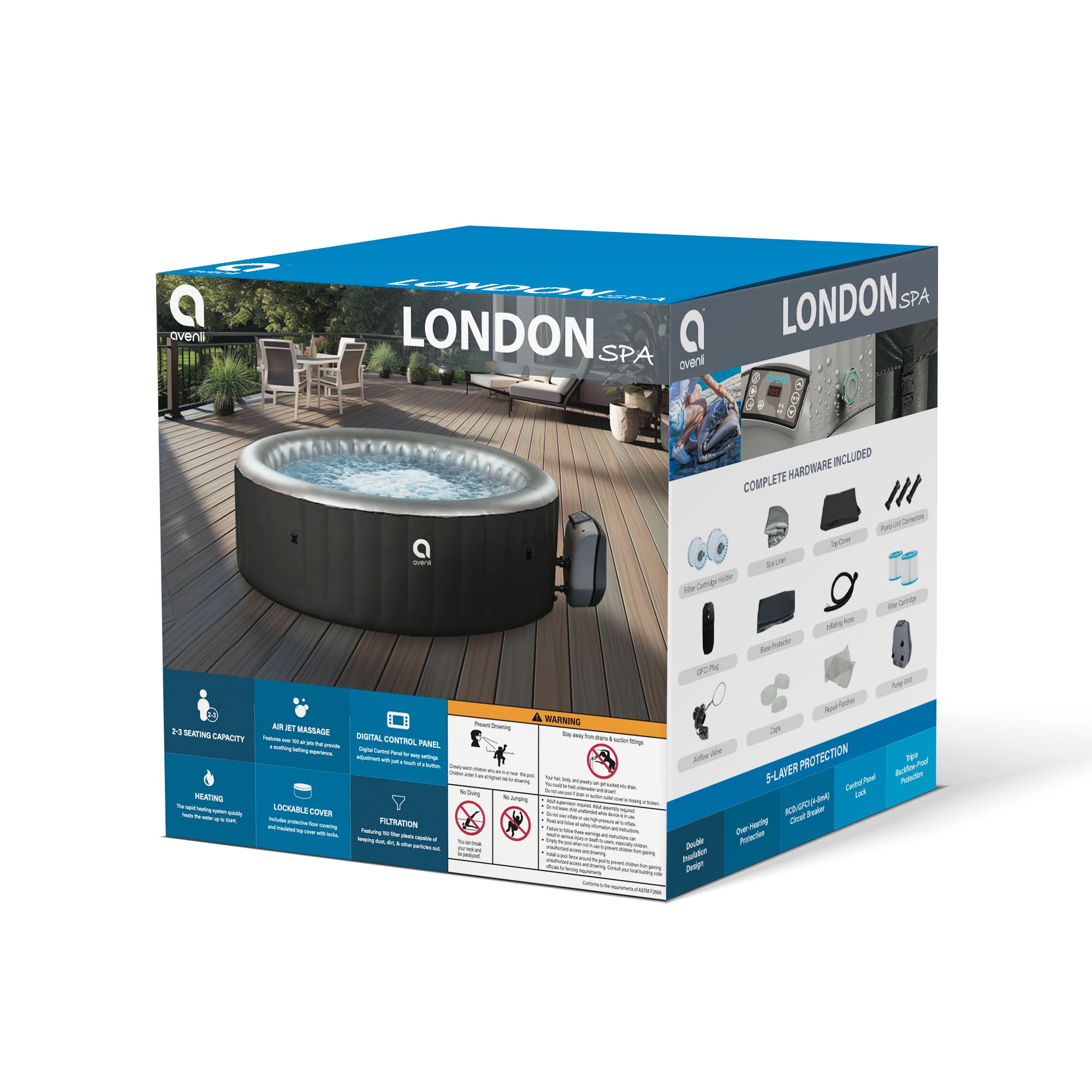 Inflatable Hot Tub Size: Round hot tub measures 65 inches long, 65 inches wide and 27.6 inches tall – the ideal size for 2-3 adults Stress-Free Relaxation: The London Hot Tub has a 181 gal capacity, 105 water jets and features a rapid heating system with a max of 104°F, to provide ultimate relaxation in your own backyard anytime of the year! Patented O-Beam Structure is resistant to deformation and promotes minimized breakage Settings & Controls at your Fingertips: Easily adjust spa settings and control the hot tub features at your fingertips with the built in digital control panel, ensuring a hassle free spa at home Consistent Heat: Powerful built-in pump filters and double heats the water, to make sure it gets to your ideal temperature quickly and maintains it steadily Safety and Security: Double-locking safety clips secure the cover to prevent children or other unwanted guests from gaining access to your spa without permission Superior Strength & Durability: Attractive exterior with a sturdy I-beam construction and 3-ply reinforce wall offer superior strength and durability Digitally Controlled Pump with soft-touch control panel for a user-friendly operation Everything You Need to enjoy hot tubbing in your own back yard! Complete kit includes an insulated cover with double locking safety clips, a floor protector, two filtration kits, a flexible inflation hose, and a convenient repair patch (though we hope you will never need it!)