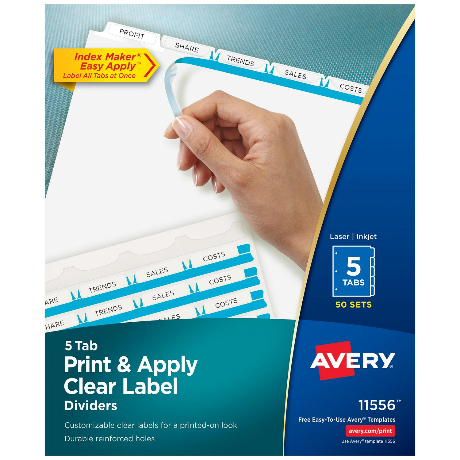 Easily create print shop quality personalized binder dividers with tabs with Avery Index Maker Clear Label Dividers. Customize the title tabs for your dividers quickly and easily using the free templates on the Avery website and print with your inkjet or laser printer for clean, professional looking results in minutes. This pack comes with 50 sets of 5-tab dividers, and the Easy Apply clear label strips make it simple to apply all 5 labels of each set at once. Just print, align labels against tabs, smooth down labels and peel up strip. Each 3-hole punched durable divider also features doubled-sided, reinforced tabs and edges to help resist tearing for long-lasting, everyday use. These 3 ring binder dividers with tabs are a great addition to your medical office supplies, school binders, personal organizers, tax office supplies, presentation reports and more. Print, peel, and press your way to a perfect, precise project.