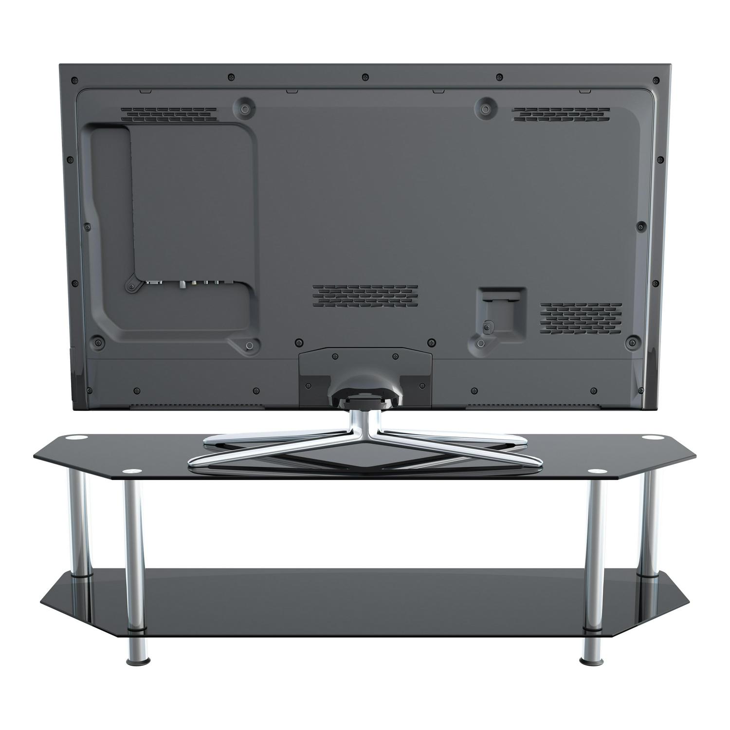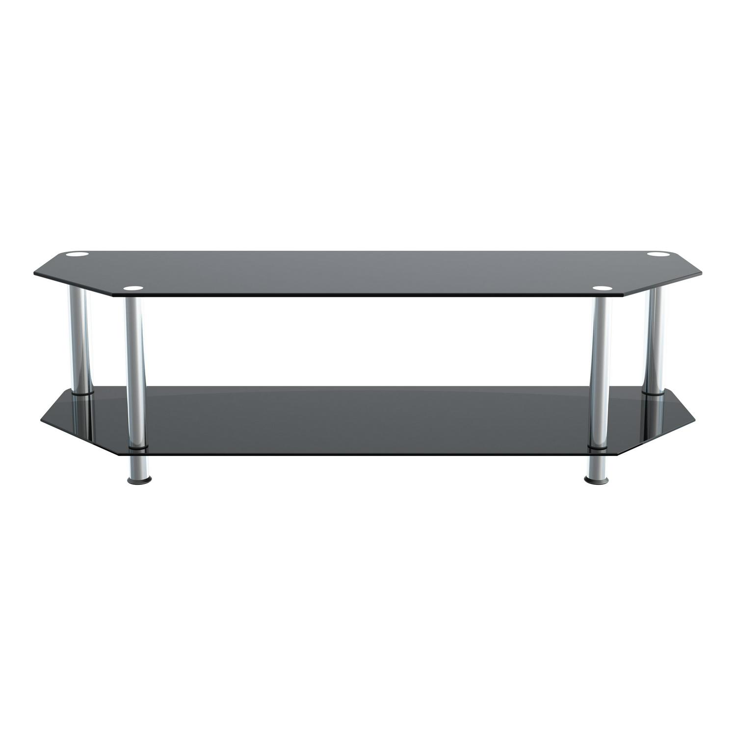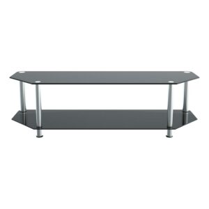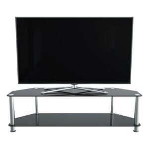 The SDC family is a simple, attractive, and versatile series of a/V stands and tables, in multiple sizes. The high quality, easy to assemble stands blend with virtually any décor. AVF SDC1400-A supports flat panel TVs up to 65″ [please measure to assure your TV will fit]. The Black tempered glass and durable chrome legs modernize any space while the angled corners provide multiple room placement options including into corners to maximize space and viewing angles. The bottom shelf is perfect for AV components such as digital receivers, DVRs, Blu-ray, gaming consoles, speakers, Apple TV, Sonos devices, etc. Wide-spread feet are becoming more common on TVs. For TVs with this base configuration, please measure carefully and compare to the dimensions of these TV Stands to ensure the TV will fit on the TV stand. TVs with traditional pedestal-style base will fit on this stand with no issues. If you are unsure, it may be best to purchase a replacement pedestal base for your TV. AVF offers, pedestal-style TV bases for sale separately for all TVs if needed. For TVs with wide feet, please check your TV base width – assembled dimensions (Width x Depth x Height): 55.12″ X 17.72″ X 15.75″. Fits MOST TVs in these sizes: 32 , 37 , 39 , 40 , 42 , 43 , 46 , 47 , 50 , 52 , 55 , 58 , 60 , 65 .
