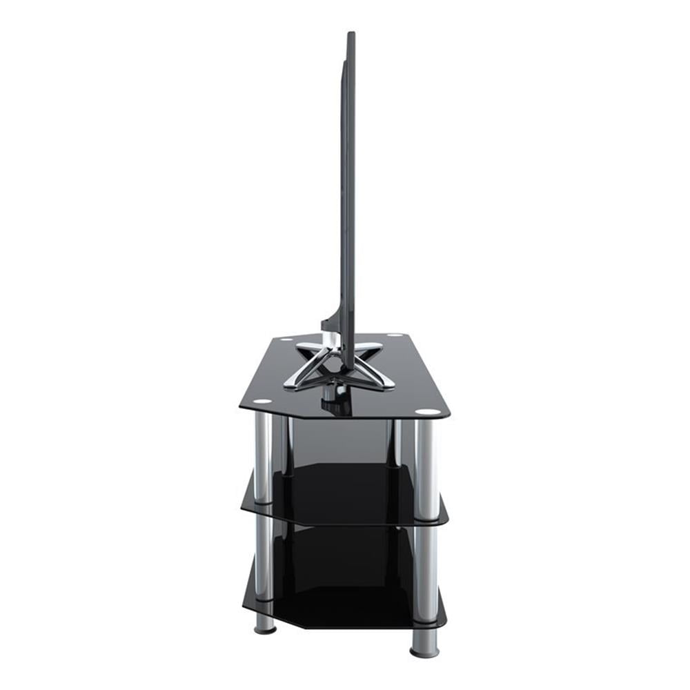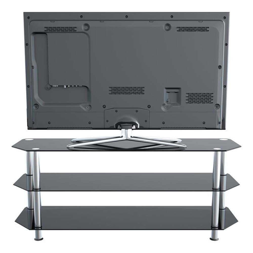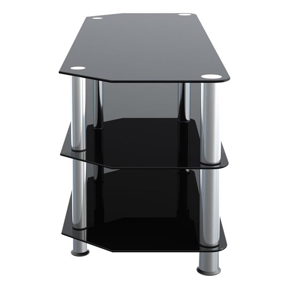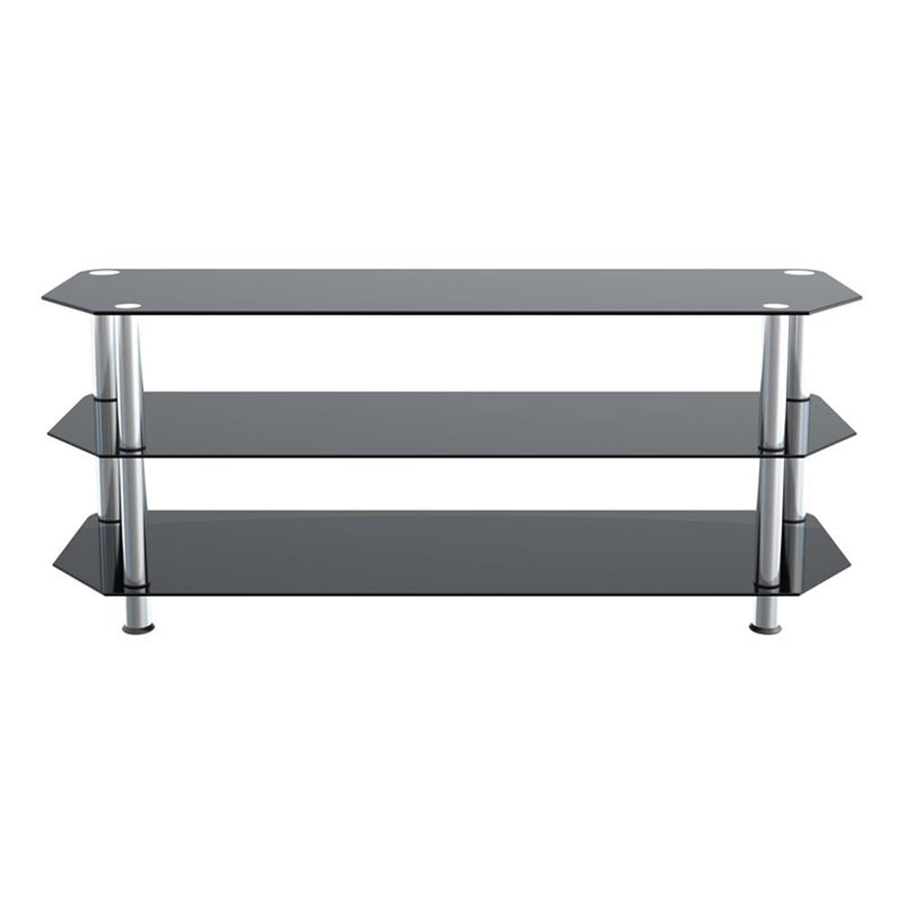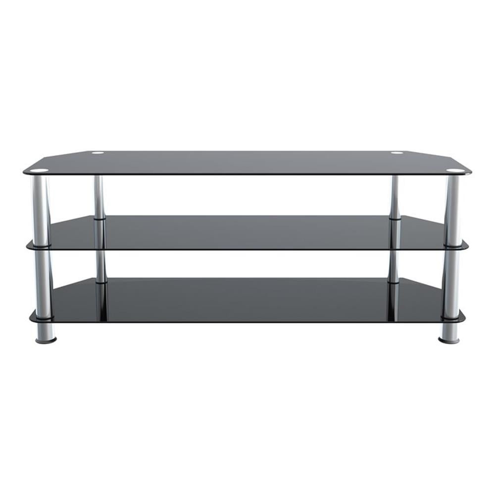 AVF SDC1250-A. The SDC family is a simple, attractive, and versatile series of A/V stands and tables, in multiple sizes. The high quality, easy to assemble stands blend with virtually any decor. The AVF SDC1250-A supports flat panel TVs up to 60″. The black tempered glass and durable chrome legs modernize any space while the angled corners provide multiple room placement options including into corners to maximize space and viewing angles. Middle and bottom shelves are perfect for AV components such as Digital Receivers, DVRs, Blu-ray, Gaming Consoles, Speakers, Apple TV, Sonos devices, etc. The stand accommodates most TVs in these sizes: 27 inch, 32 inch, 37 inch, 39 inch, 40 inch, 42 inch, 46 inch, 47 inch, 50 inch, 55 inch, 58 inch, 60 inch. Assembled Dimensions: Assembled Dimensions (Width x Depth x Height): 49.21″ x 17.72″ x 19.69″. IMPORTANT: For TVs with wide feet, please measure width and depth of the TV to assure it will fit on this TV Stand. Features: Materials: Steel, glass Finish: Chrome effect, black glass Supports TVs up to 99 lbs, plus 44 lbs for Middle & Bottom Black Tempered Glass Shelves Angled Back Allows Placement Flat Against a Wall or in a Corner For TVs with wide-spread feet, please measure the TV to assure fit on this TV stand. Assembled Dimensions (Width x Depth x Height): 49.21″ x 17.72″ x 19.69″. Specifications: Product Dimensions: 19.69″H x 16.54″W x 49.21″D Product Weight: 46 lbs