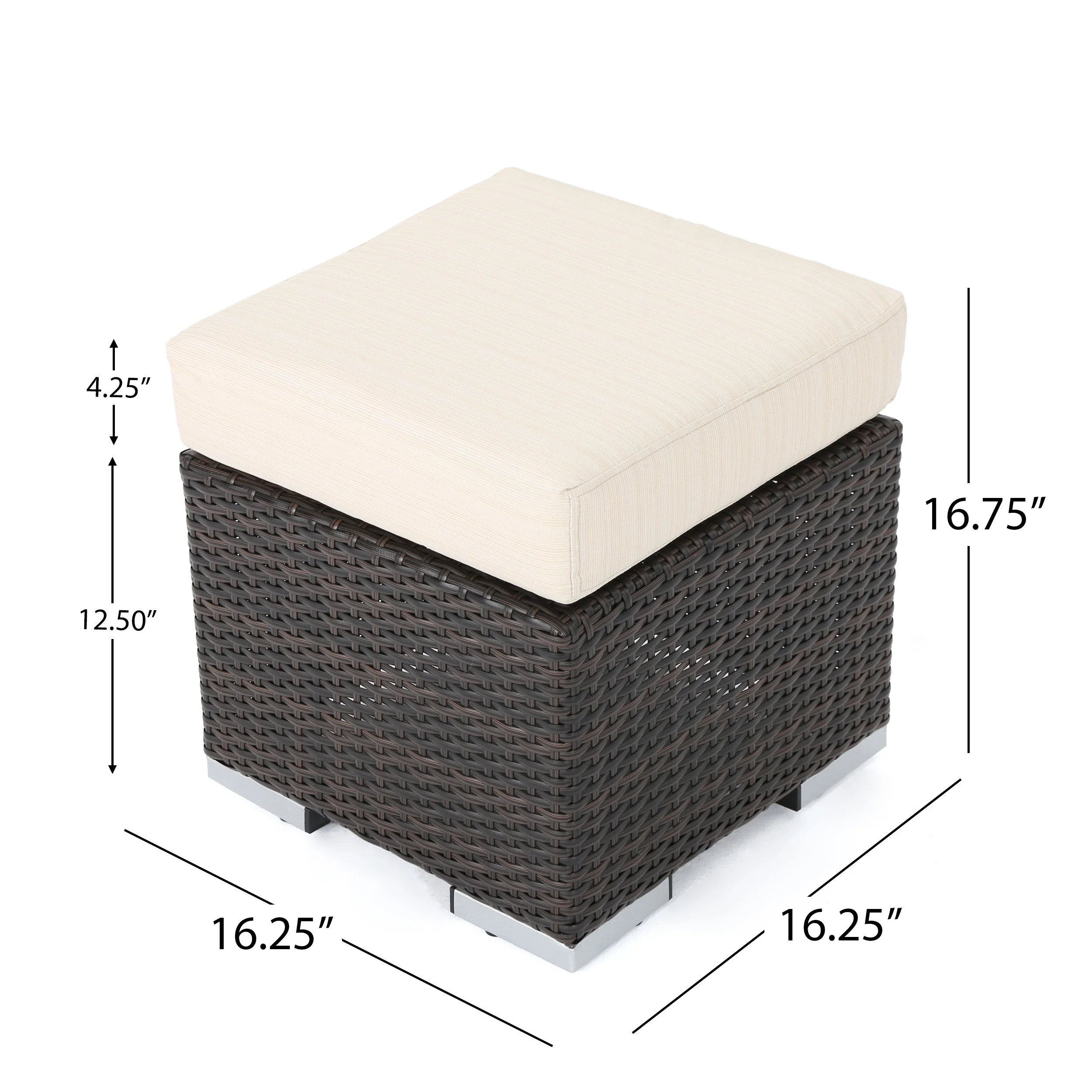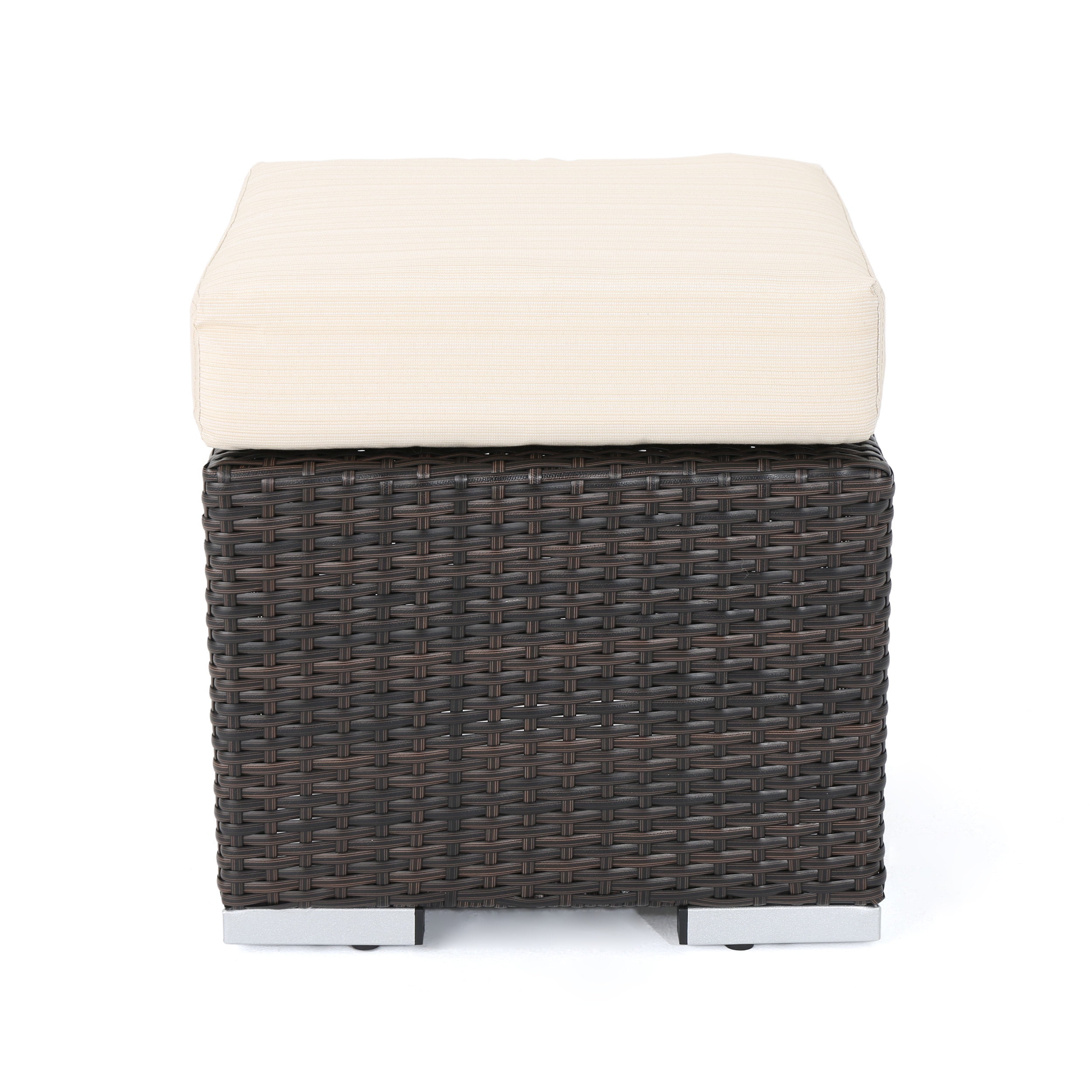 Includes: One (1) Ottoman Material: Polyethylene Wicker Cushion Material: Water Resistant Fabric Composition: 100% Polyester Frame Material: Iron Wicker Finish: Multibrown Cushion Color: Beige Frame Finish: Multibrown No Assembly Required Hand Crafted Details Dimensions: 16.25 inches deep x 16.25 inches wide x 12.50 inches high