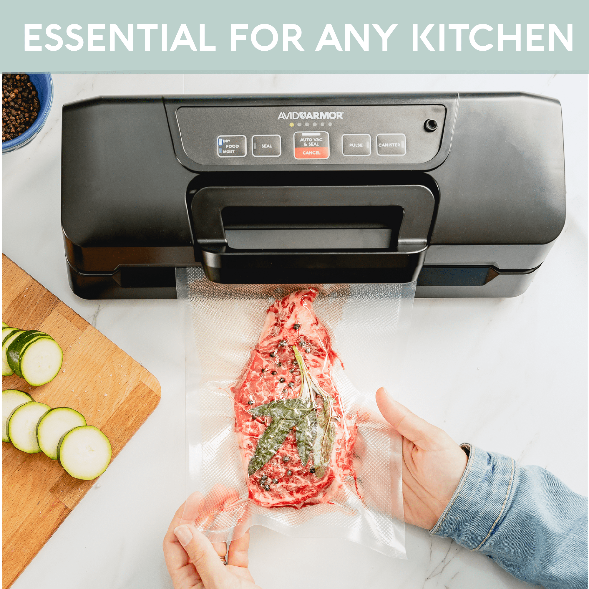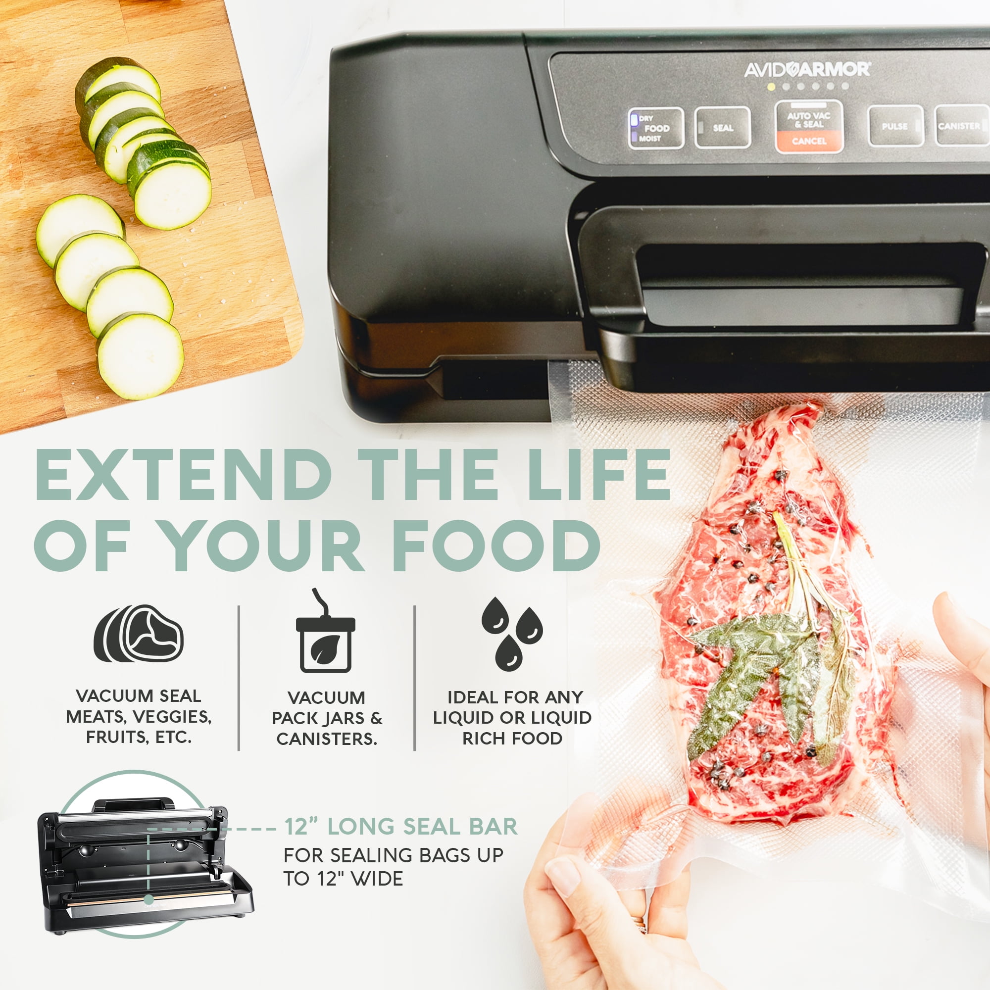 The Avid Armor AVS7900 Vacuum Sealer is a versatile and efficient food storage solution. With its high-pressure vacuum sealing technology, this compact machine effectively preserves the freshness of your food, extending its shelf life. The straightforward one-touch controls and 12-inch seal bar make it easy to quickly pack individual or family-sized portions, while the accessory port allows you to vacuum seal canisters, containers, and mason jars for secure storage of larger items. Designed with a sleek and space-saving profile, this durable vacuum sealer is an essential kitchen appliance for enthusiasts and professionals alike, helping you reduce food waste and enjoy your delicacies for longer.