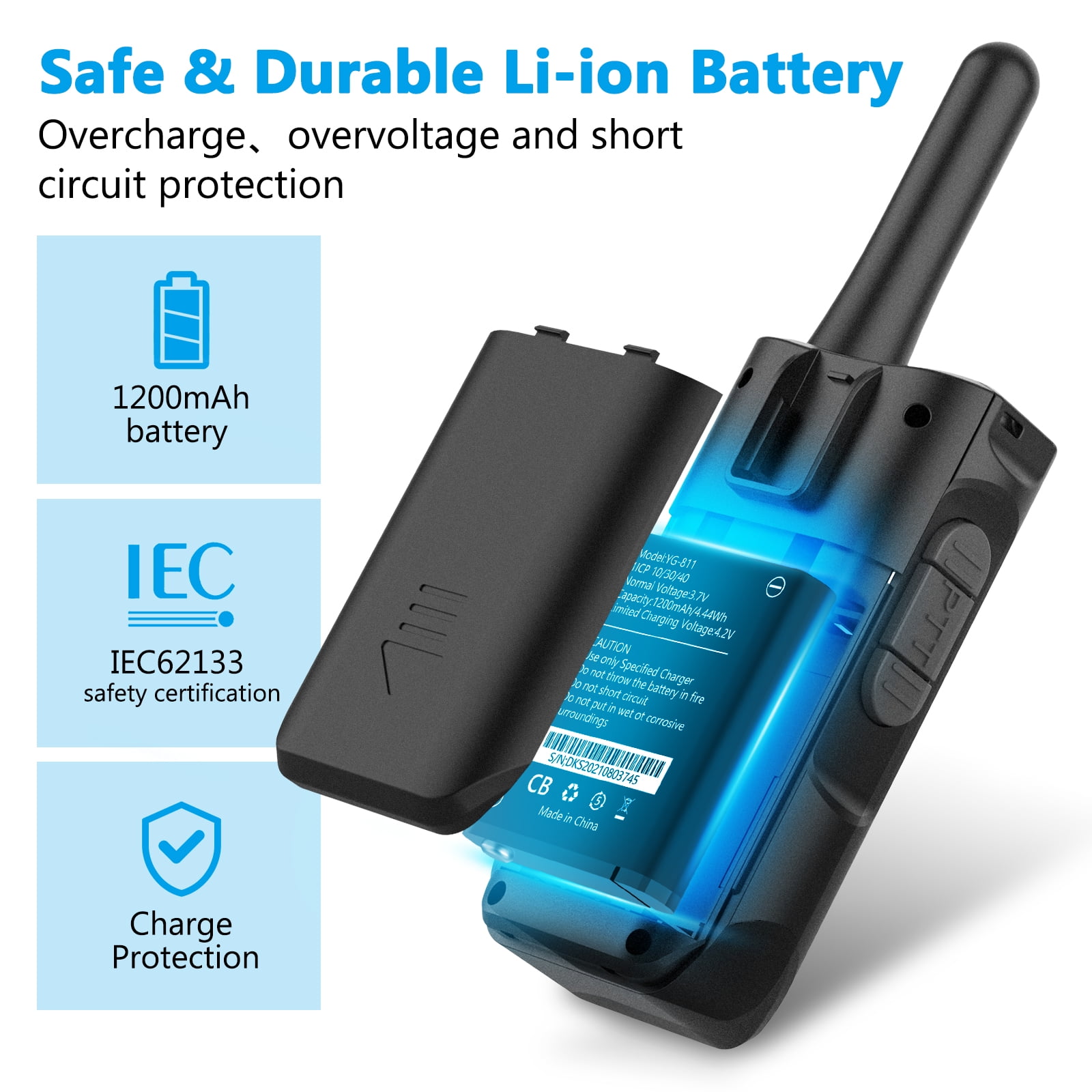 22 Channels 121 Privacy Codes LCD Backlit Auto Squelch Keypad Lock VOX–Hands-Free Operation Flashing Low Battery Alert Headphone Jacks (2.5mm) Long Range – Up to 3 miles in open fields Rechargeable 1200mAh Li-ion battery packs included Clear communication with easy button access Compatible Receives communication from all FRS radios FCC ID: 2AYV7YG-811