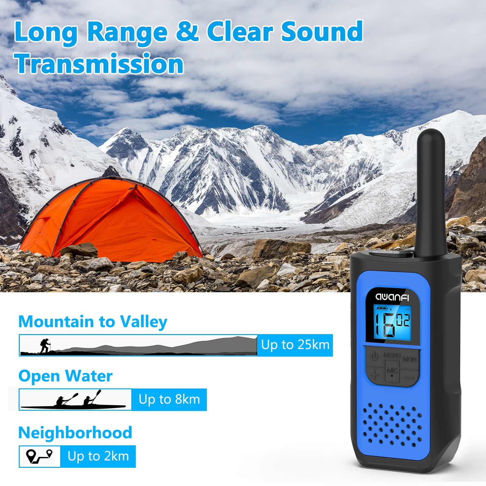 AWANFI Rechargeable Walkie Talkies for Adults Kids 3 Pack 22 Channel Long Range Two Way Radio The AWANFI FRS Long Range Walkie Talkie 3 Pack provides hands-free operation. It includes four AWANFI Long Range Walkie Talkies that feature an up to 3-mile communication range in open fields and 22 channels. Keep your communications private with 121 privacy codes and keep chatter off of your channel with these rechargeable walkie talkies. It comes with Micro USB Cables and belt clips. If you are looking for an affordable and fun way to communicate with your crew in a gig or event or just to play with your family. AWANFI Walkie-Talkie 3 Pack will also be great for Christmas gifts! Features: Compact, Simple & LCD Display–The large LCD display can display the number of channels, transmit, receive, power, volume, keyboard lock, VOX switch, etc. you can use YG-811 to stay in communication anywhere. Long Range & Clear Sound–Support up to 3 miles of communication range in open fields, however, the range differs greatly depending on the surroundings. AWANFI walkie talkies have clear audio even at long distances, just make sure you’re on the same channel. 1200mAh Longevity Battery–Each AWANFI walky talky comes with 1200mAh lithium rechargeable batteries. Usually, walkie talkie can be used for 3-4 days with a full charge. Multiple Methods to Charge–One recharge cable that allows up to 3 radios to be charged at once, supports charge by Micro USB / Car Charger / Power Bank / Power Adaptor, etc. Lifetime Support– AWANFI walkie talkies offer one year manufacturer warranty and 30 days free return and exchange. Please feel free to contact us if you have any concerns about the item.