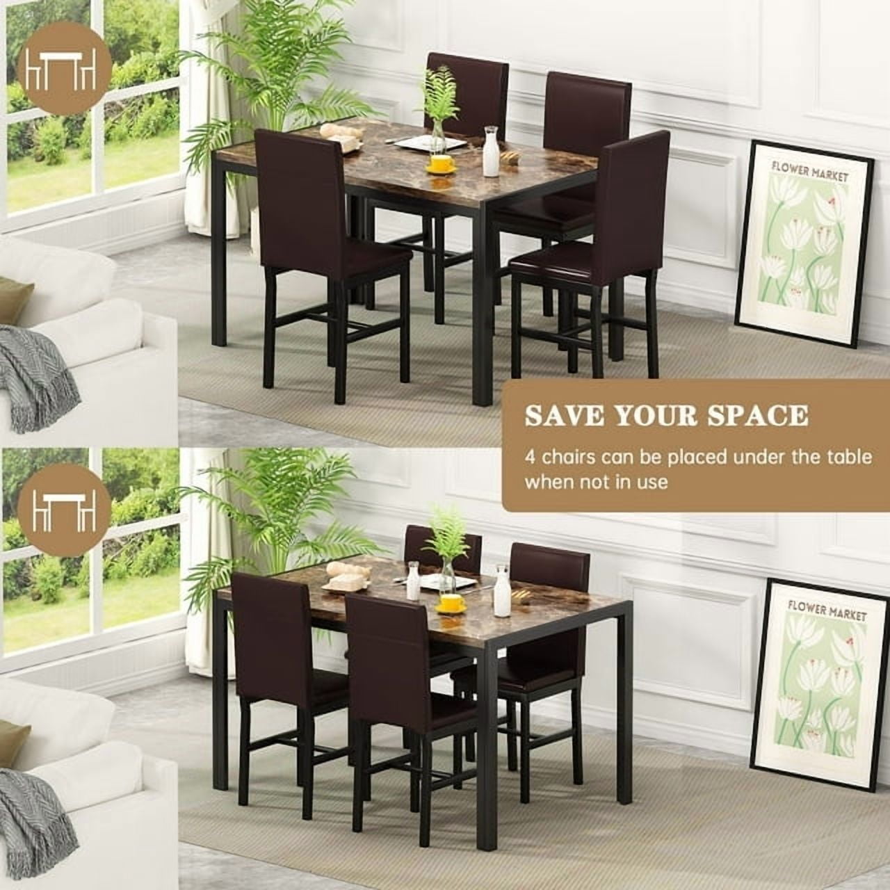 AWQM Dining table set for 4 with modern faux marble table top and 4 PU leather upholstered chairs, compact space saving dining table for apartment, kitchen, dining room, breakfast corner, brown