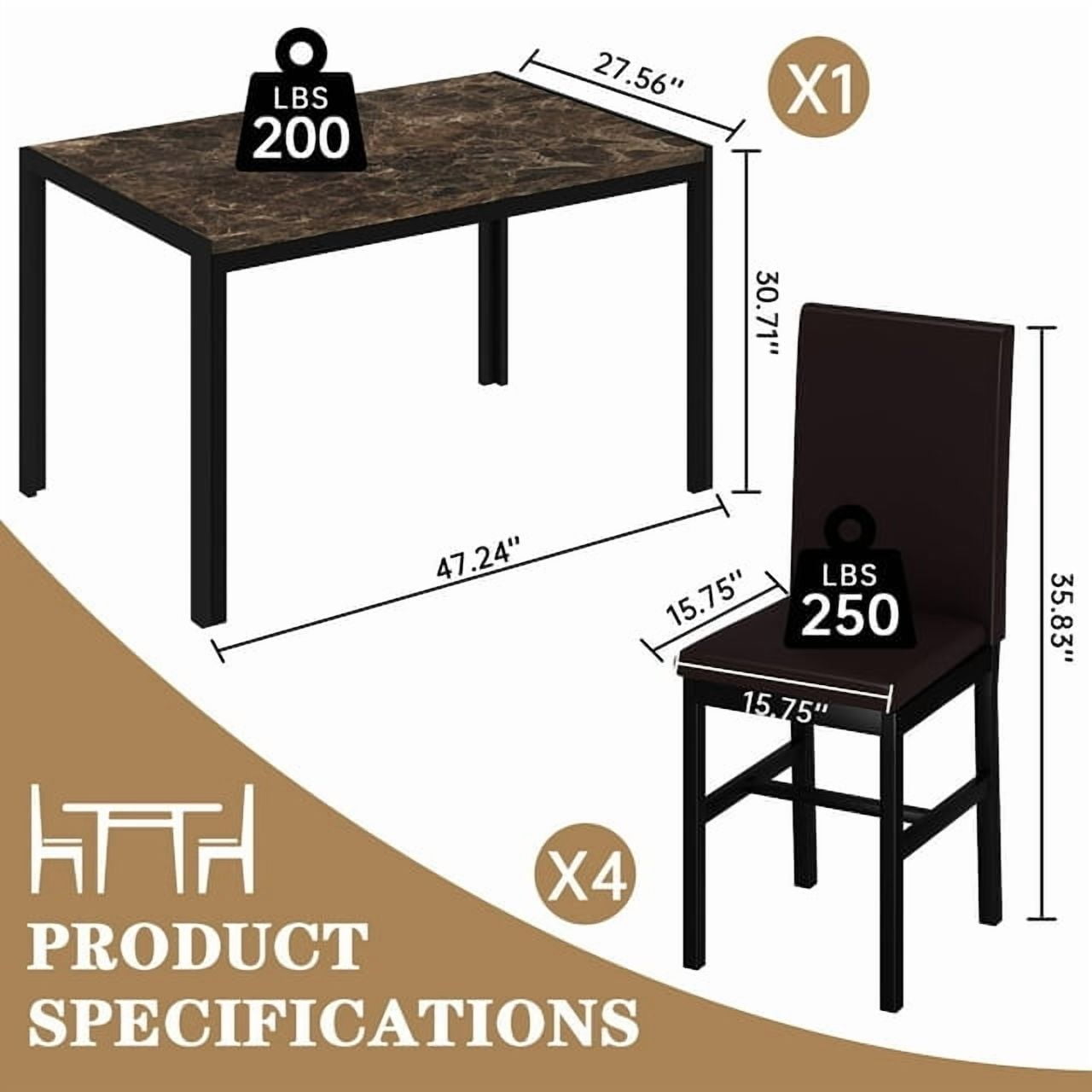 Stylish Dining Table Set: Imitation marble surface and straight lines, with a bright shiny appearance.The artificial marble countertop dining table adds a touch of elegance and sophistication to your home. Waterproof marble table top and leather surface can be cleaned most easily when sprinkling or drinking water. Comfy Dining Table Set for 4: The black dining chairs set of 4 are decorated with soft cushions and durable leather, which would bring you the extra comfort experience. 4 black upholstered leather dining chairs seat with the solid metal frame offers durability that you can enjoy for several years, the chairs back rest are extra padded cushioned for extra comfort. Space Saving Design The dining table and chairs set contains space saver table and chairs 4, you don’t need to worry about occupying big space of your dining room or kitchen room,the 4 dining chairs can be stowed away under the dining table completely,which is compact in design and very space-saving,it is really suitable for your kitchen, dining room or other small space. All New: Improved the package to reduce the risk of broken in transist, and created 2 metal across-bars for the chairs, which makes the chairs more stable and durable. Assembly & Dimension Dining Table: 47.24″ L x 27.56″ W x 30.71″ H. Chair: 35.83″ H x 14.96″ W x 14.57″ D. Easy to Assemble, all accessories, tools and instruction are included. Pls feel free to contact with our customer service if you have any problem about installation or other issues.