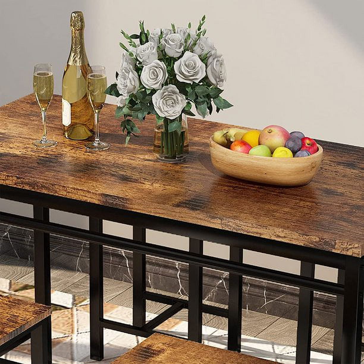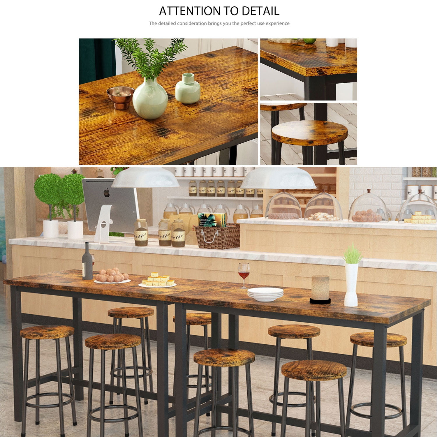 This bar table and chairs with prime quality rustic brown finish, it is a wonderful addition to your kitchen, game room, or living room.The black iron frame not only forms an appealing contrast to the wood tone but also serves as a practical footrest. The footpads not only increase stability but also prevent floors from scratch. Besides, the pads are adjustable so that the bar table set can be used even on uneven ground.