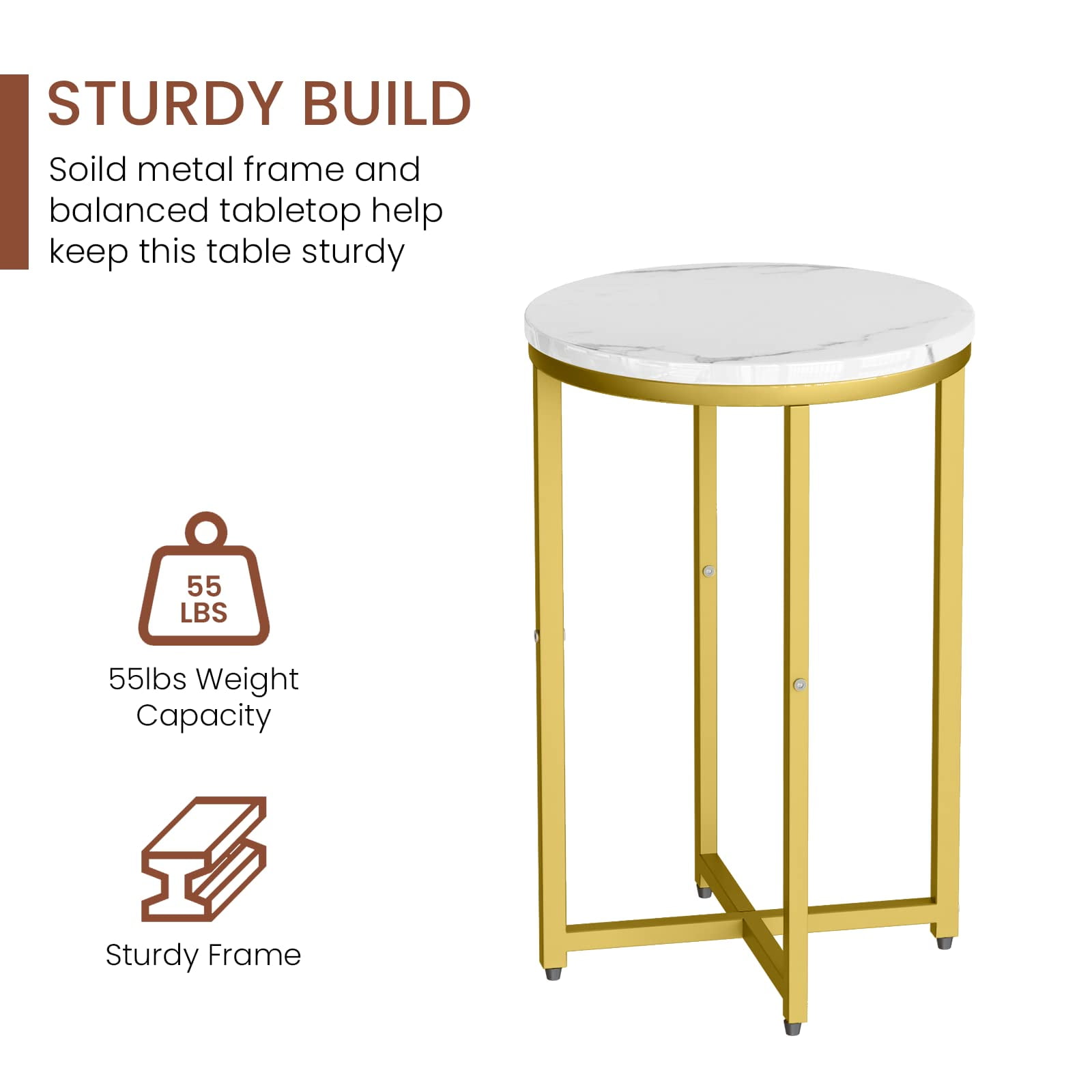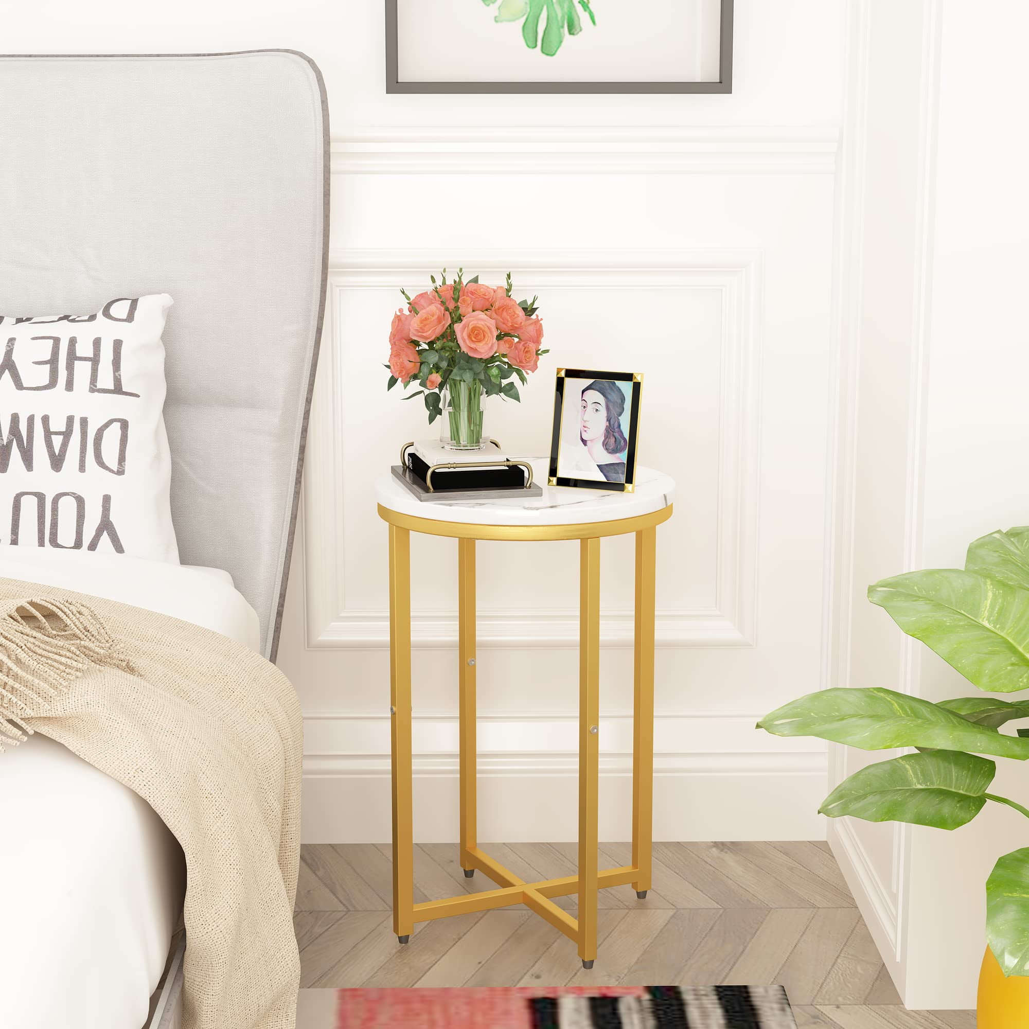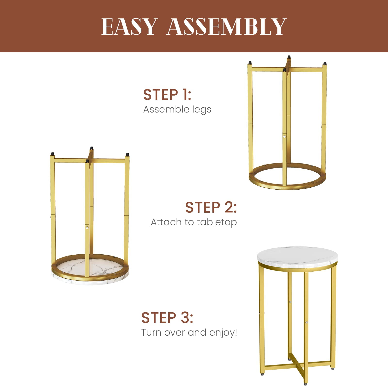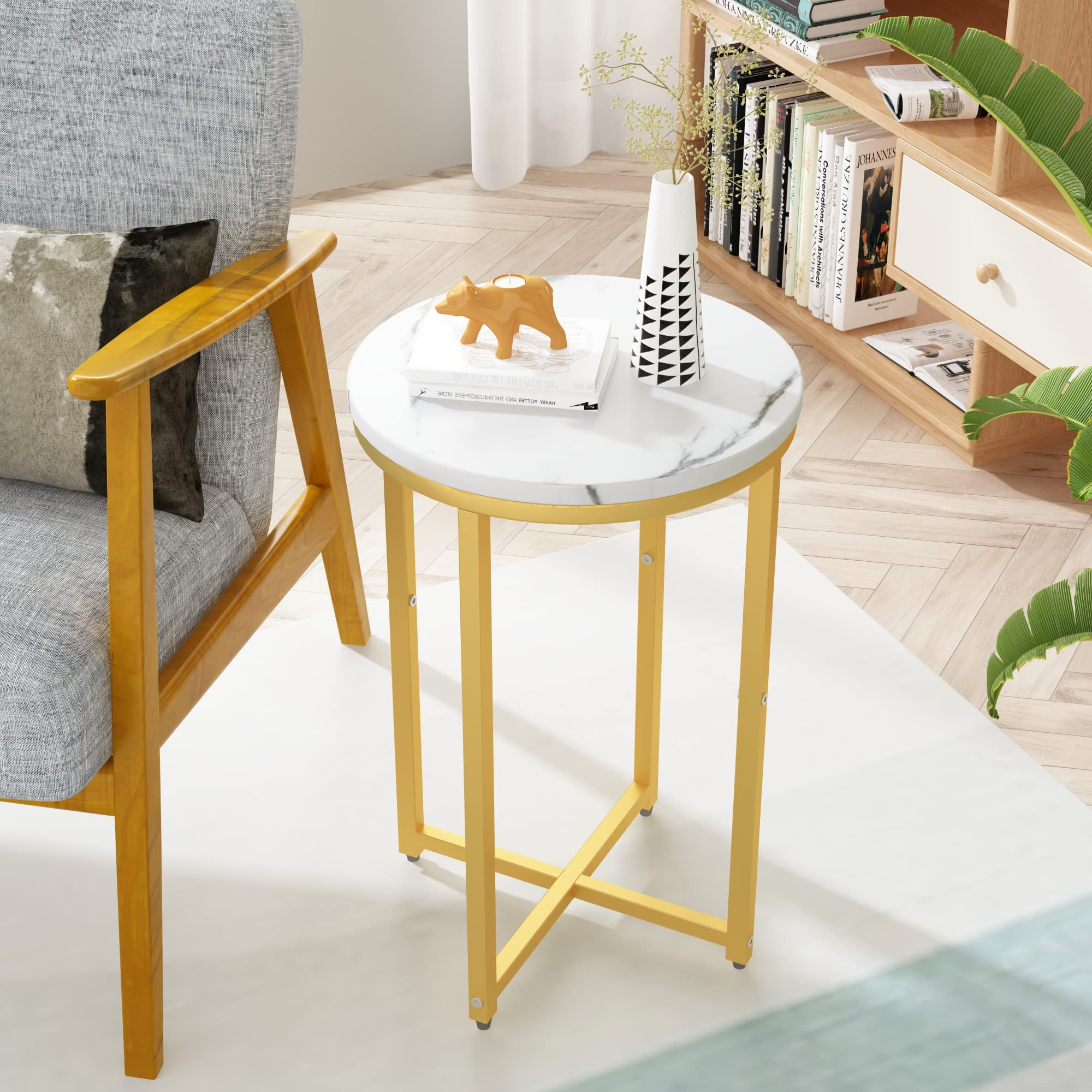 【X-SHAPED SMALL ROUND SIDE TABLE 】- The round nightstand is made of high quality MDF with powder-coated metal legs.Legs are connected with a cross design for maximum stability under a durable, laminate faux marble table top that holds up to 55 pounds, fusing durability with a modern-contemporary look. 【MODERN GOLD NIGHTSTAND】- The living room metal side table suitable for displaying book,magazine,coffee cup, perfect size for home decoration; round beside table for displaying cellphone,candles,photo and other things, A smooth frame and table top surface allow for effortless maintenance, so you can keep the table looking its best for years. 【MARBLE ROUND ACCENT TABLE 】- Designed with non-marking foot glides, this side table protects floors from scuffs, indentations, and other potential damages,The metal coffee table is the ideal side table for your living room, office, or bedroom. Its small size and clean lines will complement any interior design. 【BEDSIDE SMALL COFFEE TABLE】- Simple Stylish Design, the indoor round nightstand works Well As Beside Desk, Laptop Table, Sofa Side Table, Under Couch Table, Chair side Table, TV Tray for Eating ,Suitable for Any Decor Of Your Room. 【EASY TO ASSEMBLE】-All of the necessary accessories are included in the package. It will take about 15 min, then you can start enjoying your round end table. Any questions, please do kindly contact us, we will help you to solve in 24 hours. OVERALL DIMENSIONS: 15.75″(Dia) x 24.41″(H); Weight Capacity: 55 lbs.