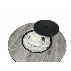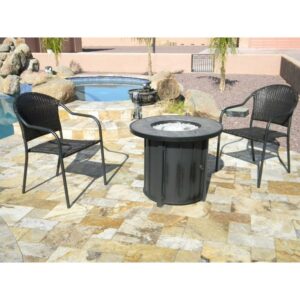 The AZ Patio Heater Propane Faux Wood Tile Top Fire Pit blends in beautifully with your outdoor seating area. The solid steel construction is incredibly durable and a black finish gives it a rustic look that suits outdoor living. An integrated ignition gives way to a propane heater that emits up to 40,000 BTUs of heat. Clear fire glass covers the burner and adds a touch of elegance. An easy access door located at the base allows you to conceal a 20 lb. propane tank (not included). And for your added safety, this fire pit comes with a thermocouple flame failure device. Measures 30L x 30W x 25H inches; CSA approved. Includes cover for burner area.