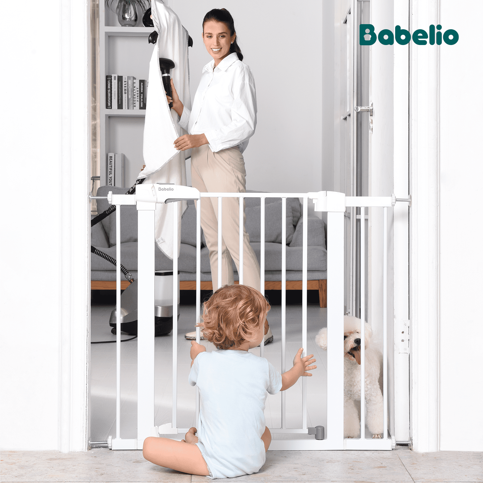 BABELIO 27-40″ Auto Close Baby Safety Gate, No Drilling Pressure Mounted Dog Gate for Stairs, Doorways, Outdoor (White)