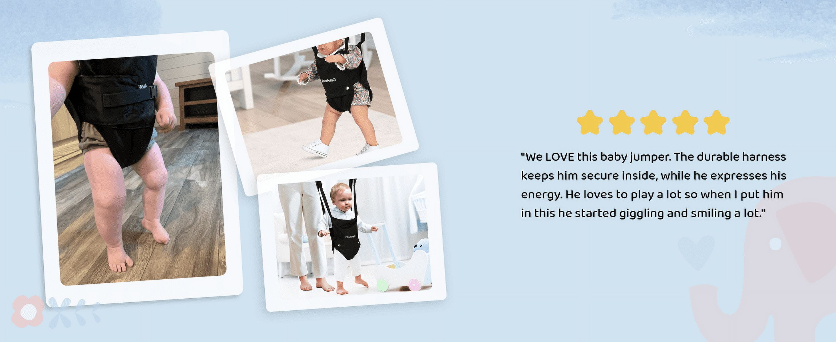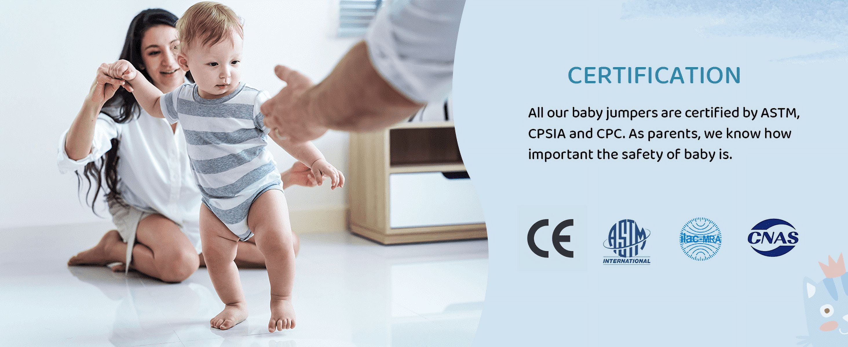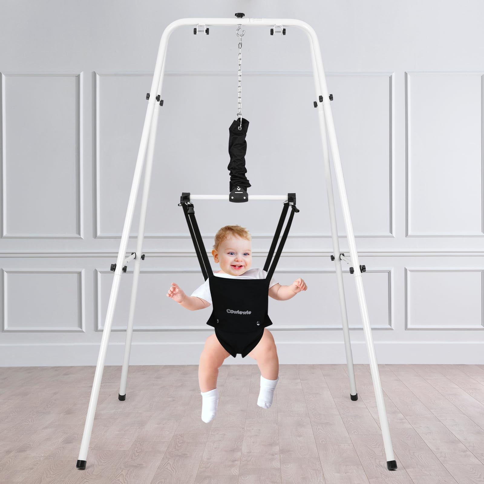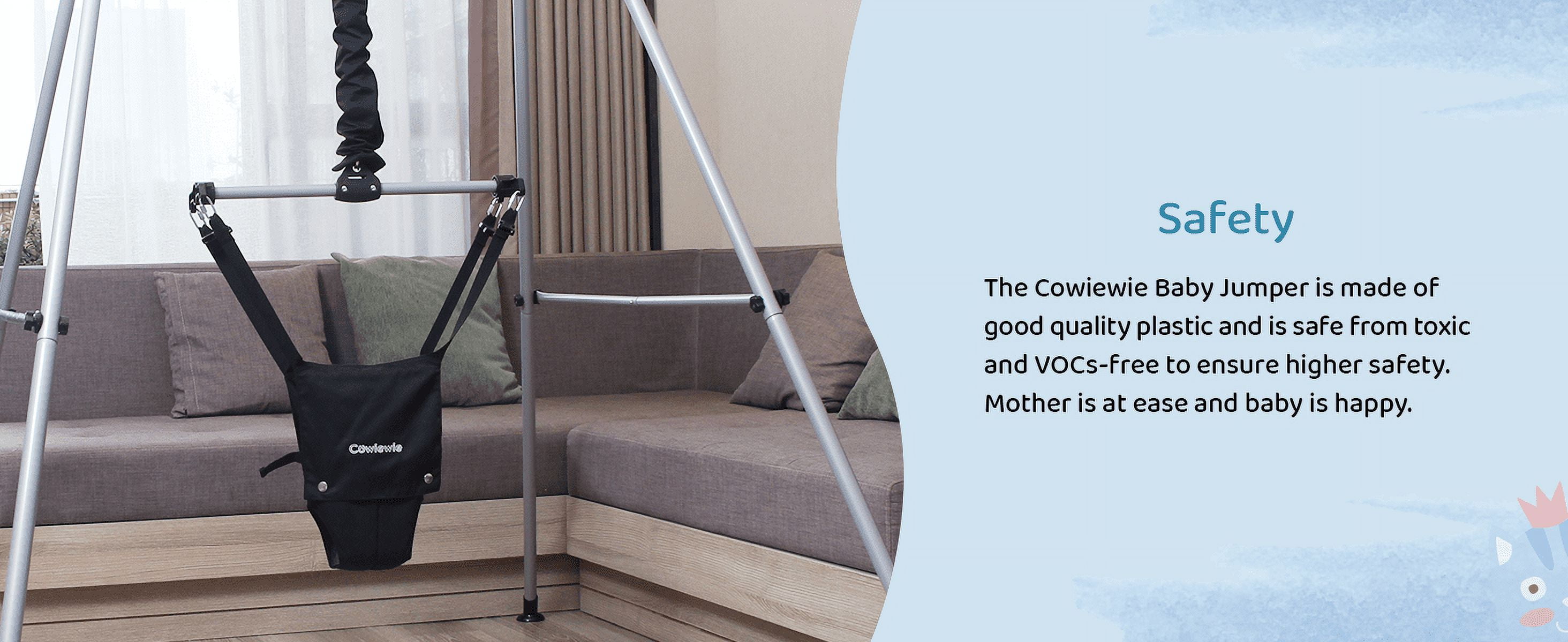 ➕【Multiple Comfort Feeling】The seat pad is breathable 3D mesh design and mutiple-layer cotton, no worry hurt inner thighs. The wide and firm velcro seat belt and jumper height is adjustable, as your baby gets taller(Chain adjustable up to 16in) ➕Helps supports baby’s spine firmly, ensuring correct, upright posture during exercise. Even a big baby easily has room to bounce. So you can ensure your baby’s feet are optimally positioned on the floor for proper development. 【2 in 1 Baby Exerciser and Handheld Walker Helper】When your children too young to walk, the standing jumper helps infants build balance, develop coordination and rhythm, as well as strengthens leg muscles. Also baby gets tired from all the jumping so sleeps better. When your children start learning to walk, just take down the seat pad, then add it with a hand-held walker, you can easily assist your baby’s walking without breaking your back ➕【Multiple Safety Support】This baby jumper is a lot safer than the one that you just hang above the door, no risk of child running into the door frame and getting hurt ➕Compared to others, we upgrade double iron chain hook, add the safety rope in the stainless steel spring, add cloth cover to the outside of the spring to prevent the hand from being pinched. The outer triangular frame is aslo so stable that it is difficult for even an adult male to shake it. Absolutely protect your baby safety! 【Easy Assemblely and Portable】 Clear and detailed instructions, you only need no more than 10 minutes to assemble it. As well as fold up when finished. Assemble size: 40.15x 42.9in, package size: 27.9×13.5×3.7in, package weight: 15.5lb Because of its simple fold-flat design, perfect for on-the-go use, whether that is to grandma’s house or on your next camping trip. It will fit in the trunk of your car while still allowing you enough room for your other luggage. ➕【Warm Tips】The jumper can hold up to 50lb (22kg), suitable for 6-24months infant. Expert suggest that a baby can start using a jumper once they have strong, independent head control. 【Great Entertainment for Happy Childhood 】Jumpers provide great fun for babies and a break for parents. Mom working next to her, quietly enjoying her “me time.” It allows the baby to turn around and watch you as you clean house etc and gives the baby independence to move and turn and jump. Let baby see the world from a new perspective. Hearty chuckles and big smiles whenever baby in it. Nothing sweeter than the sounds of a happy baby getting exercise ➕【Easy to Clean】Soft seat pad is removable and washable,very convenient, no need to worry about cleaning ✅【ASTM Certification】ASTM F963-17 Standard, meet Consumer Safety Specification for Toy Safety ➕Pipe diameter:25mm