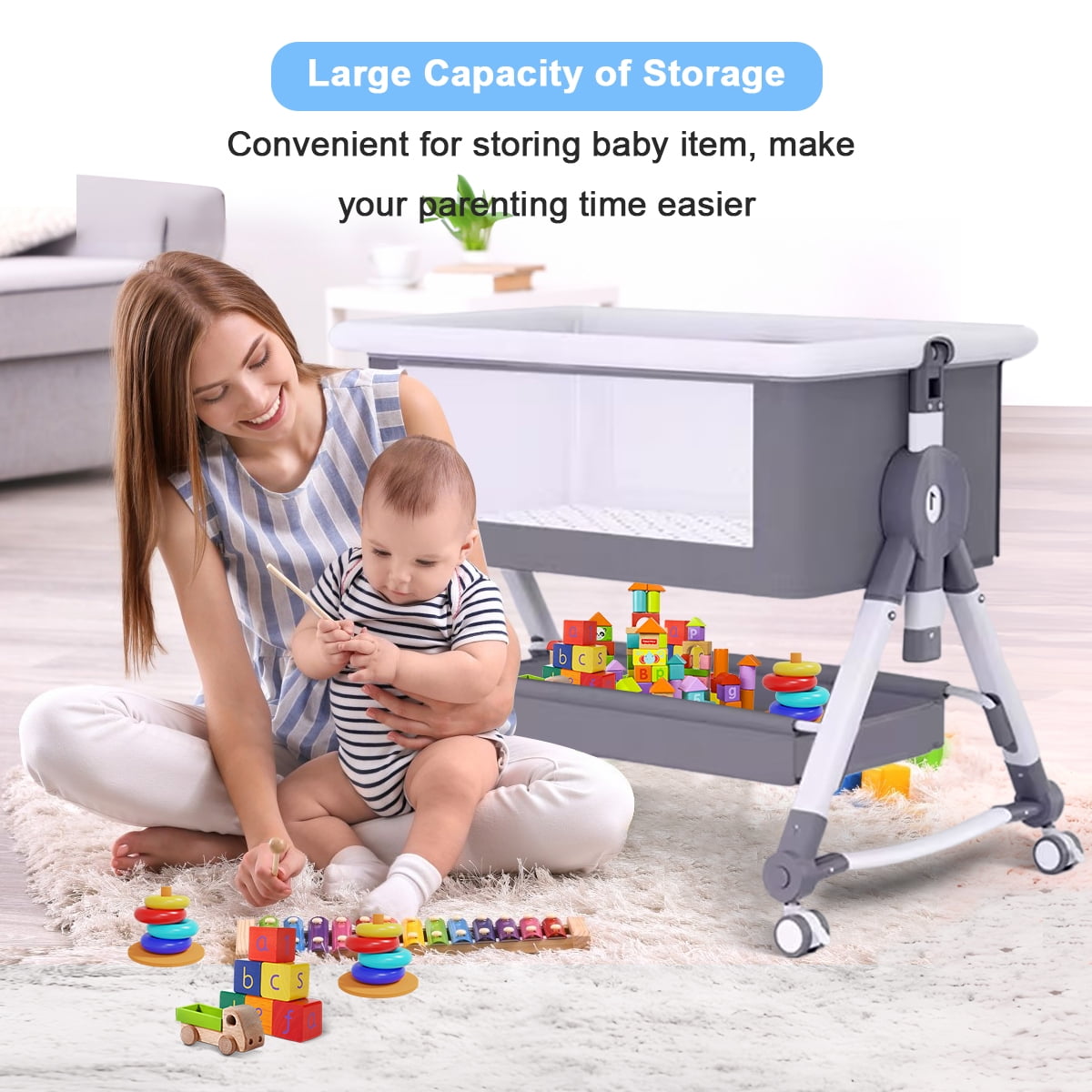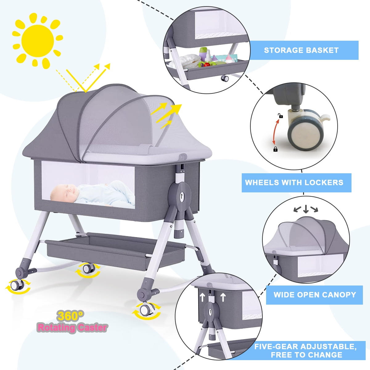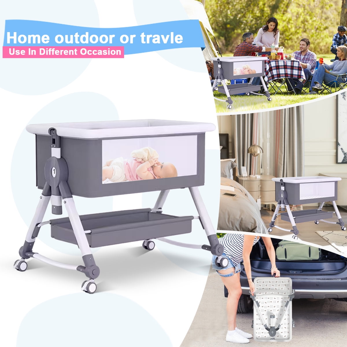 Bassinet & Crib Modes -The Splicing Big Bed is Opened on the Side, Close to the Big Bed at Zero Distance, Convenient for Taking Care of the Baby at Night.Cradle mode allows your baby to be relaxed. Adjustable Height – It is Suitable for Big Bed, and the Height of the Crib Can Be Adjusted on 5 Levels, Which Can Easily Adapt to the Height of a Big Bed and Mother, Making It More Convenient to Use. Silent Universal Wheel – Free to Push, Equipped with Casters, Universal Push, Easy to Move with Brakes, Stable Cot Without Running Around. With Storage Basket – There is a large storage basket under the bassinet that fits baby essentials like diapers, wipes, clothes. Lightweight design, easy to carry, and perfect for travel. Breathable Mesh and Easy to Clean – This breathable fabric is also made to promote airflow, giving the baby a cooler and comfortable space to rest. The mattress cover and all crib fabrics are easy to remove and clean, creating a clean environment for the baby.