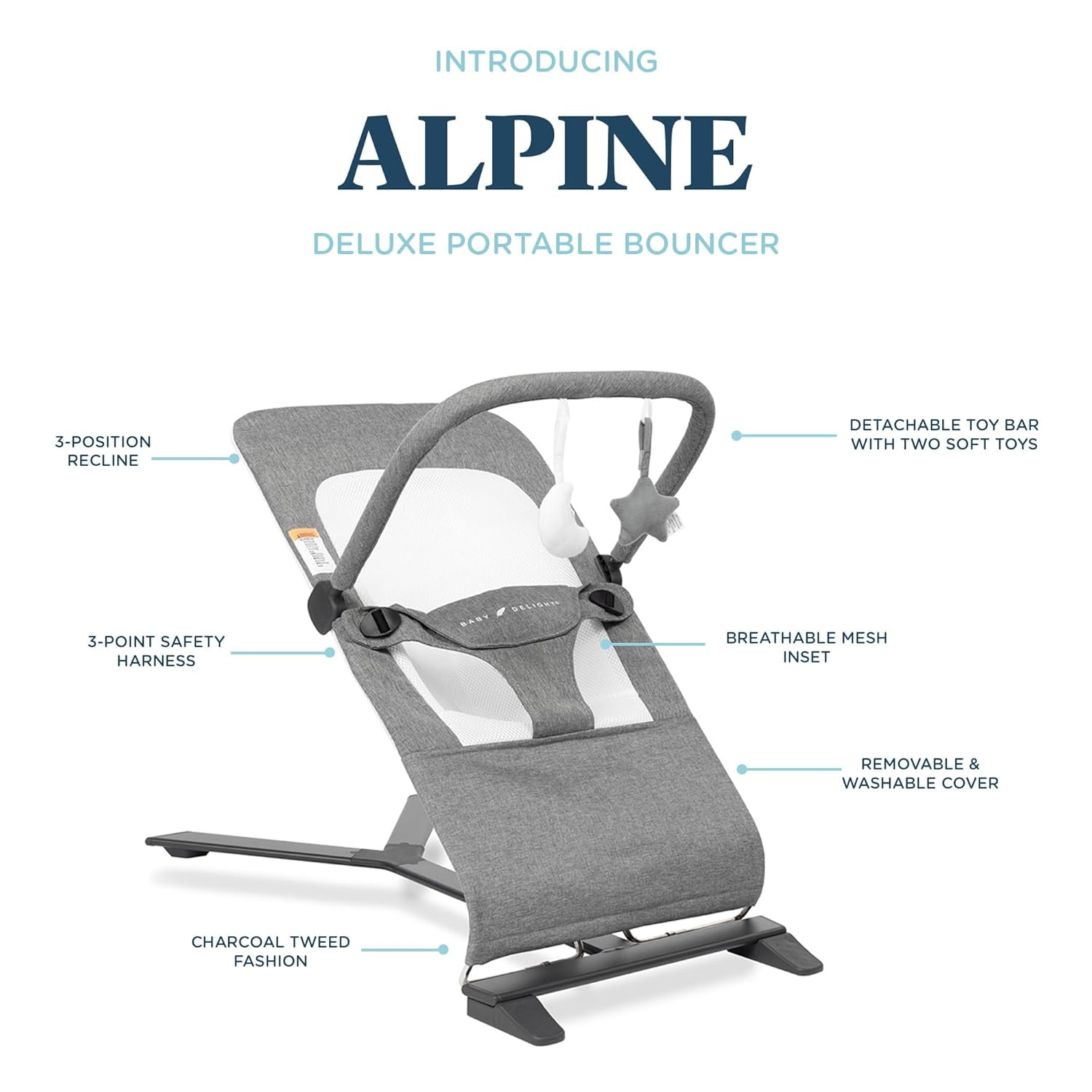 Sit, play, relax, and do it all in style. TheBaby Delight Alpine Deluxe Portable Baby Bouncer, for Infants 0-6 Months, (Charcoal Tweed Color) comes with an included carry bag for convenient travel and storage. The seat cover, featuring a breathable mesh inset, can be removed for machine washing. While bouncing naturally, the strong, lightweight frame offers 3-positions of recline for baby’s comfort. The 3-point adjustable harness keeps your baby securely in place during meals or playtime. The removable toy bar provides adorable deluxe plush toys for your baby’s entertainment.