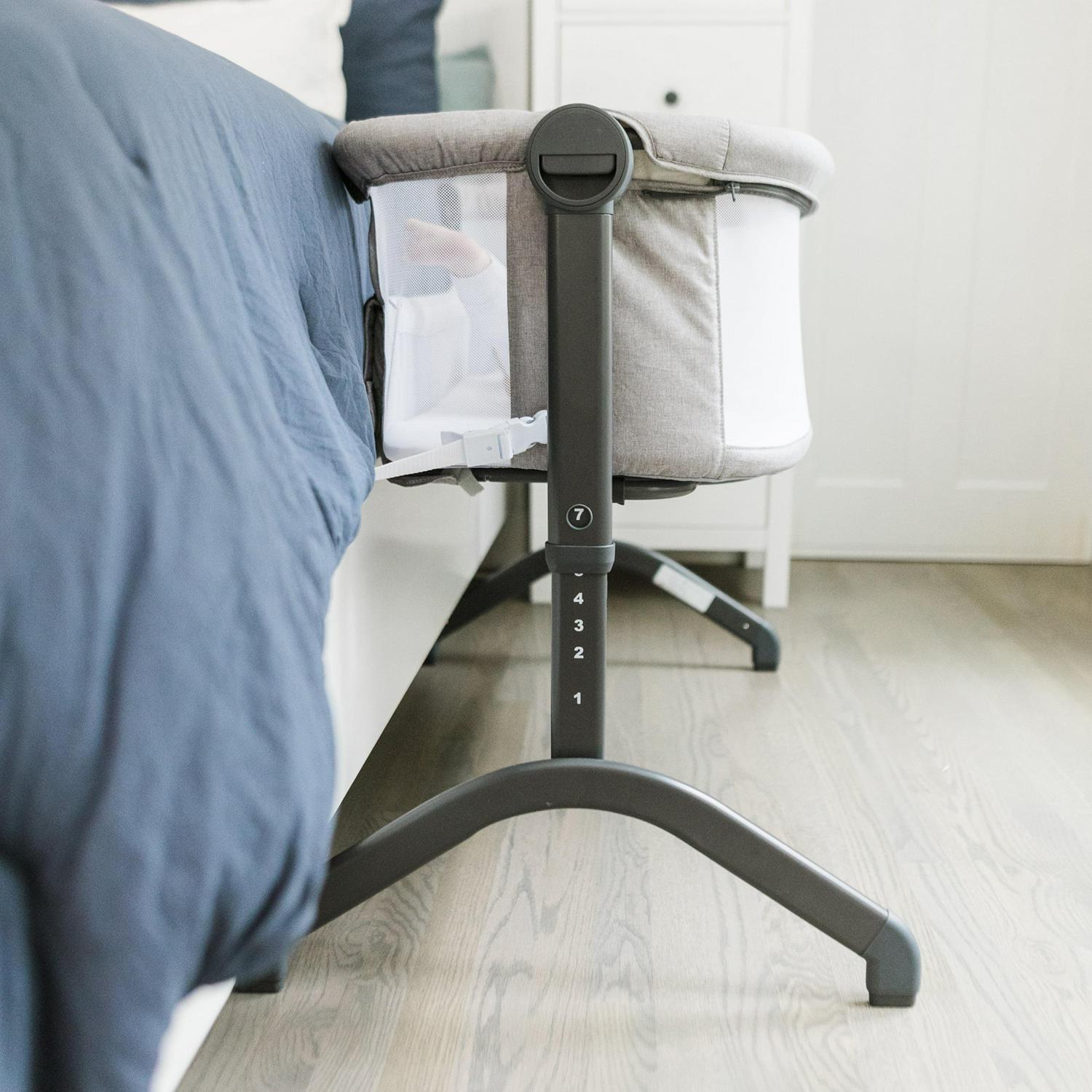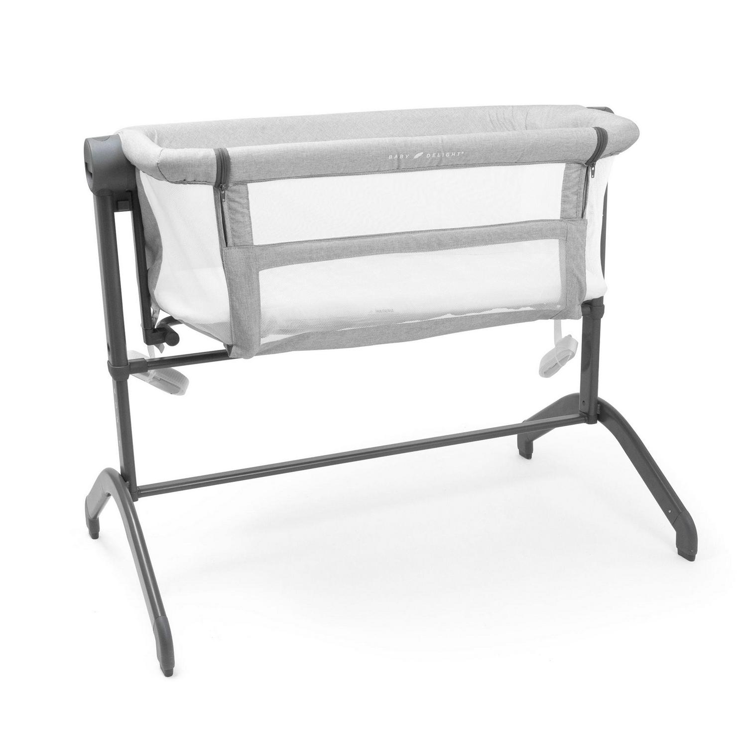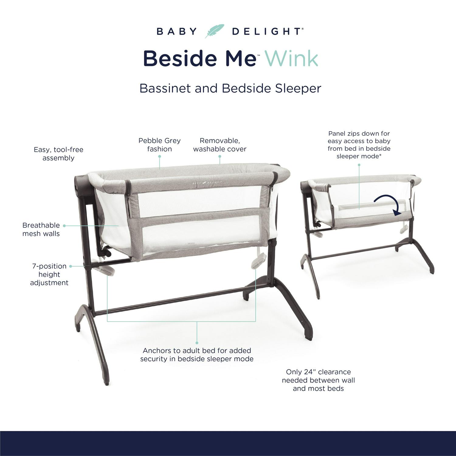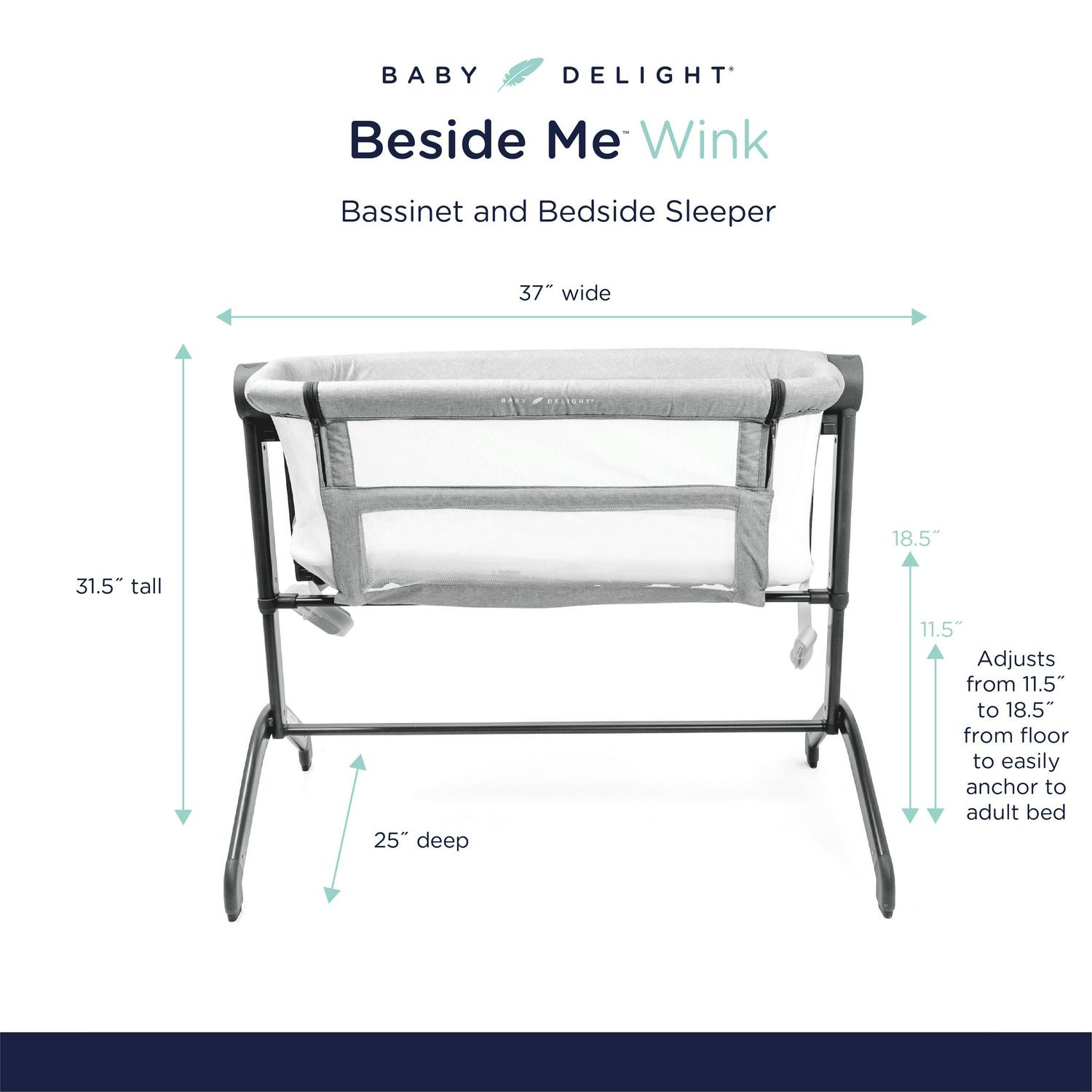 Sleep soundly knowing that your baby is safer and comfortable in the Baby Delight Beside Me Wink Bassinet & Bedside Sleeper in Light Gray Fashion. In the Bassinet mode, your little one is surrounded by breathable mesh walls that keep air circulating while providing her with her own private sleeping area. It is lightweight enough to move from room to room for convenience. For Bedside Sleeper mode, simply unzip the side panel closest to your bed and snug the Beside Me Wink right up to the side. The attached straps safely secure the Bedside Sleeper to your adult bed, ensuring it stays snug and in place. Easily lean over to nurse, comfort or just check on your baby during the night, knowing she is right there beside you. For added comfort, the 7-position height adjustment can be used to adapt the sleeper height to most adult beds.