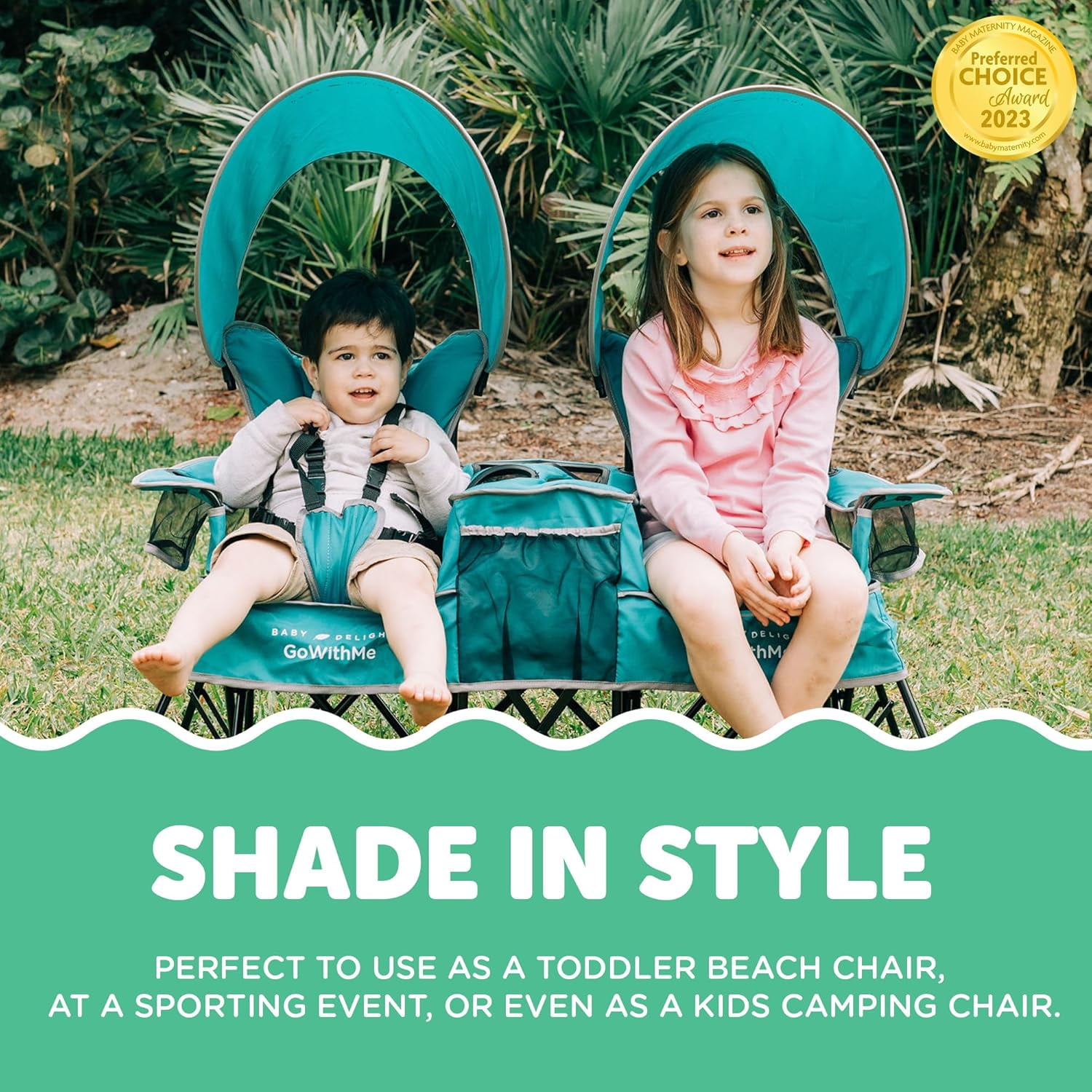 Go With Me™ Duo Deluxe Portable Double Chair – Teal The Go With Me™ Duo Deluxe Portable Double Chair is perfect for twins, siblings, or besties! This one-of-a-kind chair unfolds to reveal two separate seating areas for little ones ages 3 months – to 75 lbs. Added safety features include a strong, stable flared leg system, as well as locking mechanisms and a 5-point safety harness on each seat (which can be removed as the children grow). For outdoor adventures, two removable sun shades can be added quickly and easily. The built-in cup holders are sure to come in handy for bottles as well as sippy cups. And for storing snacks, toys, or books, easily accessible storage pockets are included between the two seats. When it’s time to get up and go, simply fold the Duo up and place it into the included storage bag. Ready? Set. Adventure, together! Unisex product.