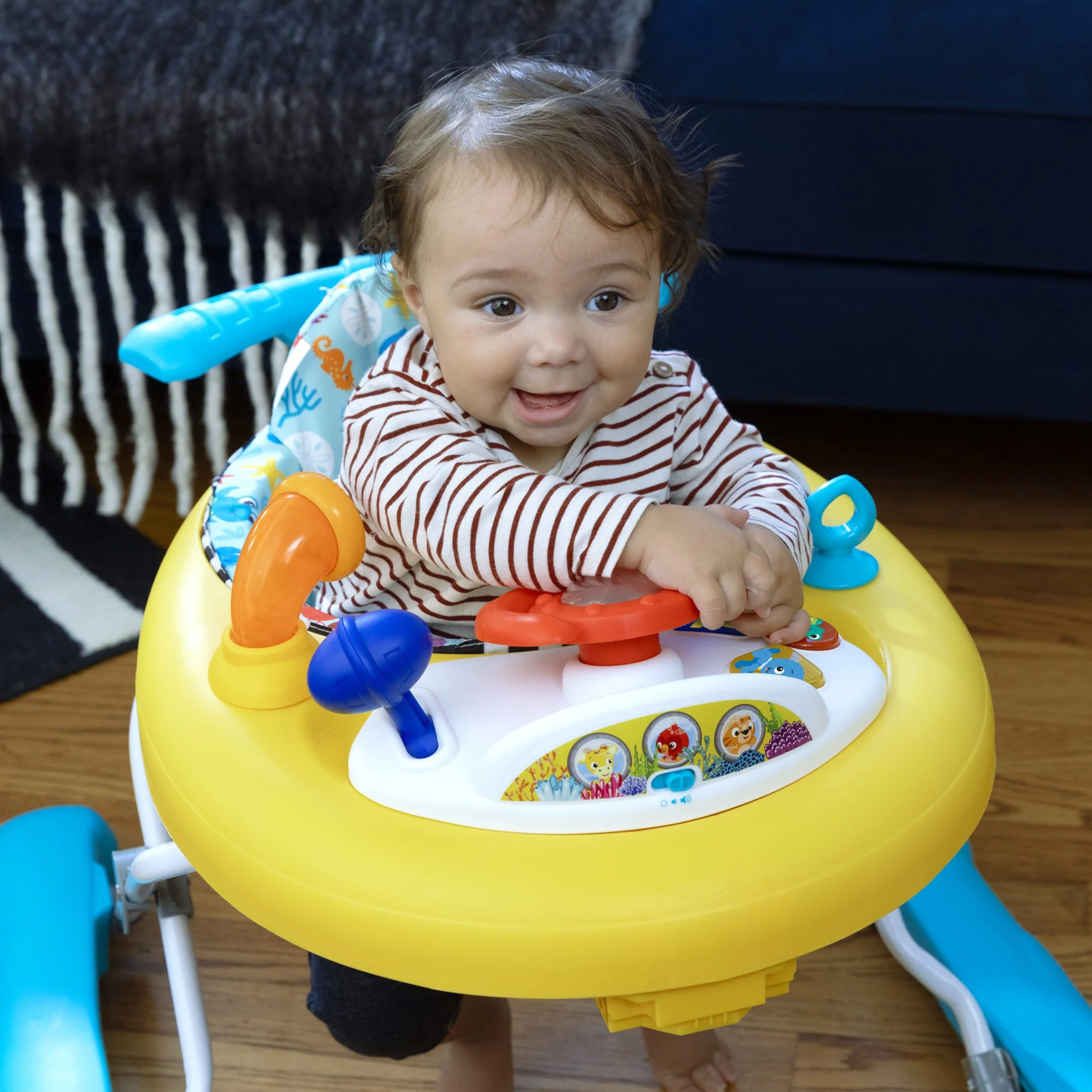 Support babys first steps and early learning with the Baby Einstein Ocean Explorers Dive & Discover 3-in-1 Submarine Walker. With 3 height positions and 3 ways for baby to play and learn, infants 6 to 24 months will love to explore the sights and sounds of the sea in this submarine-themed walker. Sit-In Walker supports smaller babies. As baby grows, use Push- Behind Walker function to support independent walking. Ready for floor play? Detach the electronic toy station to let baby learn at home or on-the-go! Each press teaches colors, shapes or plays 20+ ocean sounds and melodies to encourage cause-and-effect learning. Fully foldable. Machine washable seat pad. Sit-in Walker supports infants up to 26 pounds or until baby can walk independently. Assembled dimensions: 19.5. x 28.6 x 25.4 inches. Requires 3 AA batteries