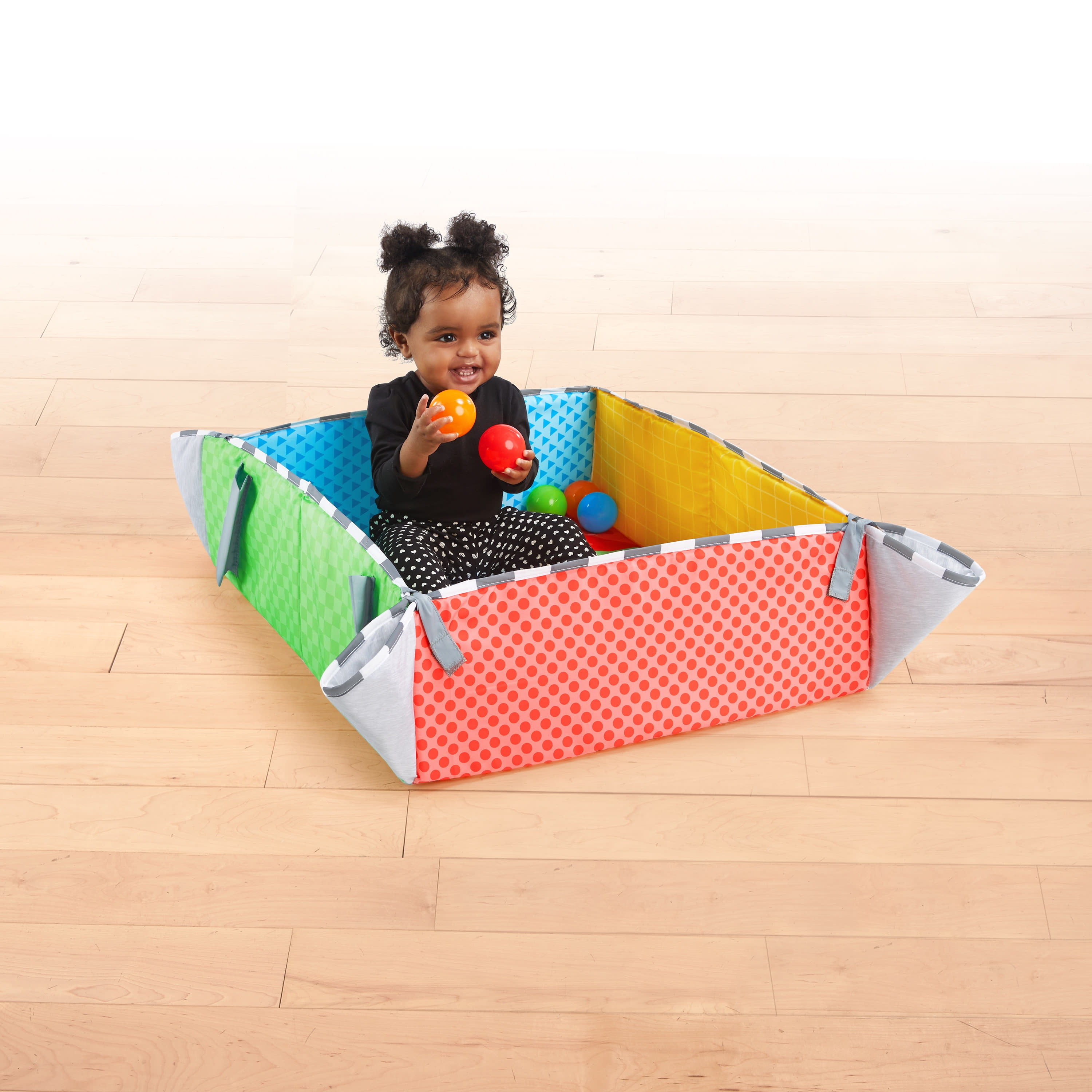 Color wheels, colorful characters, and patterns inspire your baby’s inner artist 5-in-1 adjustable play environment grows with baby through developmental stages Includes 5 detachable take-along toys and a tummy-time prop pillow More than 20 minutes of melodies encourage music appreciation and auditory development Sides fold up to create a ball pit or lay flat for a 47” jumbo-sized mat