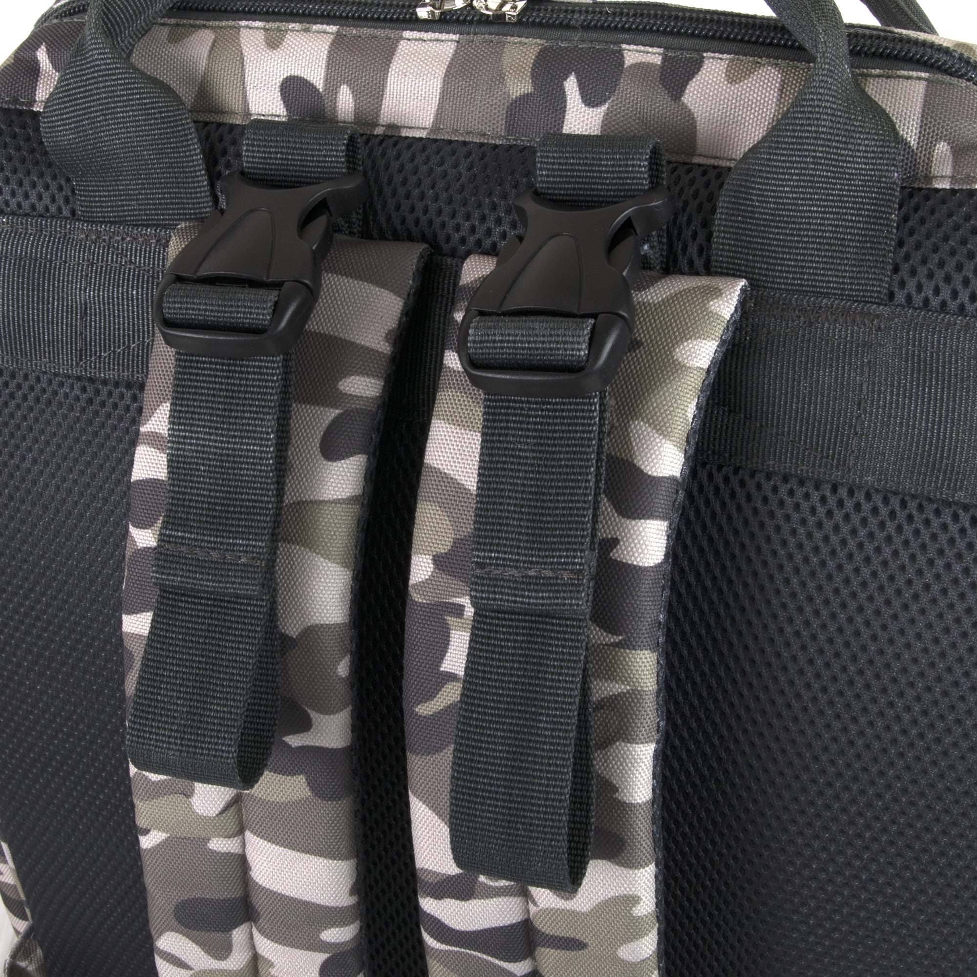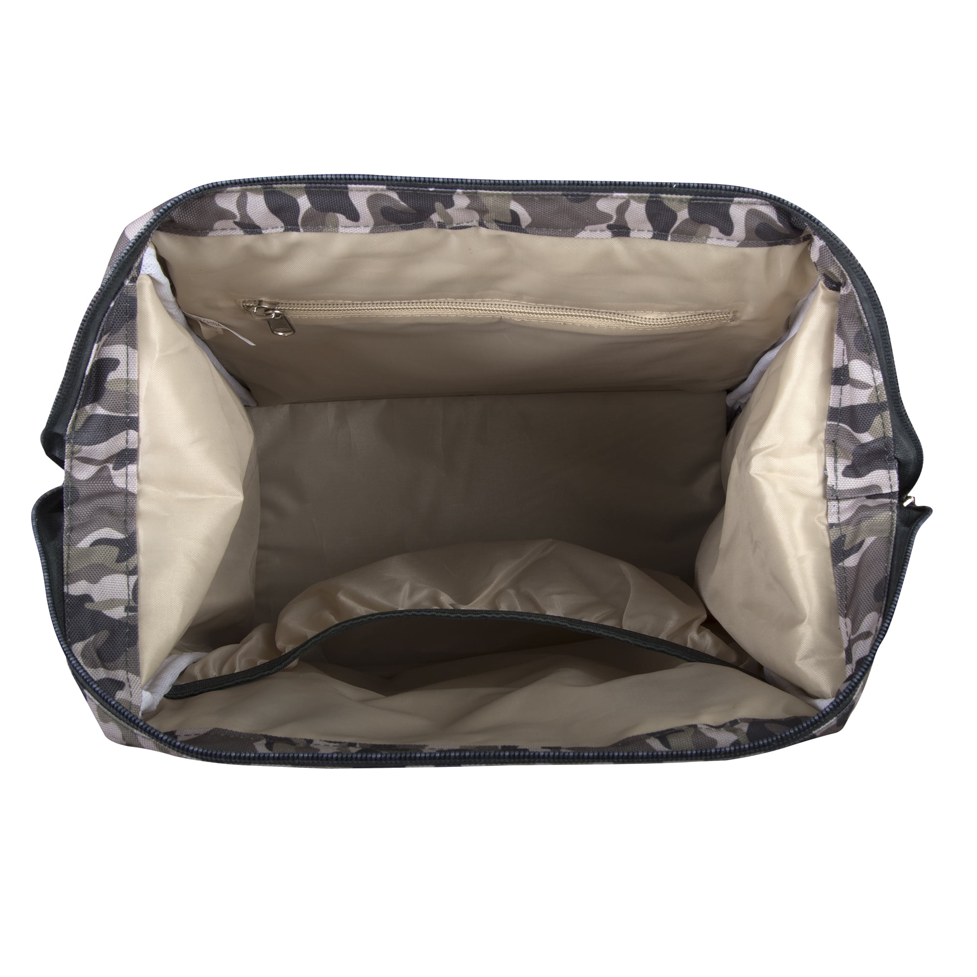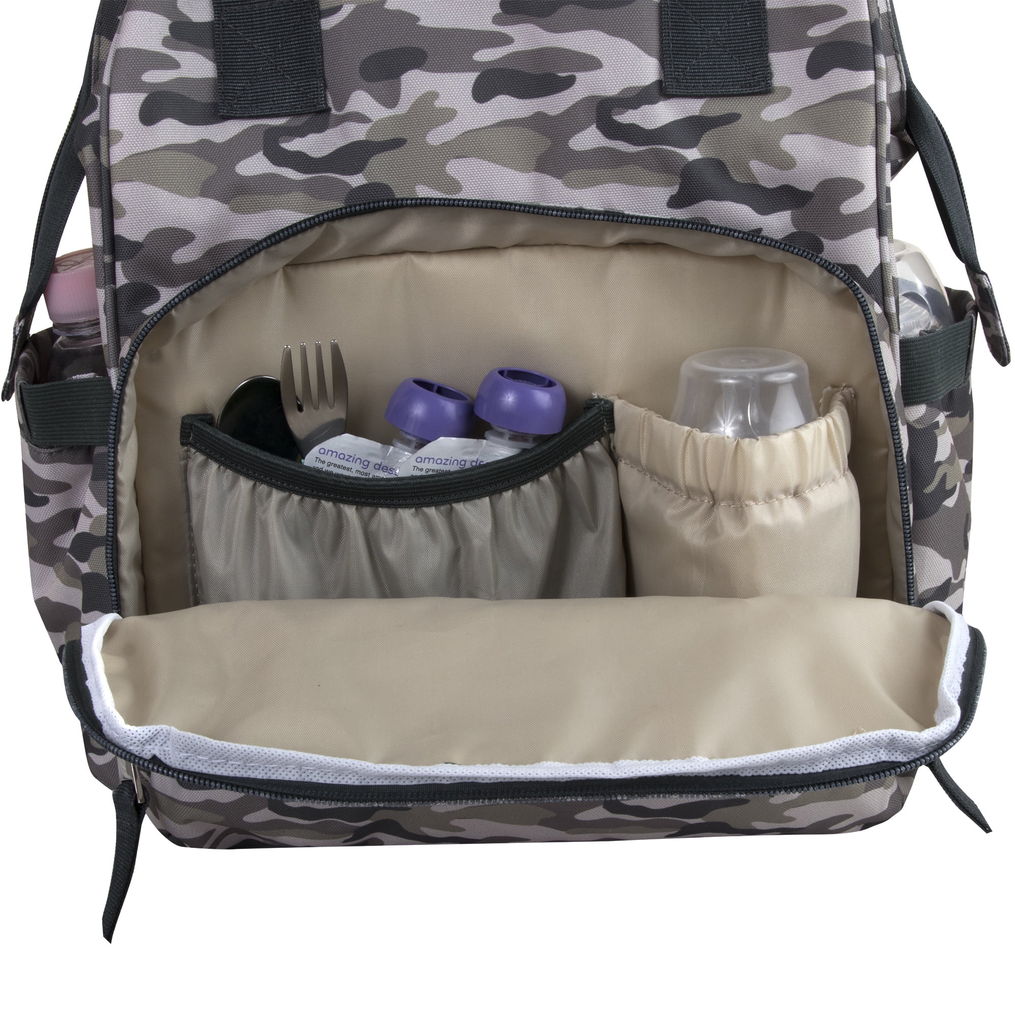 On-trend camo print frame backpack is a great value, combining fashion with function. Featuring 7 amazingly roomy pockets, easily tote or carry all baby needs. Tuck diapers and other necessities into the front zip pocket, and store wipes, powder, or even a drink in its deep side pockets. Store clothes, shoes, and snacks inside its spacious interior, and slip books or electronics in its inner pocket, too! You will not believe how lightweight and versatile this bag is. It can even be hooked to strollers with its adjustable length stroller straps. It comes with a wipe-clean padded changing pad, so changing baby anywhere is clean, safe, and easy. This modern diaper bag has it all.