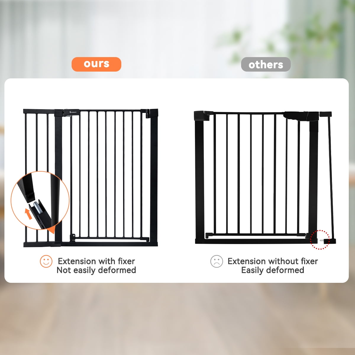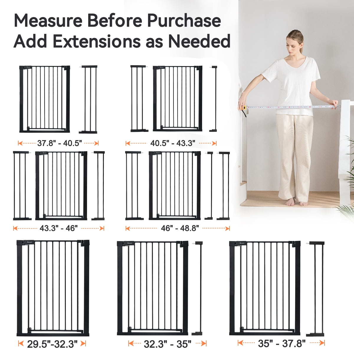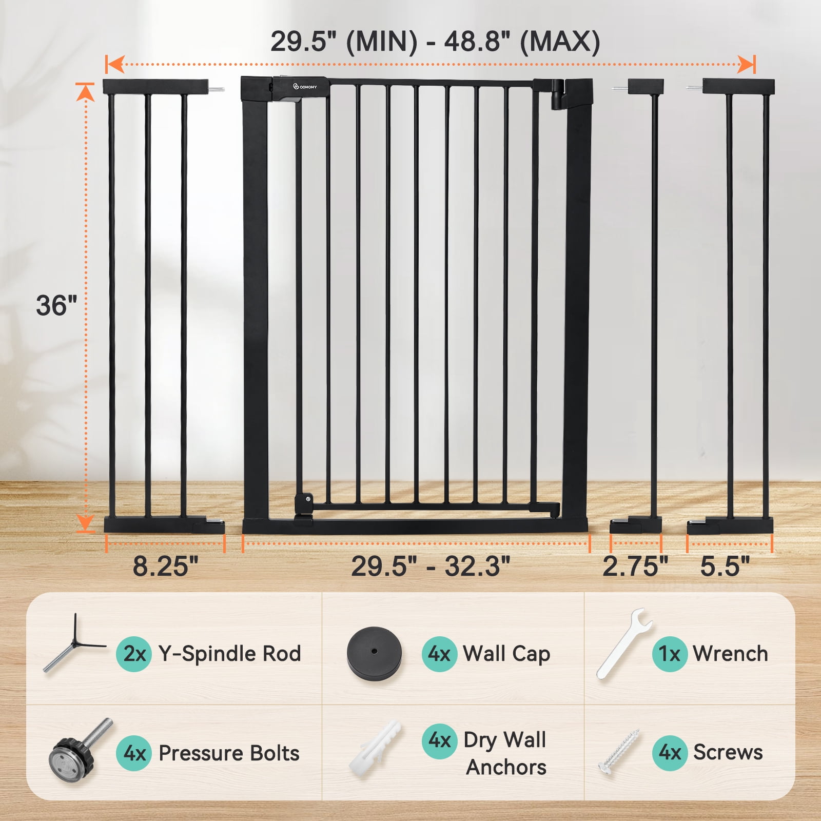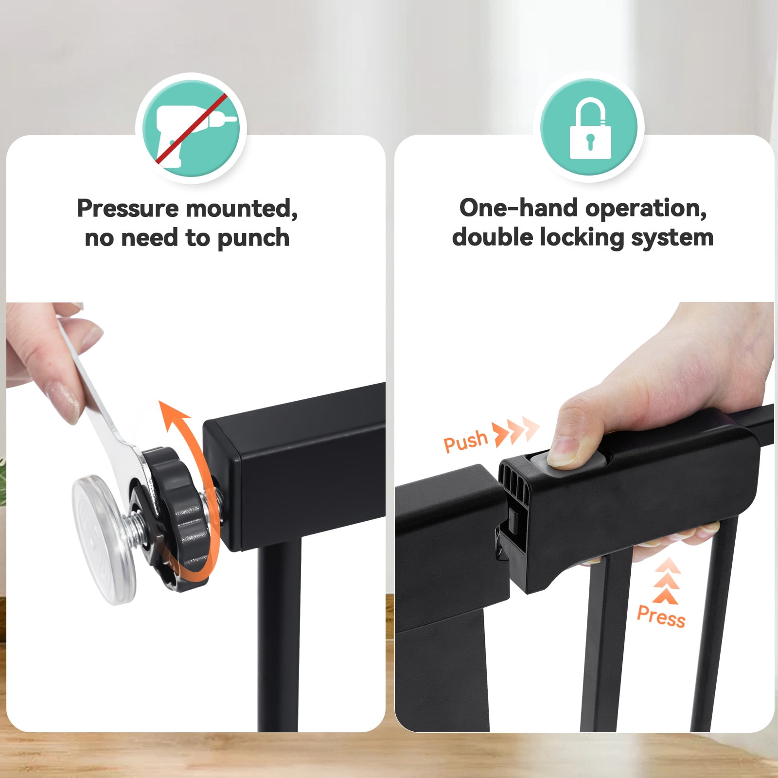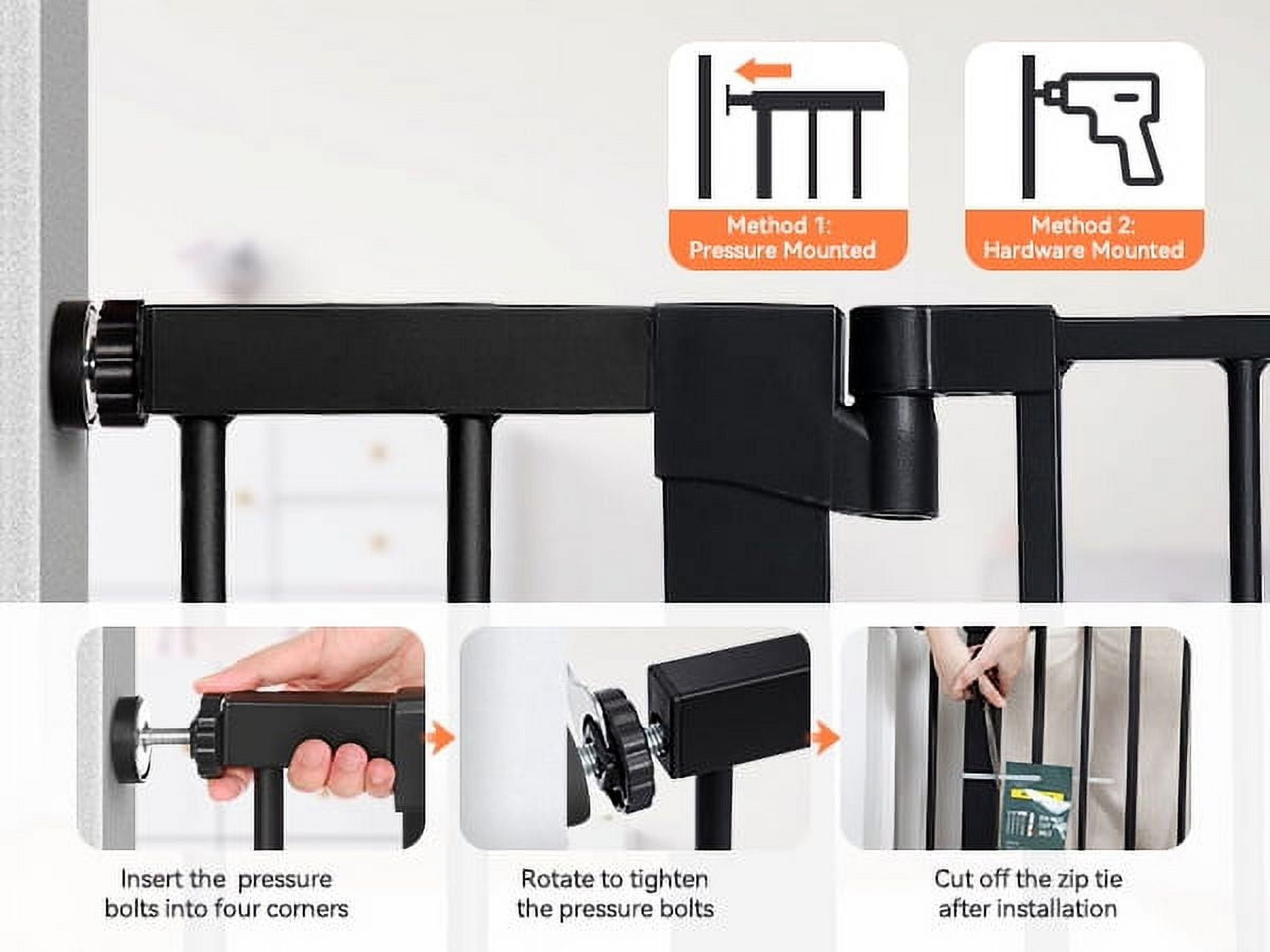 Height Advantage: 36-inch tall gate prevents energetic pets from jumping over it, ideal for multi-pet households. Double-lock System: The push, press, and lift locking mechanism ensures added safety for your child and pets. Auto-Closing & Wide Opening: Facilitates one-handed operation when carrying a baby, closes automatically when opened less than 90°, and stays open for walk-thru and housework when opened at 90°. Effortless Installation: Pressure-mounted installation doesn’t require tools or drilling, making it simple to install based on the provided user manual. Durable Construction: Made of steel that can withstand high impacts of up to 100 lb, maintaining safety and durability. Specifications: Available in black and white, the gate spans from 29.5″ (min) to 48.8″ (max), with a gate length of 23.6″.