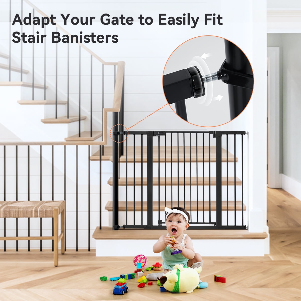 The Extra Tall Baby Safety Gate is made to keep children and pets safe. It’s 36 inches tall, so pets can’t jump over it. You can use it in spaces from 29.5 to 48.8 inches wide, like stairs, doorways, or hallways. It has a double-lock system for added safety, and it even closes by itself. The gate can open 180°, so you can easily walk through with your child. Made of strong steel, it can handle bumps and knocks up to 100 lbs, making it sturdy and safe.