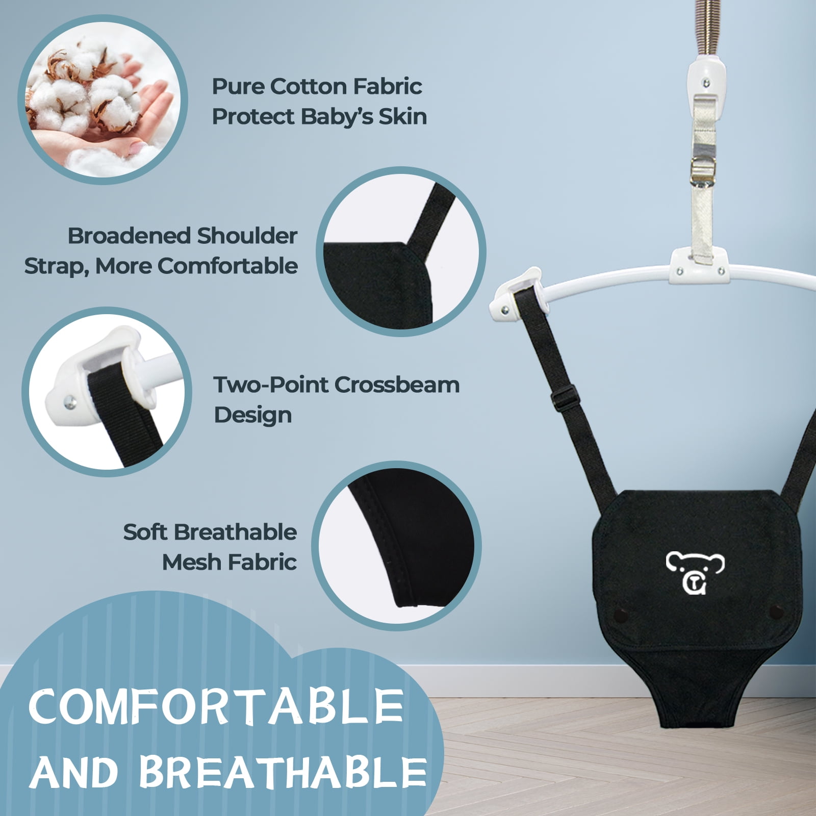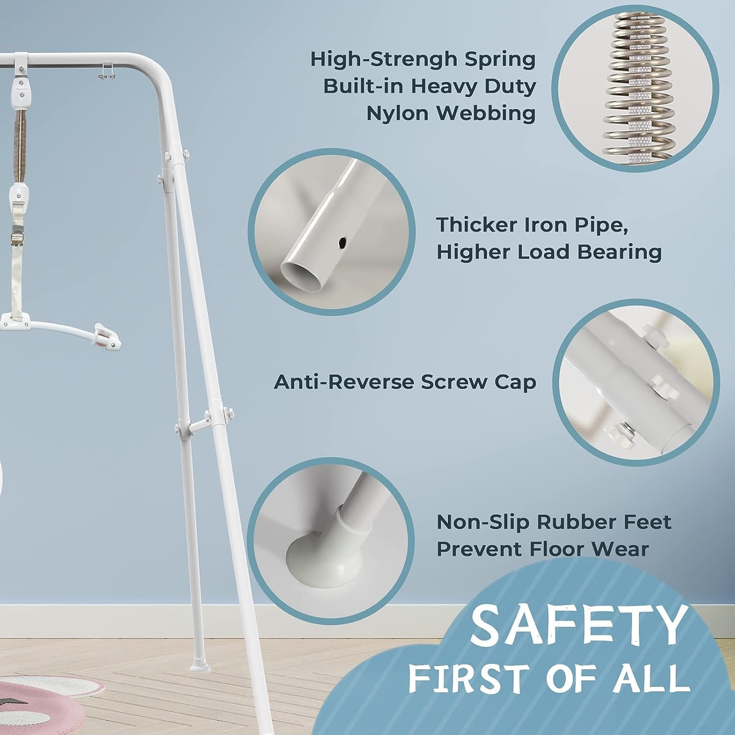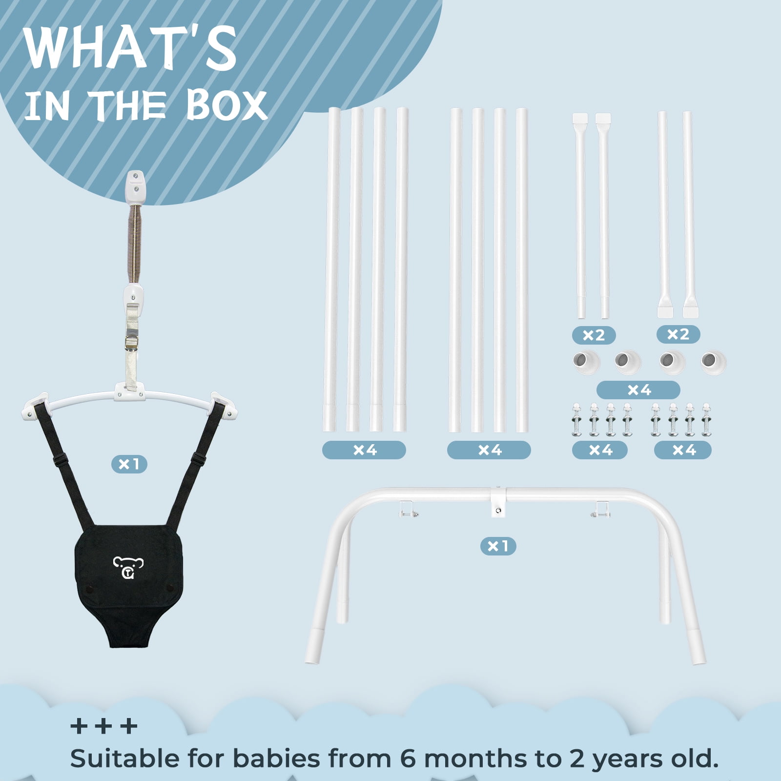 G TALECO GEAR Baby Jumper is designed with high quality materials to provide a safe and secure environment for your little one. Watching your baby bounce up and down freely, your baby will have fun while developing coordination, rhythm, building muscle strength and improving balance. This white baby jumper and bouncer features a portable frame that measures approximately 61.02 inches in height, making it perfect for homes without door frames, and it folds flat for easy storage. Product Dimensions: 61.02″D x 37.01″W x 61.02″H Frame Material: Metal Maximum Number of Compatible Seats: 1 Maximum Weight Recommendation: 50 lbs The Age Range: 6 to 24 months old (for Toddlers and Infants) Gender Range: Unisex Easy to Fold and Assemble