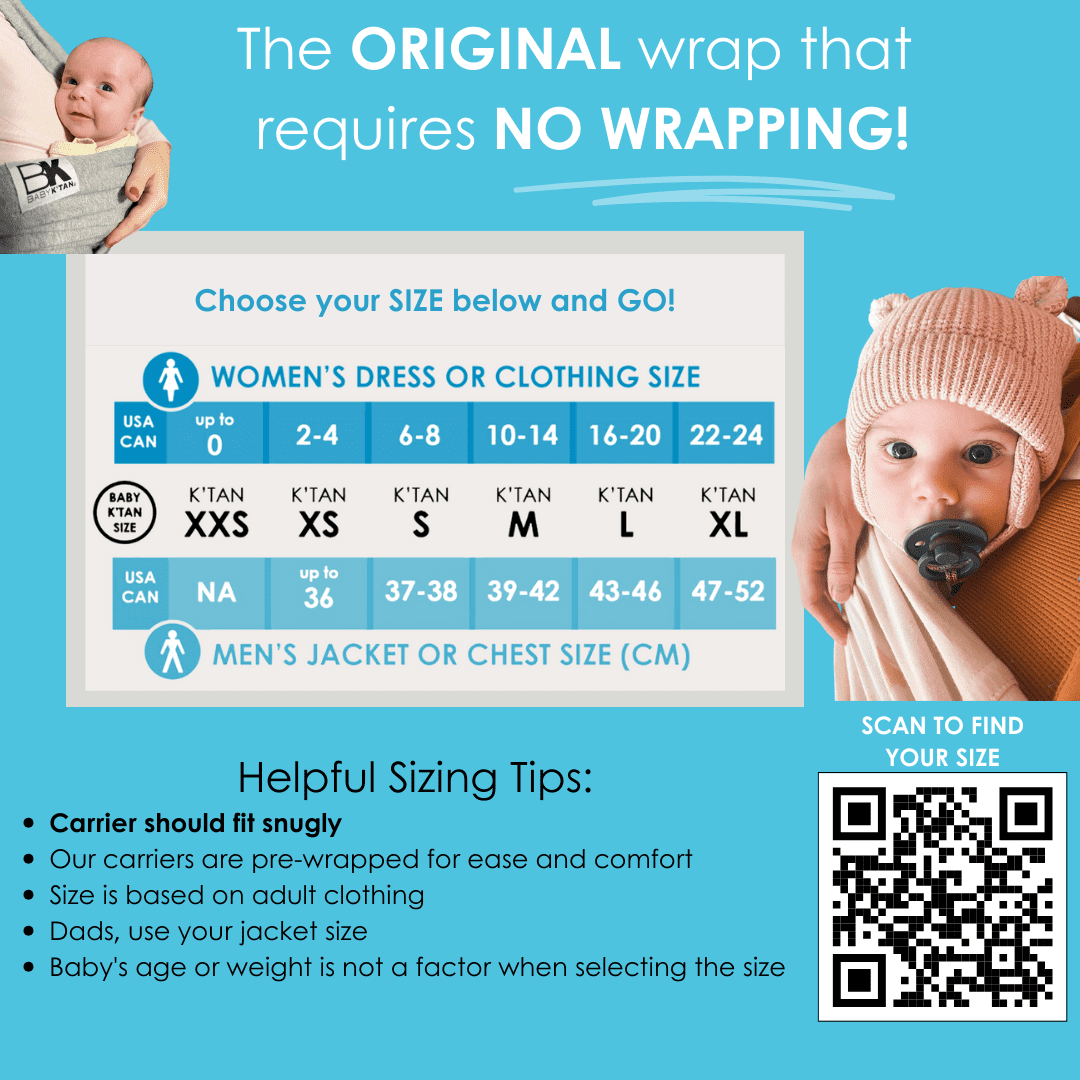 ACTIVE BABYWEARING: Carry your newborn, preemie or infant when on the go! Our design is simple, comfortable and practical for active parents. (If under 8 lbs, consult healthcare professional). THE NO-WRAP WRAP: The Baby K’tan baby wrap is quick and easy to wear – no rings, belts, buckles or excess fabric to cause frustration. Just slip the infant carrier sling over your head like a t-shirt. TEMPERATURE CONTROL: Made from a breathable hi-tech performance fabric, the baby carrier wicks away moisture and sweat to keep both parent and infant cool and comfortable in warm weather. SUMMER FUN: The infant holder blocks over 90% of the sun’s harmful UVA and UVB rays, making the baby sling ideal for keeping sensitive newborn and preemie skin safe in the summer. MULTI-POSITIONAL: Our infant carrier wrap supports the best hip-healthy positions for your baby from sling wrap for newborns & preemies to an upright seated carrier for infants up to 35lbs (If under 8 lbs, consult healthcare professional). Pre Wrapped and Ready to Wear. CHECK SIZING CHART Performance Fabric! Perfect for warm weather climates