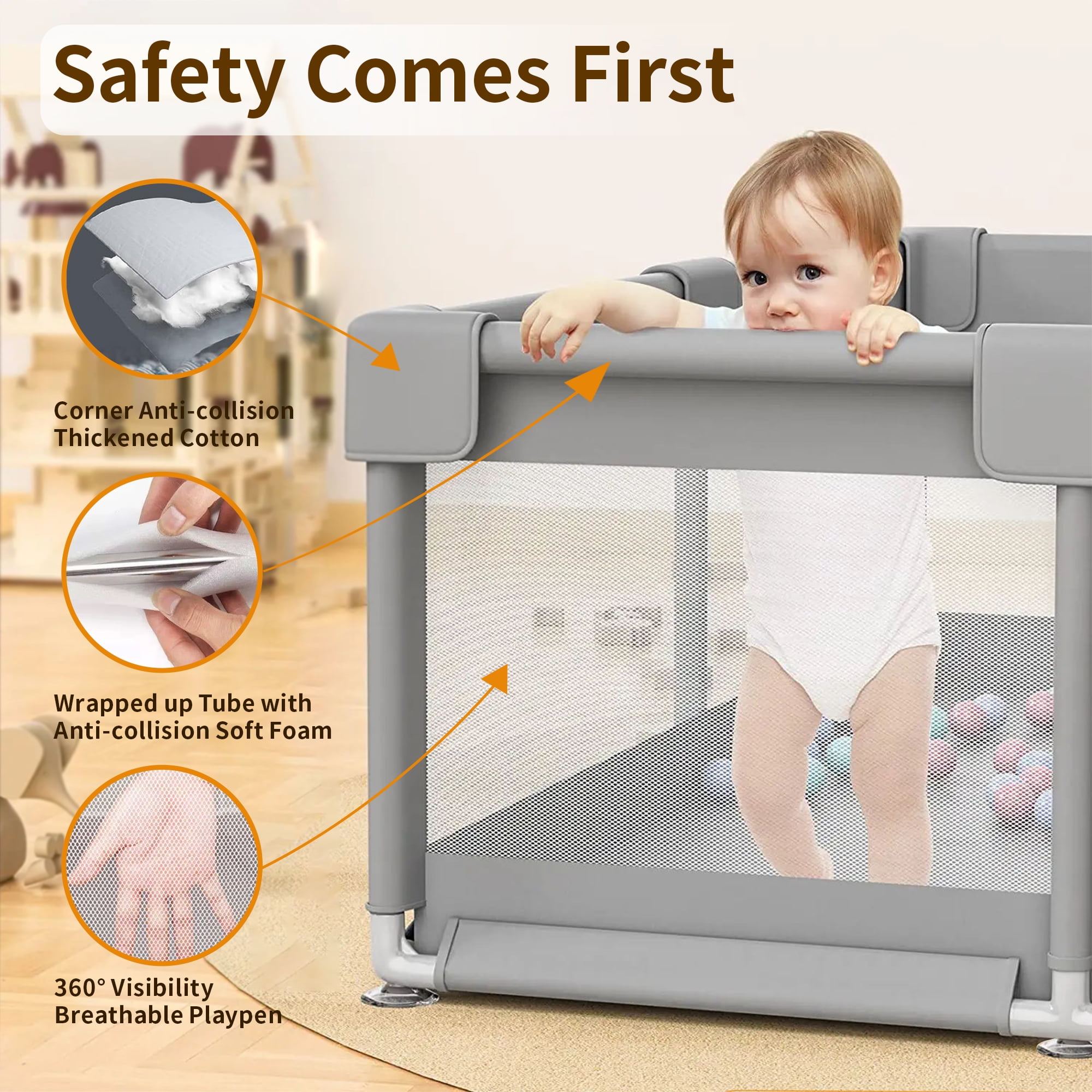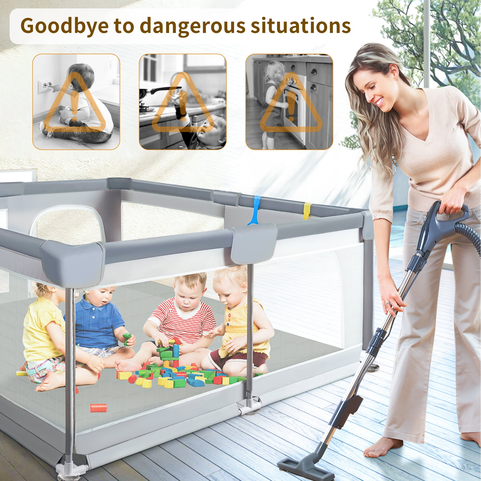 Features: 【Large Baby Playard】 The 48*48*27 inch play yard for unisex is spacious enough for 2 toddlers to play at the same time. Whenever your baby uses this indoor/outdoor play area, they will enjoy immense comfort. The playpen goes with 2 handles and 1 storage bag. The storage bag can put your child’s necessities. 【Safety Play Area】 Baby play fence it is made of oxford fabric. There are 8 sturdy safety non-slip suction cups on the bottom, which are difficult to move or tip over.The bottom is made of non-slip, breathable, quick-drying, fabric. Only need to wipe with wet cloth and soap to clean. 【360° Full Vision Design】The four side walls of the playpen are made of visible and breathable mesh. Children can see their mothers outside the fence from multiple sides no matter sitting or lying down, which will make them feel safe. 【Easy To Assemble & Store】Baby playard use alloy steel pipe and plastic joint connection, easy to assemble and disassemble.It can be removed in minutes (no tools required). With a bag provided, easy to store and carry. (No padding at the bottom, you need to buy an extra baby play mat) 【Parent’s Good Helper】Our baby pens can effectively help children explore the perceived world, play, and learn to move in their own world, keeping them away from being lost or exposed to dangerous areas. Mothers can free their hands to do their own things.Baby Playpen Package Details Baby playpen x 1 Handlers x 2 Storage bag x 1 Carry bag x 1 Suction Cup Three Link x 4 Suction Cup Straight Tree Link x 4 Steel Pipe x 16 Steel Pipe & Foam Film x 8 NOTE: Toy balls and mats are not included