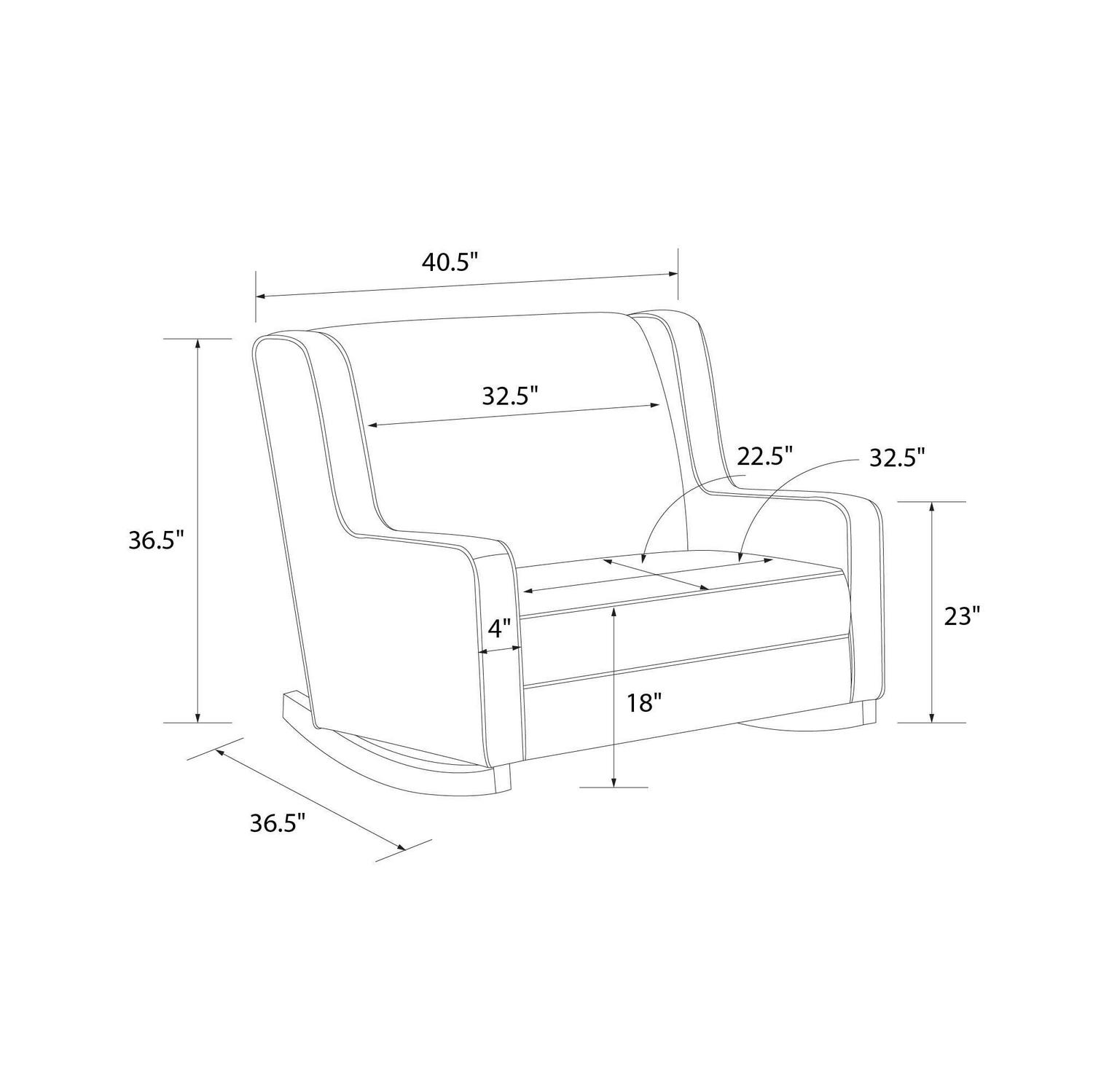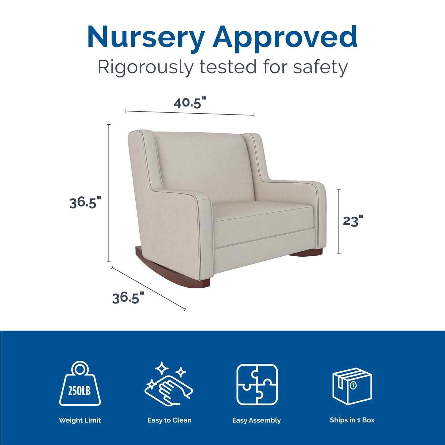 – Rocker dimensions: 40.5″L x 36.5″W x 36.5″H. Weight limit: 250 lbs. Net weight: 70.5 lbs. 1-year limited warranty. Rigorously tested to meet safety standards and flammability requirements. Does not contain flame retardant chemicals. TSCA Certified for formaldehyde