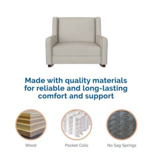 – Able to seat 2, parents will love the chair’s smooth corners, cushioned backrest, padded arms, and extra wide seating with plush foam fill and pocketed coils for creating a comfortable backdrop for nighttime feedings or story time with the kids