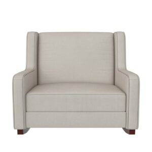 Experience double the comfort with the modern Baby Relax Hadley Double Rocker Chair – the perfect addition to your nursery wish list! This wingback shaped rocking chair is designed to provide a calming environment for both you and your bundle of joy with soothing rhythmic movement that will lull any infant to sleep. Beautifully styled with smooth corners, easy to clean feather soft upholstery that is resilient, and two-tone welting, the Hadley is a living room and bedroom worthy piece. And with its extra wide seating that comfortably seats 2, cushioned backrest, and padded arms, moms and dads will appreciate sitting back on the generously foam filled pocketed coil seat cushion for relaxed nighttime feedings or bonding moments with their kids. Quality made with a sturdy plywood frame, supportive no-sag spring foundation, and felt-lined solid wood rocking legs that stop noisy squeaks and scratches on hardwood floors, it has been meticulously tested for safety and does not contain any harmful flame retardant chemicals. On a high note, you can put it together in 30 minutes or less!