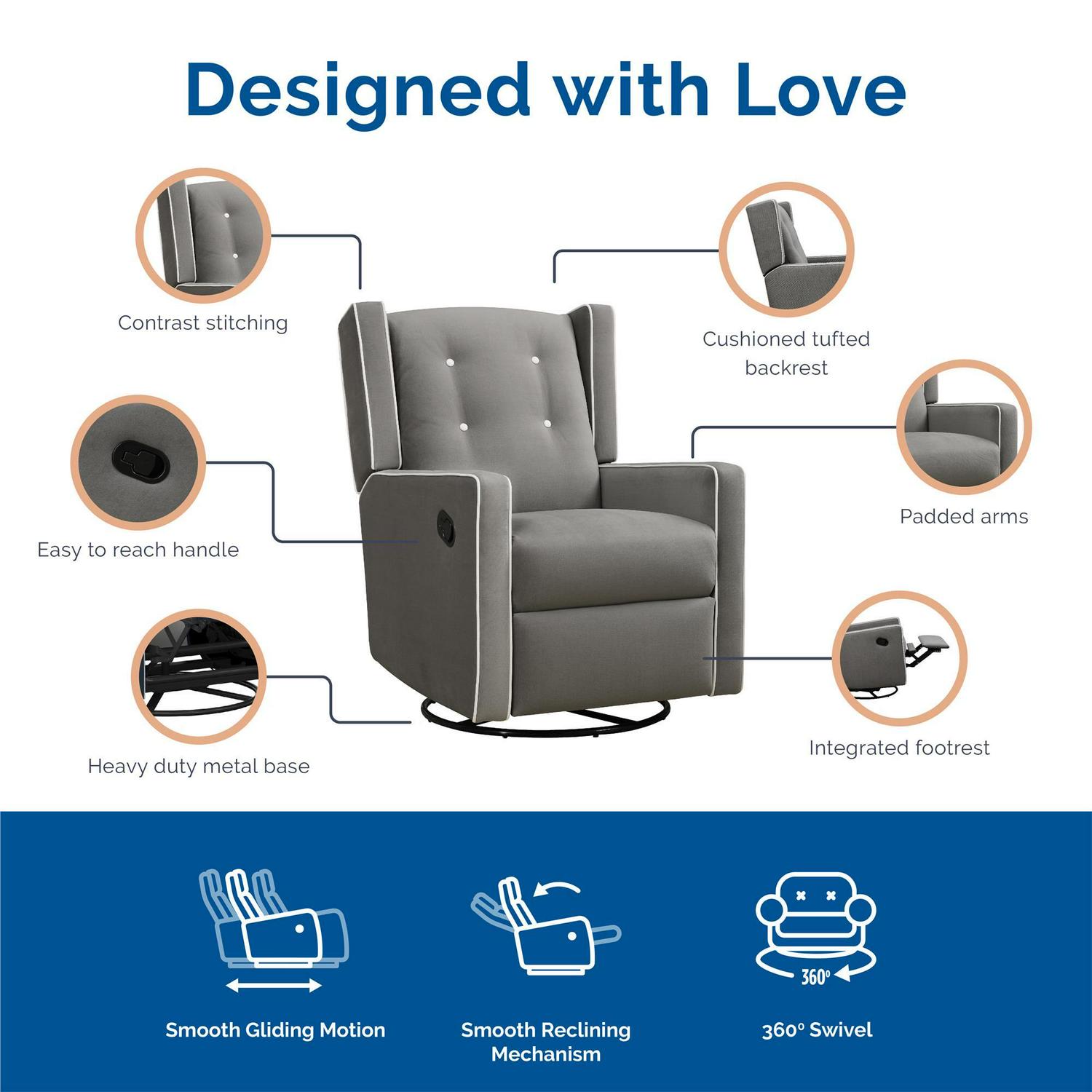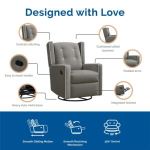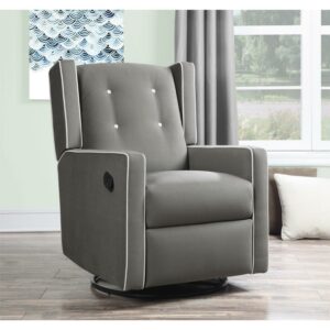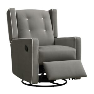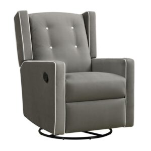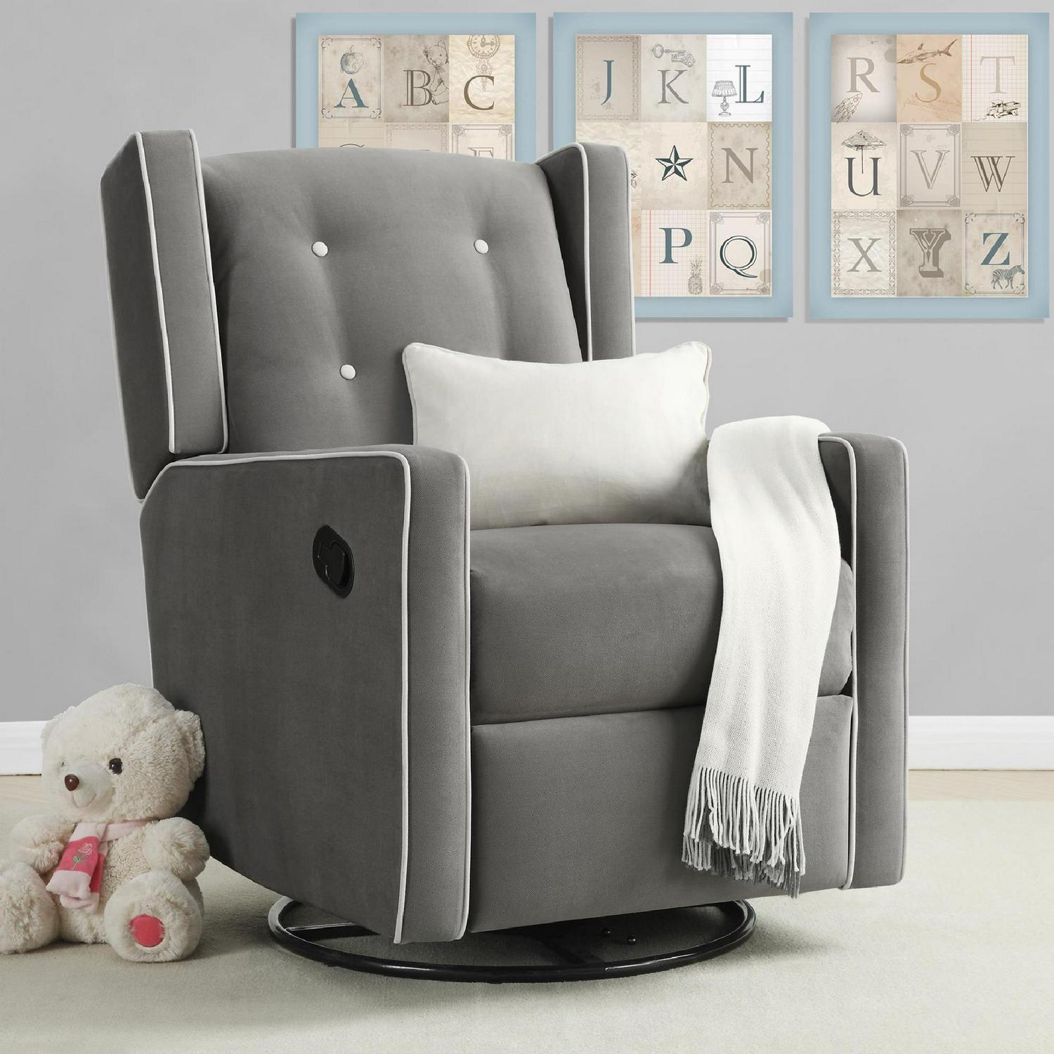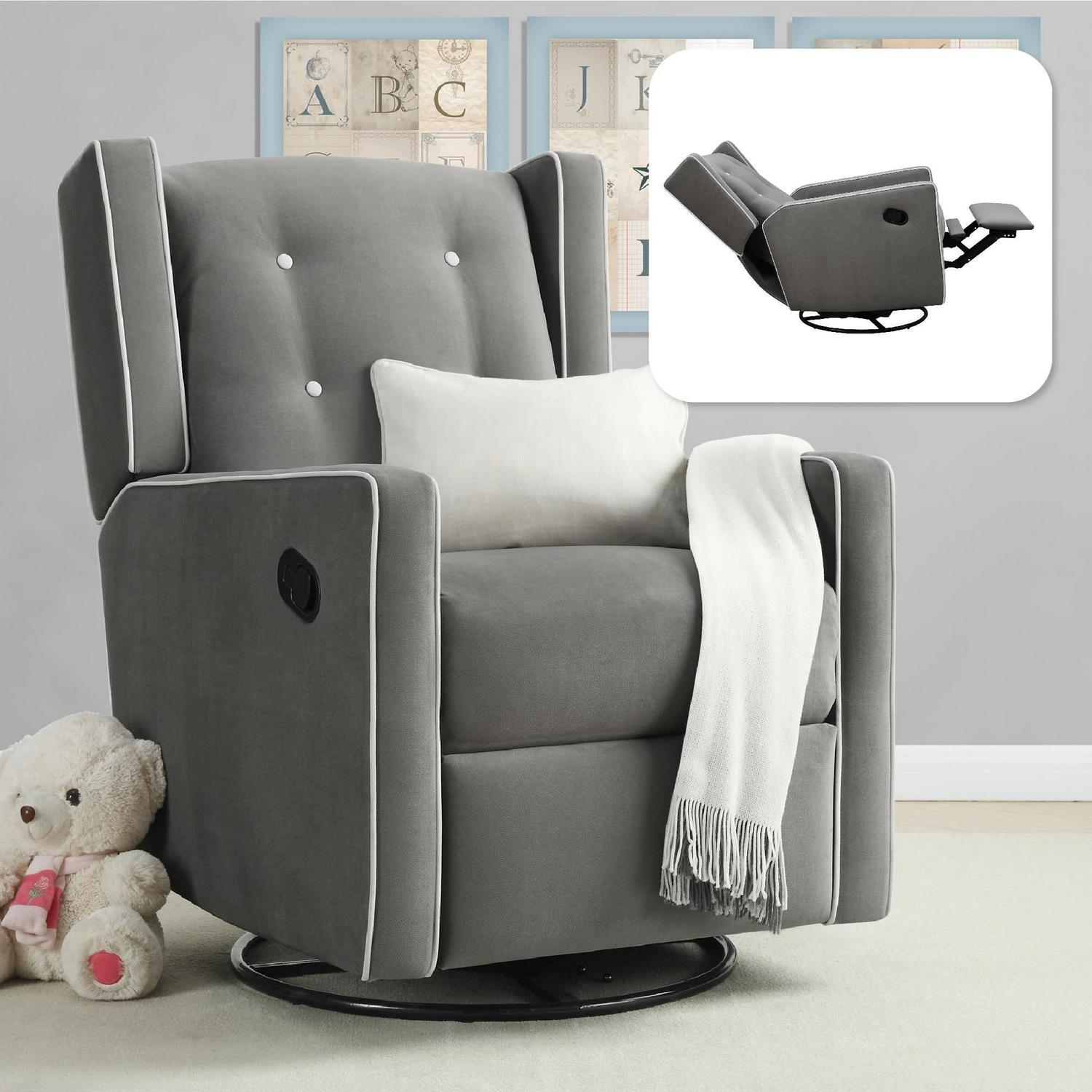 – Softly upholstered with contrast button tufting, this modern wingback 4-in-1 swivel glider rocker recliner brings the charm factor to any nursery with relaxing rocking, gliding, reclining, and 360-degree swivel chair activity to help infants sleep