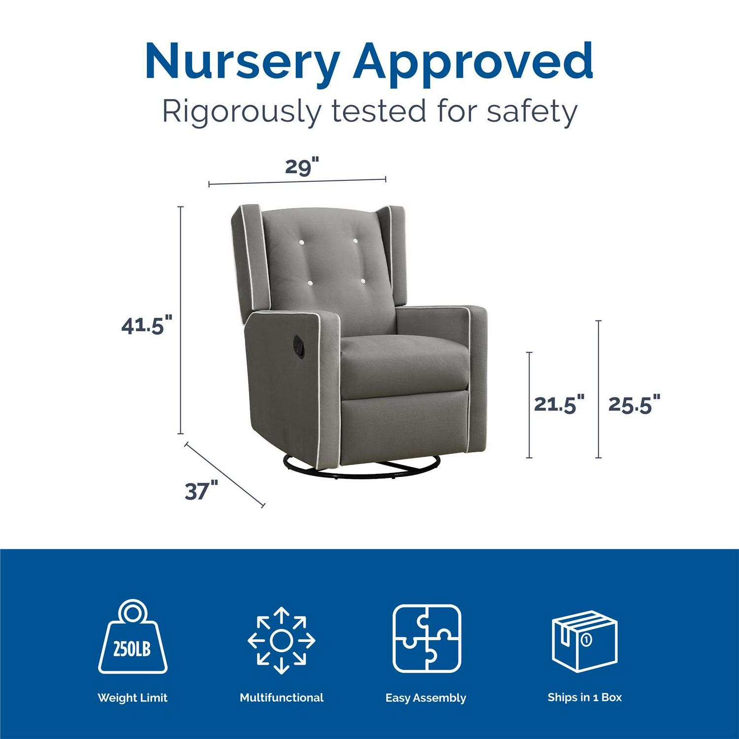 Say goodbye to uncomfortable nursery seating and hello to immense comfort with our 4-in-1 Baby Relax Mikayla Swivel Glider Rocker Recliner. With the ability to easily switch between rhythmic rocking, gliding, reclining, and 360-degree swivel chair stations, you can find the perfect stance to help soothe your infant to sleep. Designed with a classic wingback silhouette that shows off contrasting two tone welt trim and button tufting, you can prop this modern beaut anywhere from the living room to the bedroom. Our parent friendly features, including easy care upholstery, a high cushioned backrest, padded track armrests, and a plush pocketed coil foam filled seat, provide unmatched relief, while the outside arm handle allows fast pushback recline positioning and lift up footrest access for effortless relaxation. The Mikayla’s sturdy construction, complete with a strong plywood frame, no-sag spring foundation, steel recline mechanism, and heavy-duty metal base, is durably supportive. Meticulously tested to meet safety guidelines, it’s made without the use of flame retardant chemicals. Best of all, spare only 15 minutes for assembly, that’s all you need!