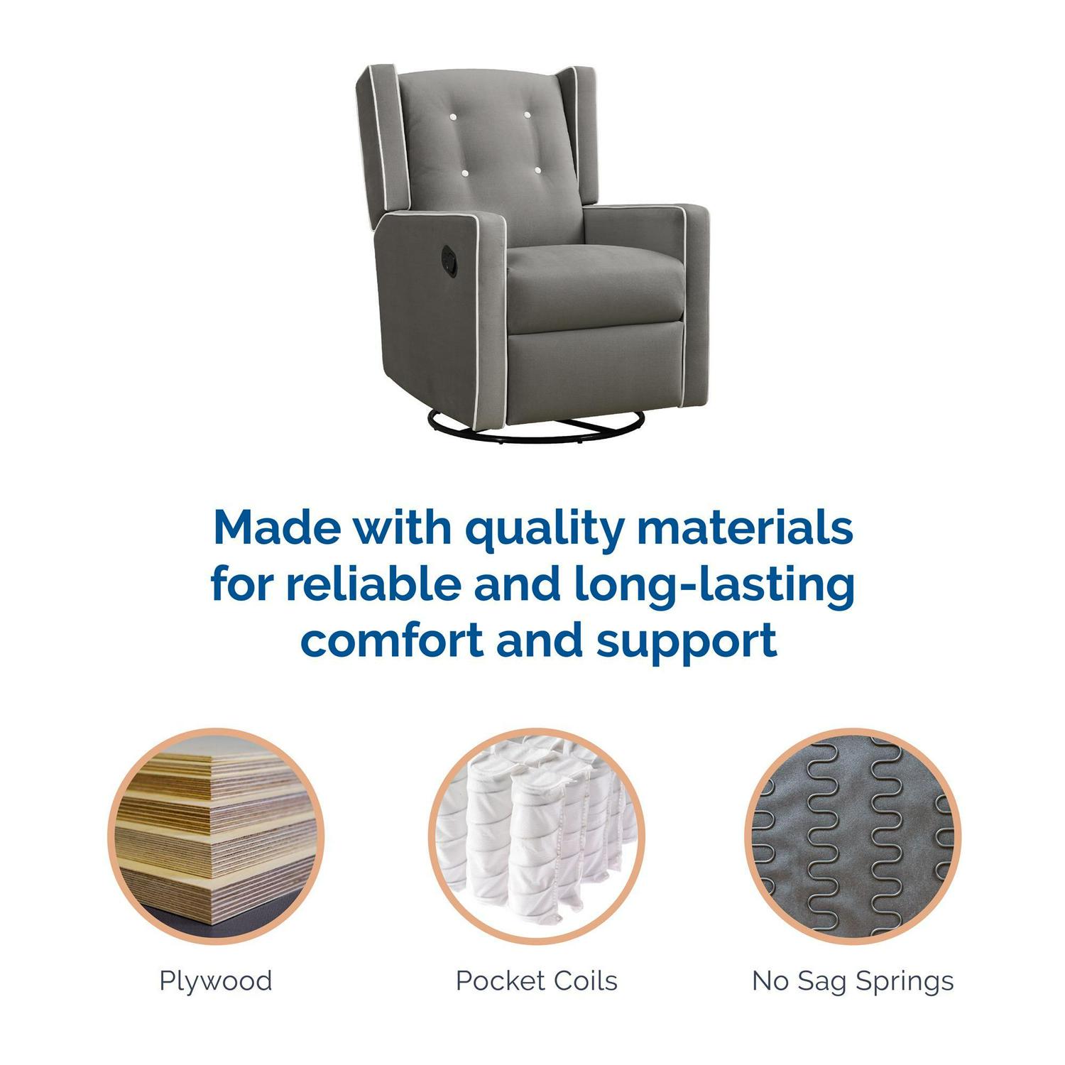 – Styled for every baby room and kids space, living room, or bedroom, our durable chair construction employs a sturdy plywood frame, no-sag spring foundation, steel recline mechanism, and heavy-duty metal base for infinite support