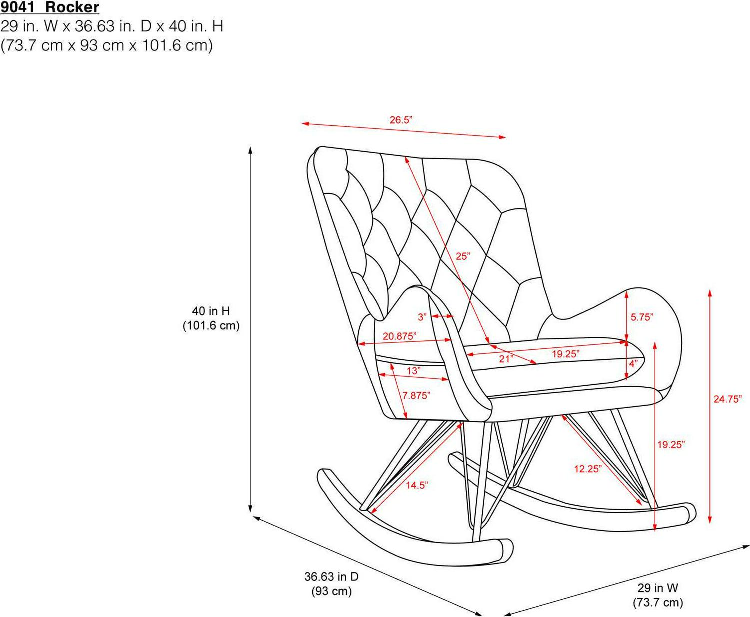 – Assembled Chair dimensions: 29″W x 36.63″D x 40″H. Shipping dimensions: 28″W x 31.5″D x 29.63″H. Weight Limit: 225 lb.
