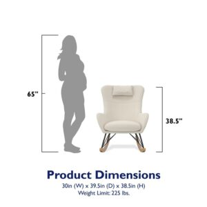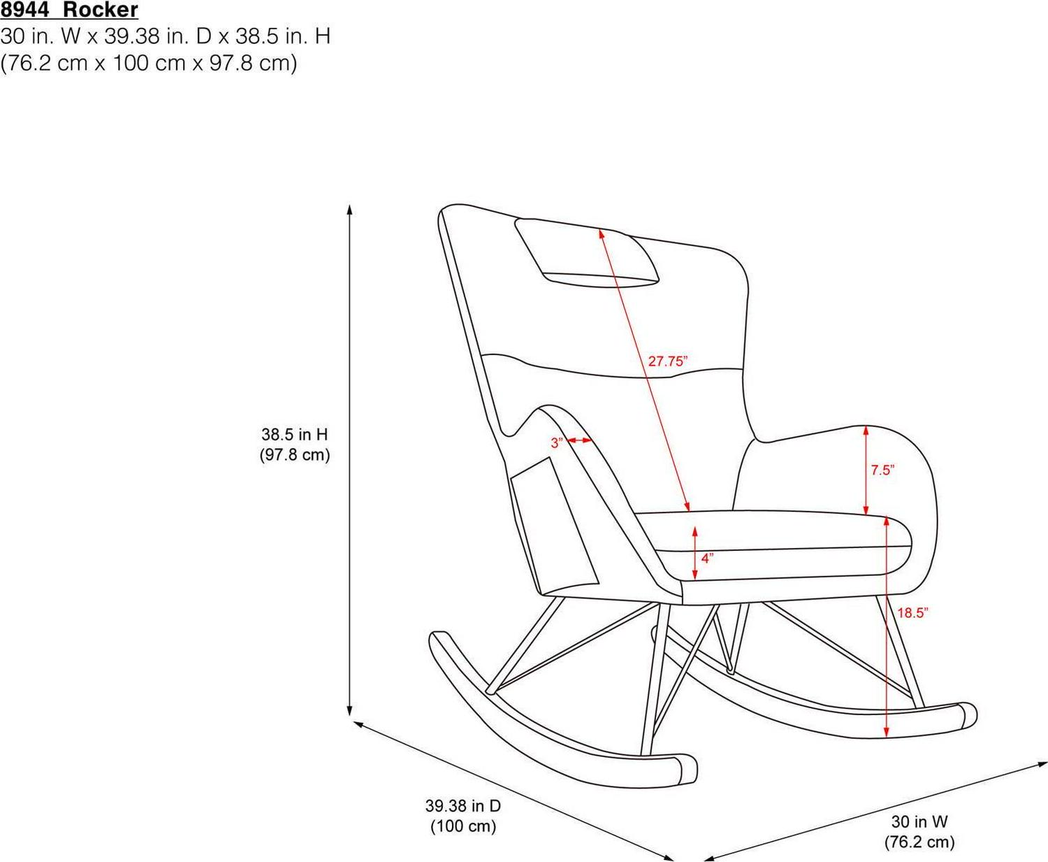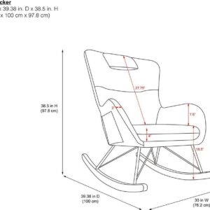 – Rocker dimensions: 39.5″L x 30″W x 38.5″H. Weight limit: 250 lbs. Net weight: 26.5 lbs. 1-year limited warranty. Rigorously tested to meet safety standards and flammability requirements. Does not contain flame retardant chemicals. TSCA Certified for formaldehyde