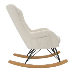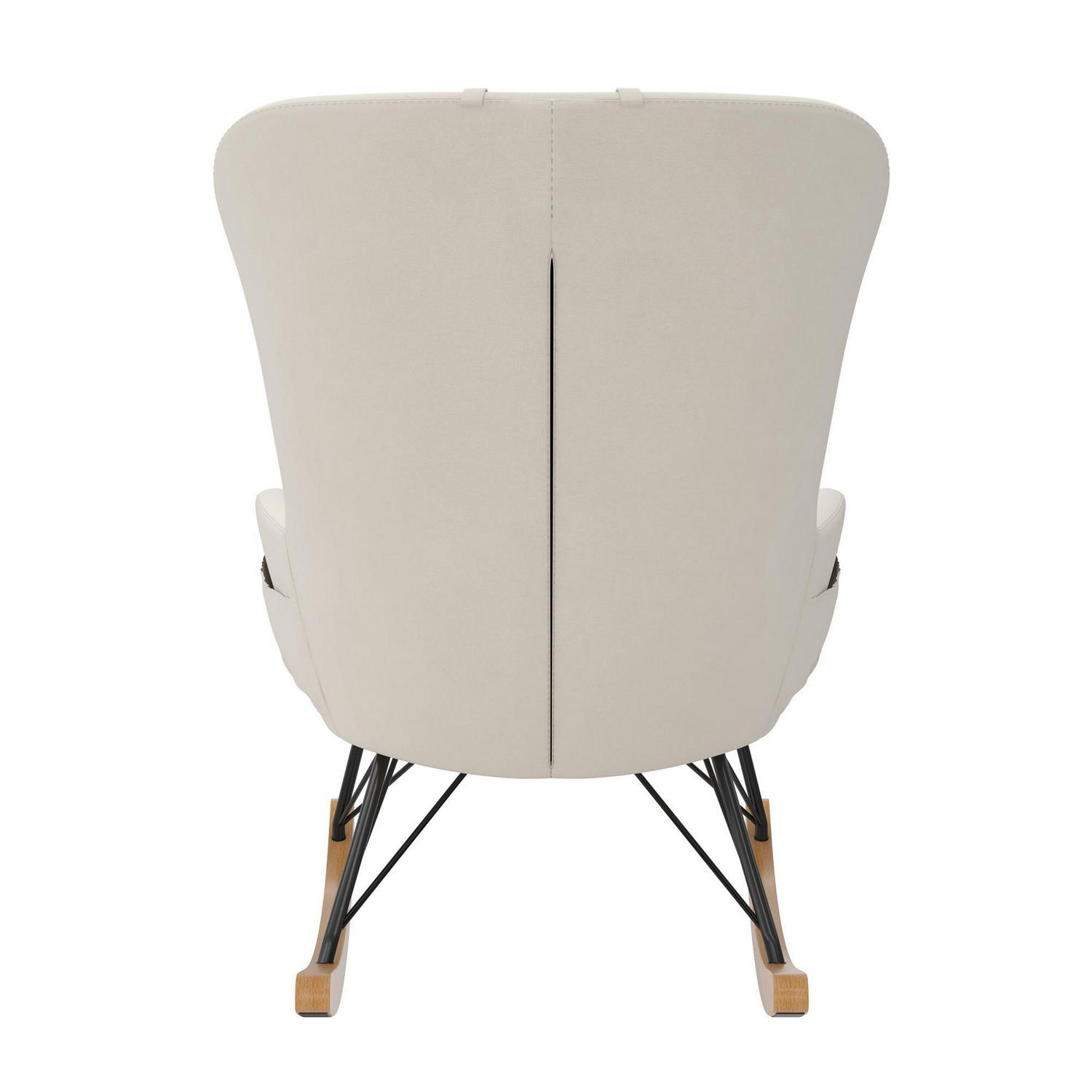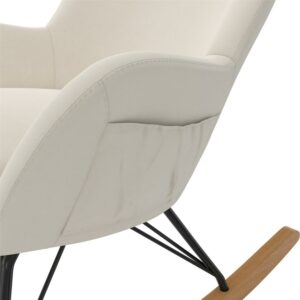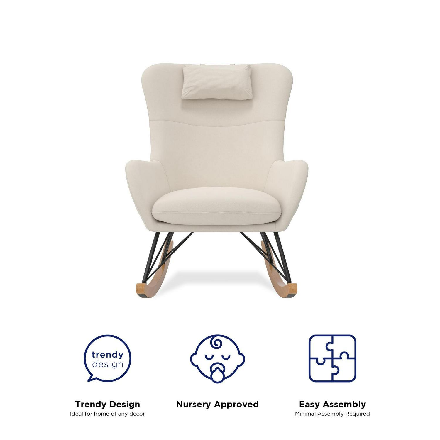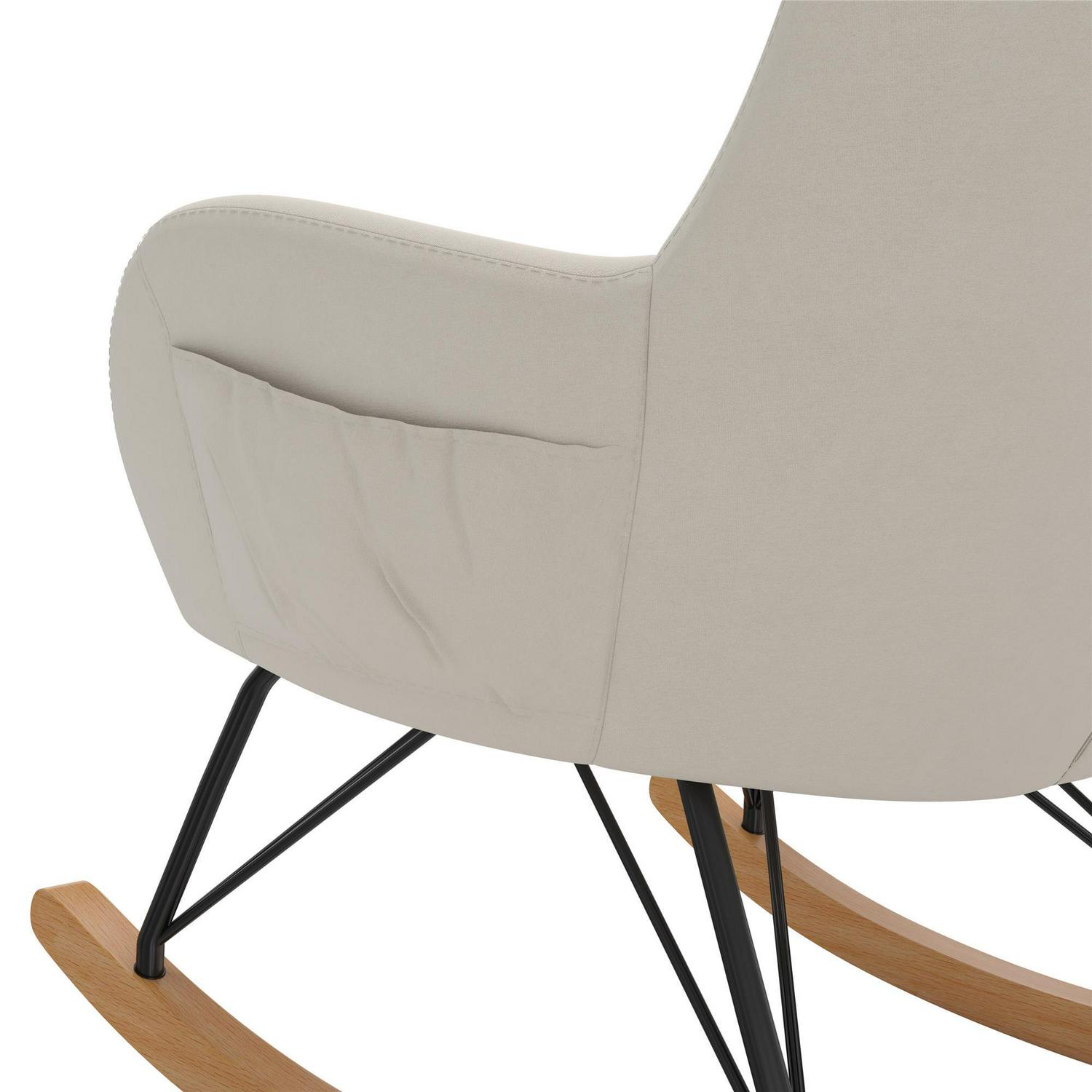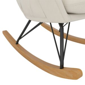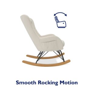 – Lightweight with soft upholstery fitting any living room or bedroom décor, the rocker is crafted with a strong metal frame, black steel rod legs, and a felt-lined solid beech wood rocking base that maintains noise-free motion and scratch-free floors
