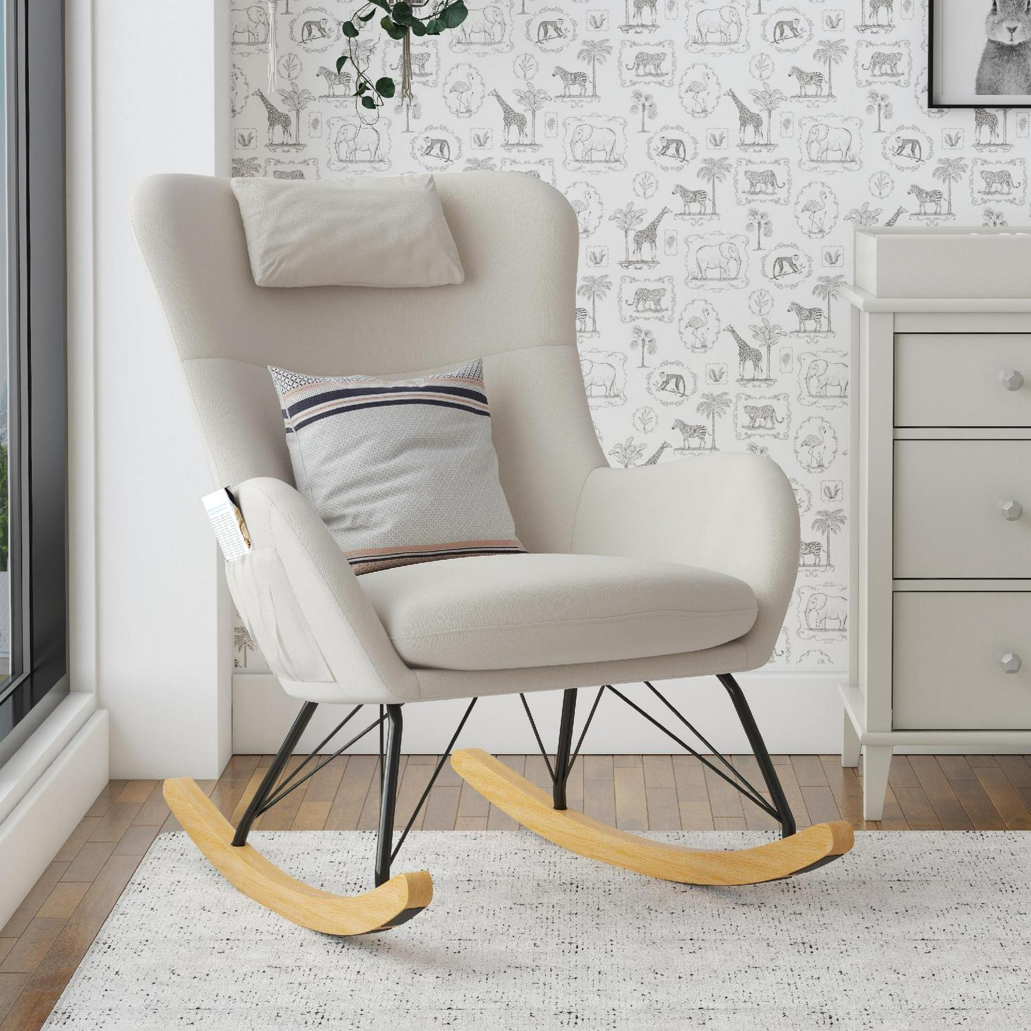 – Every baby needs a rocking chair, and every baby room needs modern nursery style in the form of this soothing Scandinavian inspired rocker that features 2 side storage pockets for kids toys, bottles, and books and a detachable headrest pillow