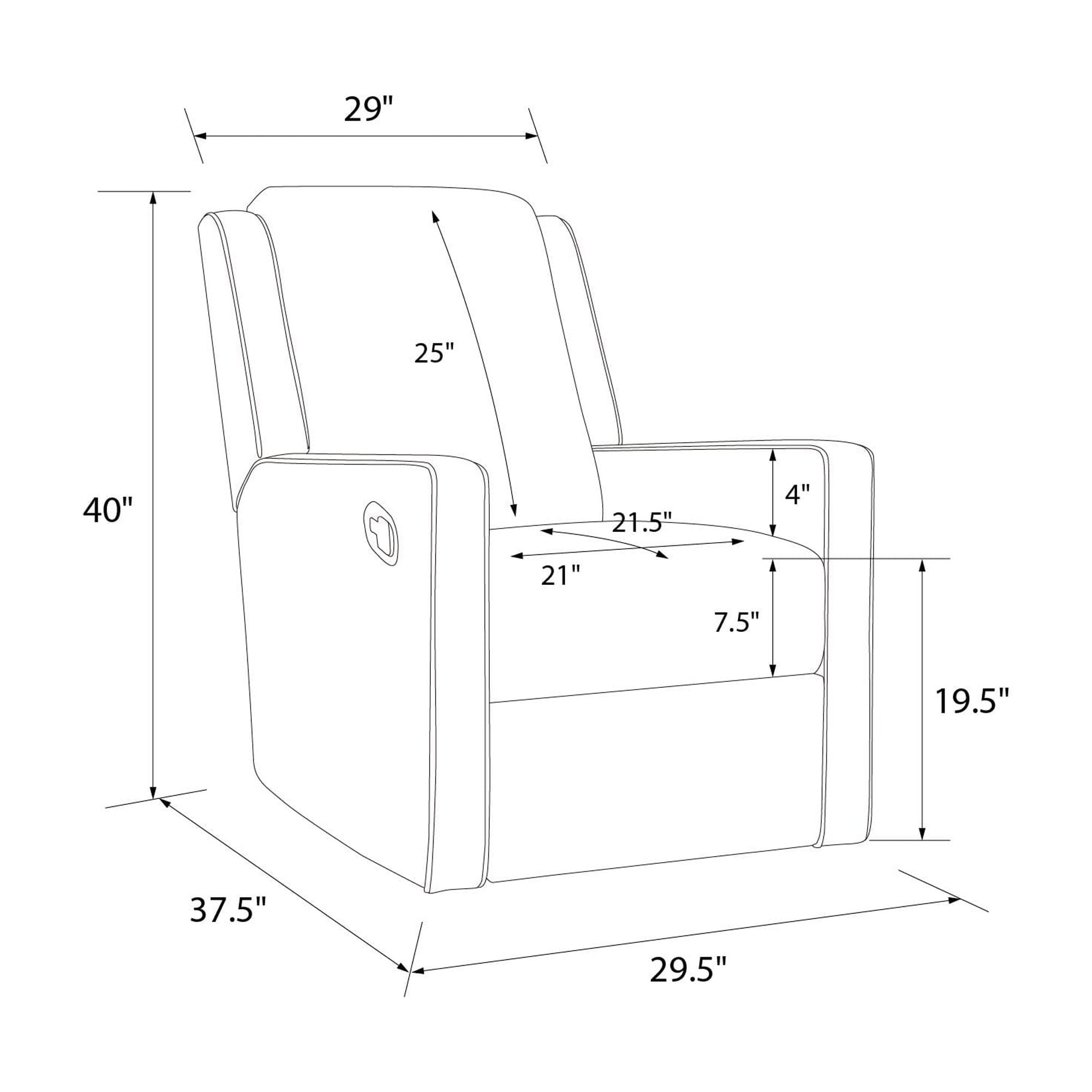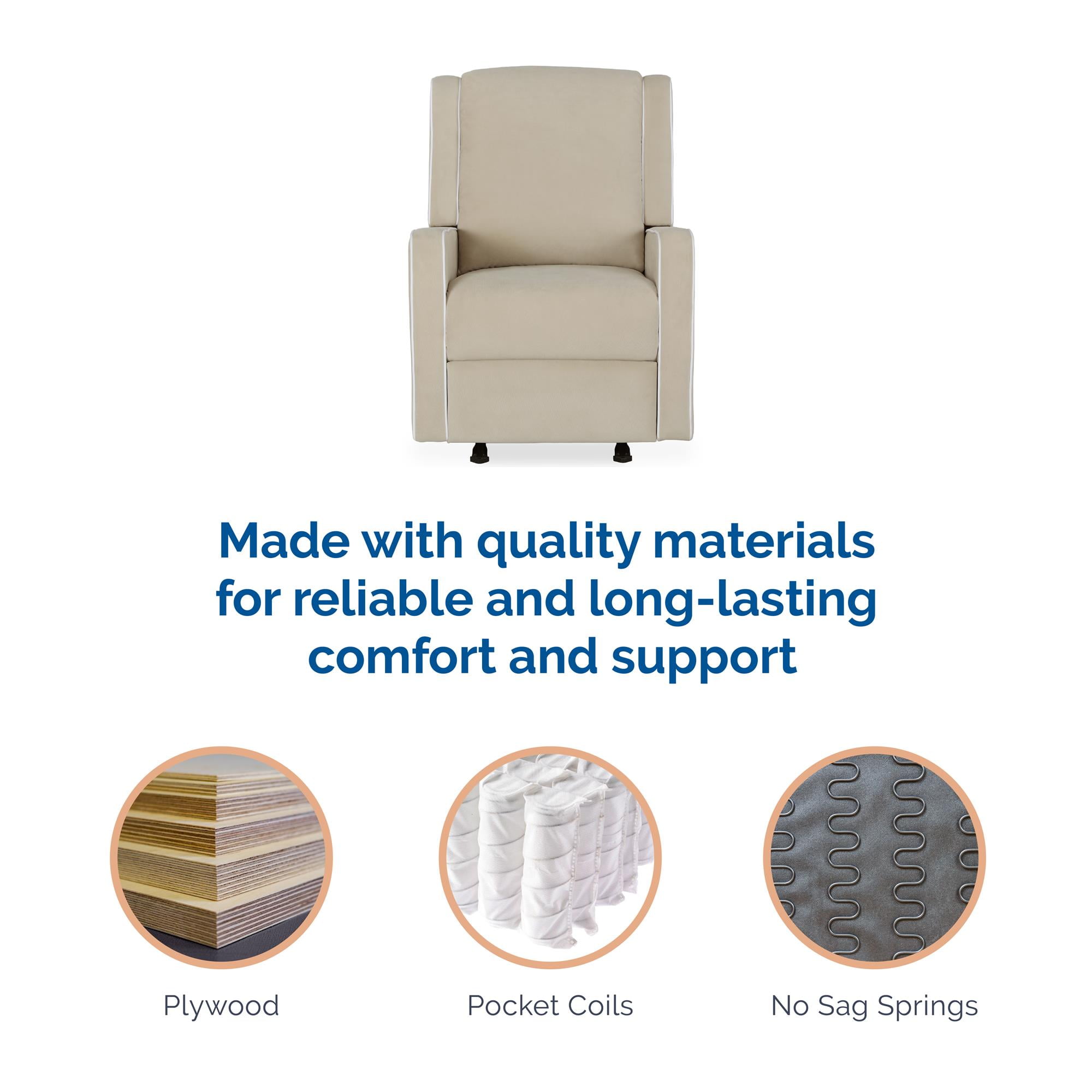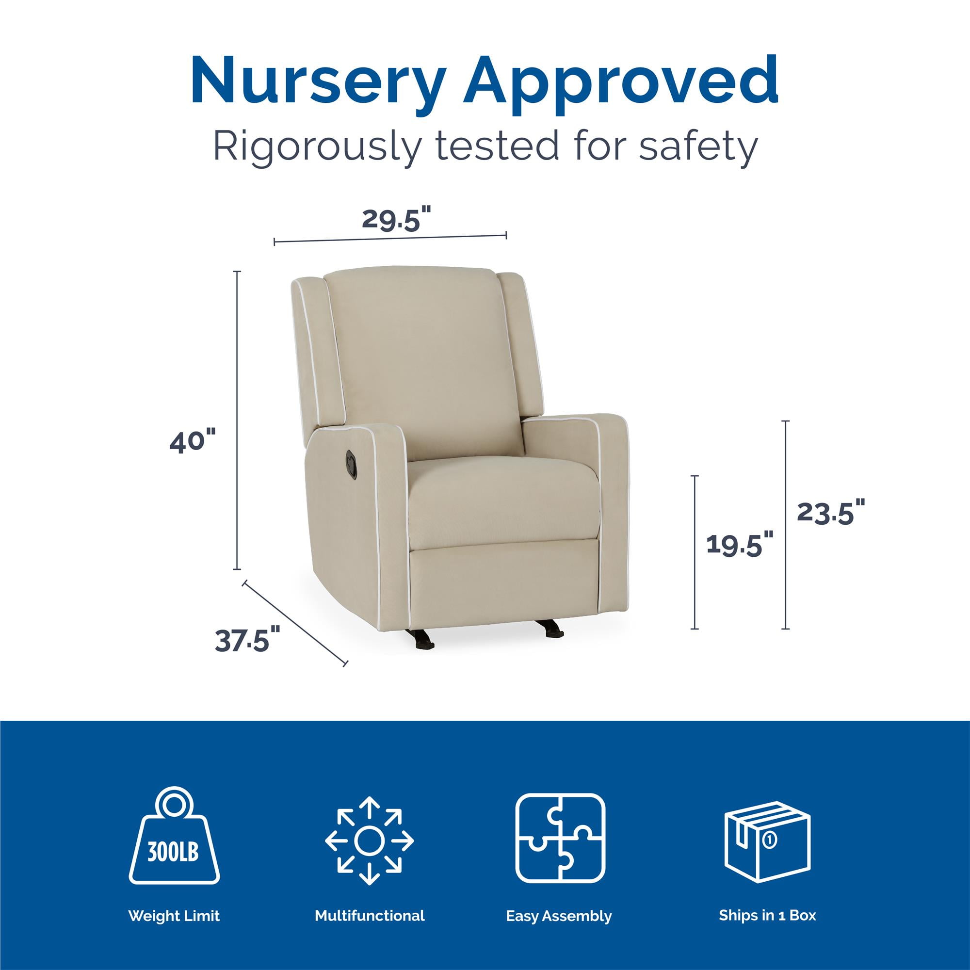 This two-tone 2-in-1 rocker recliner with graceful corners triples your nursery design superpowers for endless modern style with smooth reclining and rocking chair action that will put every infant in a calm and sleepy mood for quiet bonding timeMade for moms and dads who need multi-position comfort for feedings, its plush cushioned backrest, padded track arms, and pocketed coil foam seat deliver pure rest and its easy to reach handle lifts the footrest for a cozy pushback reclineStyled with ultra-soft upholstery suited for any baby room and kids space, living room, or bedroom, this versatile chair is solidly built with a plywood frame, no-sag spring foundation, steel recline mechanism, and metal base for premium supportShips in one easy to handle box with all parts, tools, and instructions included for rapid and minimal assembly in under 15 minutes. Easy to clean 100% polyester linen look fabric is resilient and wipes free of spills and stains with a damp clothRecliner dimensions: 29.5″L x 37.5″W x 40″H. Weight limit: 300 lbs. Net weight: 83.5 lbs. 1-year limited warranty. Rigorously tested to meet safety standards and flammability requirements. Does not contain flame retardant chemicals. TSCA Certified for formaldehydeCoordinate with our classic Baby Relax Adele 3-in-1 Convertible Crib for a harmonious nursery look (crib sold separately)Specifications