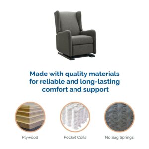 Our contemporary 3-in-1 nursery Baby Relax Rylee Glider Rocker Recliner is more than just a pretty face! With flexible rocking, reclining, and gliding chair mobility that brings your baby to sleep, you can enjoy peaceful moments with your child anytime, anywhere. Featuring a classic wingback shaped serpentine arm design, smooth corners, and low maintenance upholstery befitting any living room or bedroom decor, its cushioned tall backrest, sloped padded armrests, and thick pocketed coil foam-filled seat provide an unrivaled level of comfort and support to parents and their infants. Plus, a hidden lever located between the inside arm and seat allows easy pushback recline access and lift up footrest functionality for multi-position relaxation. Constructed with a robust plywood frame, no-sag spring foundation, steel metal recline mechanism, and espresso finish solid wood base for reliable use and durability for years to come, you can have peace of mind that our thoroughly tested chair was made with no flame retardant chemicals to meet high safety standards. Set aside only 30 minutes for assembly and spend the rest of your time with your precious kids.